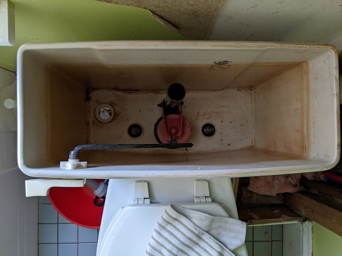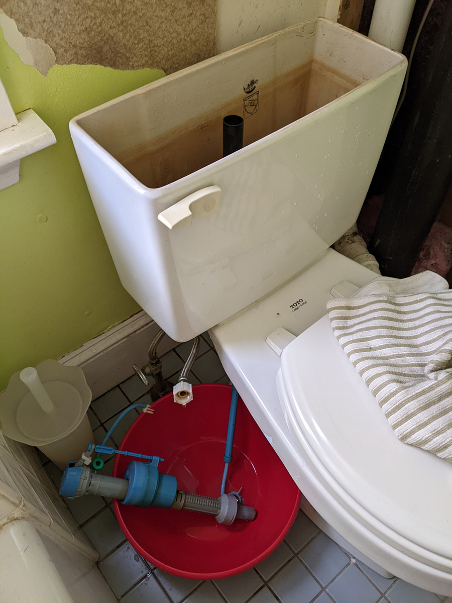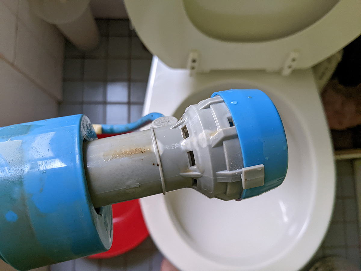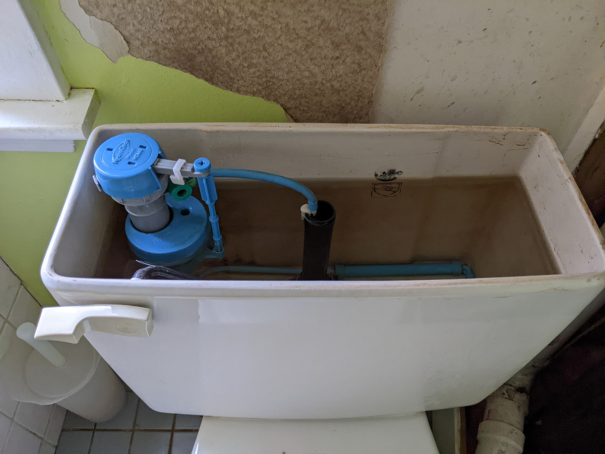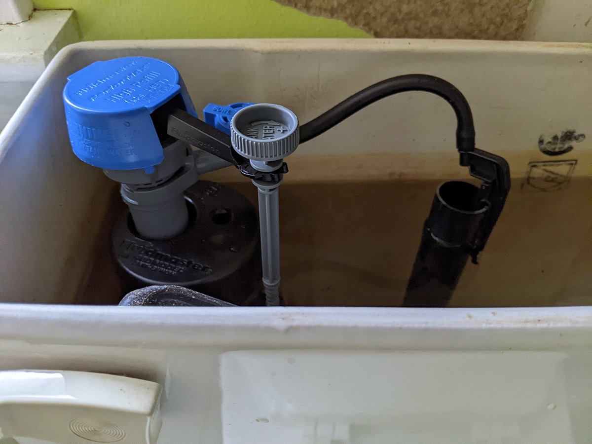 i returned the car to the cafe and biked the rest of the way home. when i got back i started repairing the toilet. after closing the water supply and flushing the tank, i sopped up the remaining water in the tank with a sponge to get totally dry before releasing the supply line from the tank. i then unscrewed the old fill valve. there was a visible line in the plastic where the crack had formed. how it happened i'm not sure, seems like a material failure issue. then it was just a simple matter of installing the new fill valve. i had to trim the refill tube because it was too long, but otherwise everything worked flawlessly. toilet bowl filled to the correct, and the water line in the tank was about an inch below the overflow tube.