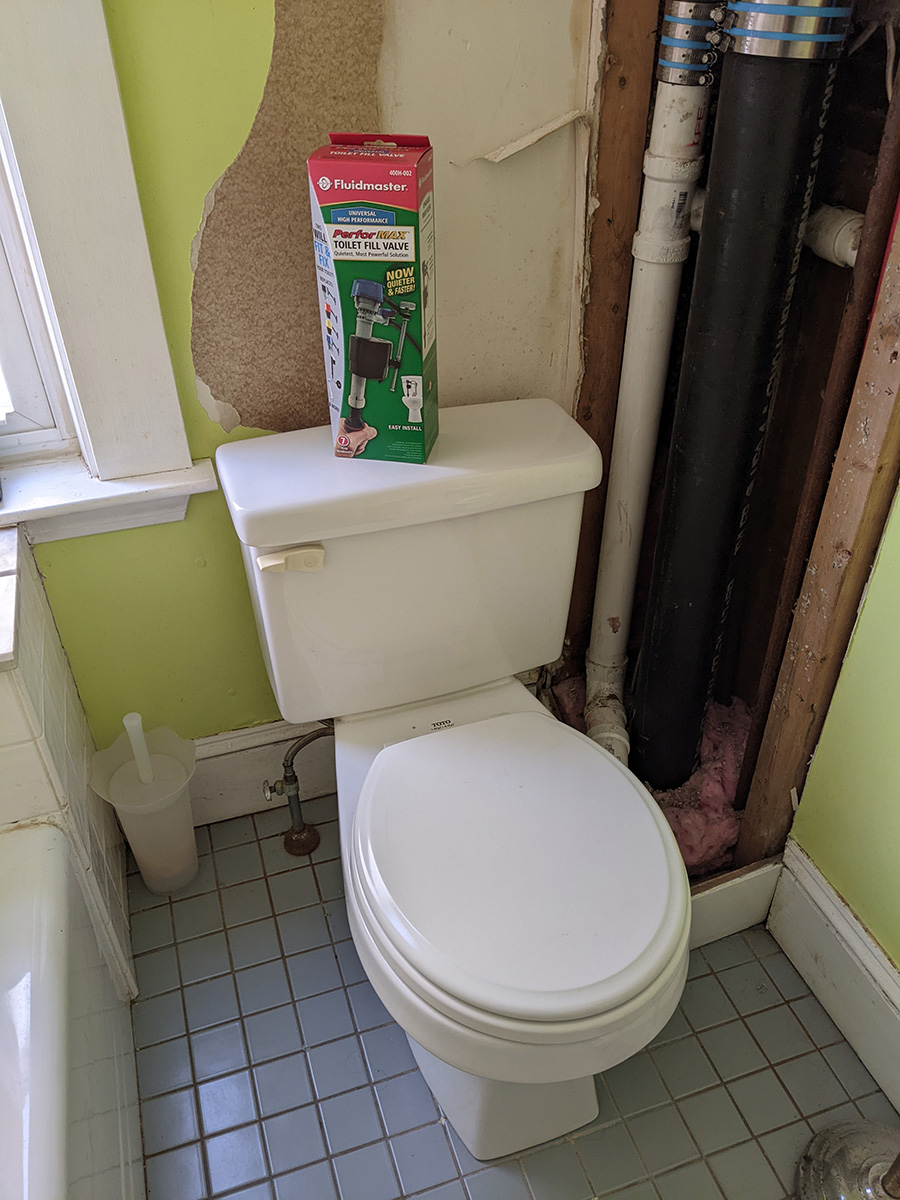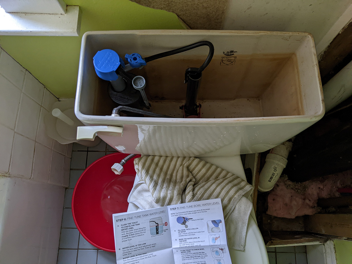 when i woke up this morning i flushed the toilet again to see what would happen. it filled the tank to the top of the overflow tube. this meant i needed to get a new toilet fill valve. luckily i replaced a few, so it wasn't a big deal.