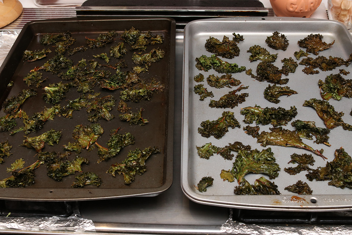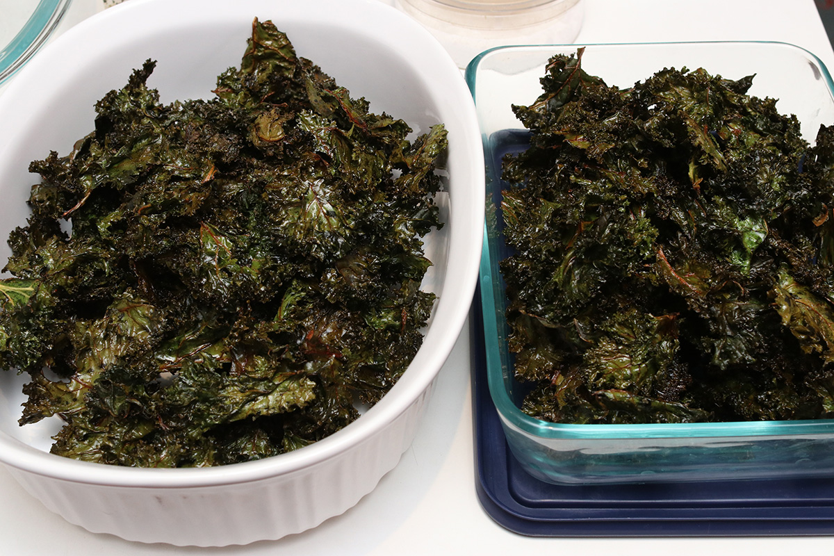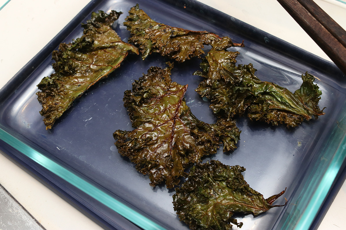 i made kale chips with the kale i bought last week. kale's pretty tough and it seemed like they were in good shape, but when i started to peel the leaves off, there was a large patch of mold in the center of the kale bundle. in all my times working with kale i'd never seen that before. i did two batches again, so i wouldn't crowd the baking pans. once again, i added way too much salt, and way too much olive oil. next time: just a tsp of olive oil, and just a tsp of salt.