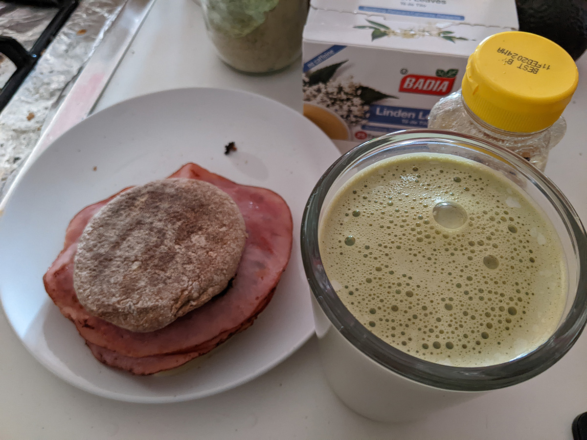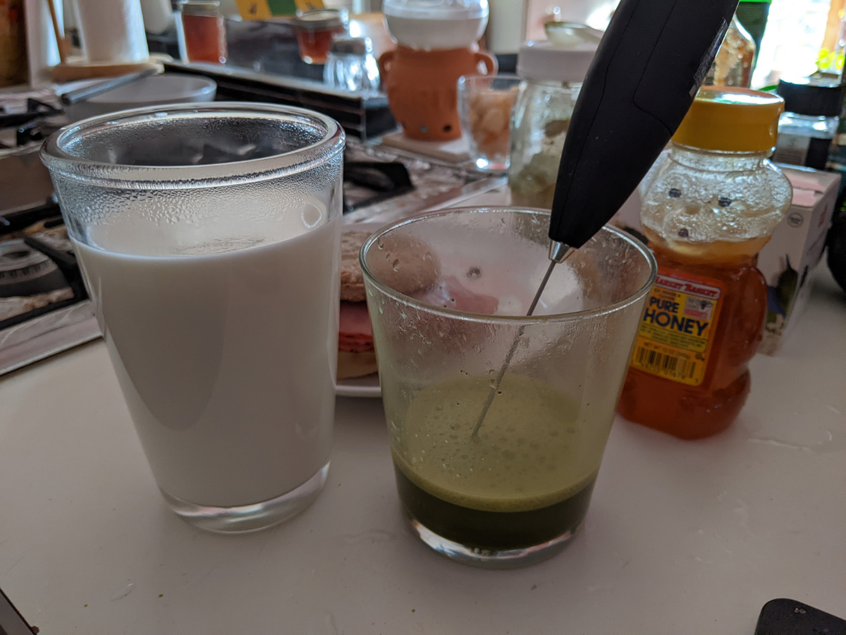 only then - approaching 2pm - did i make lunch. i had another english muffin sandwich, this time i grilled the slices of virginia ham because they were starting to go bad and i wanted to "cook the germs." i made a matcha latte, using the technique where i first dissolved a tsp of matcha powder with some hot water using the frother. i also added a tsp of honey. i heated up a glass of milk in the microwave (1-1/2 minutes) then poured the matcha mixture into the warm milk. i then used the frother to mix everything up. the resulting matcha latte was perfection: frothy, with the matcha powder completely dissolved, and a much stronger matcha taste compared to the way i did it before.