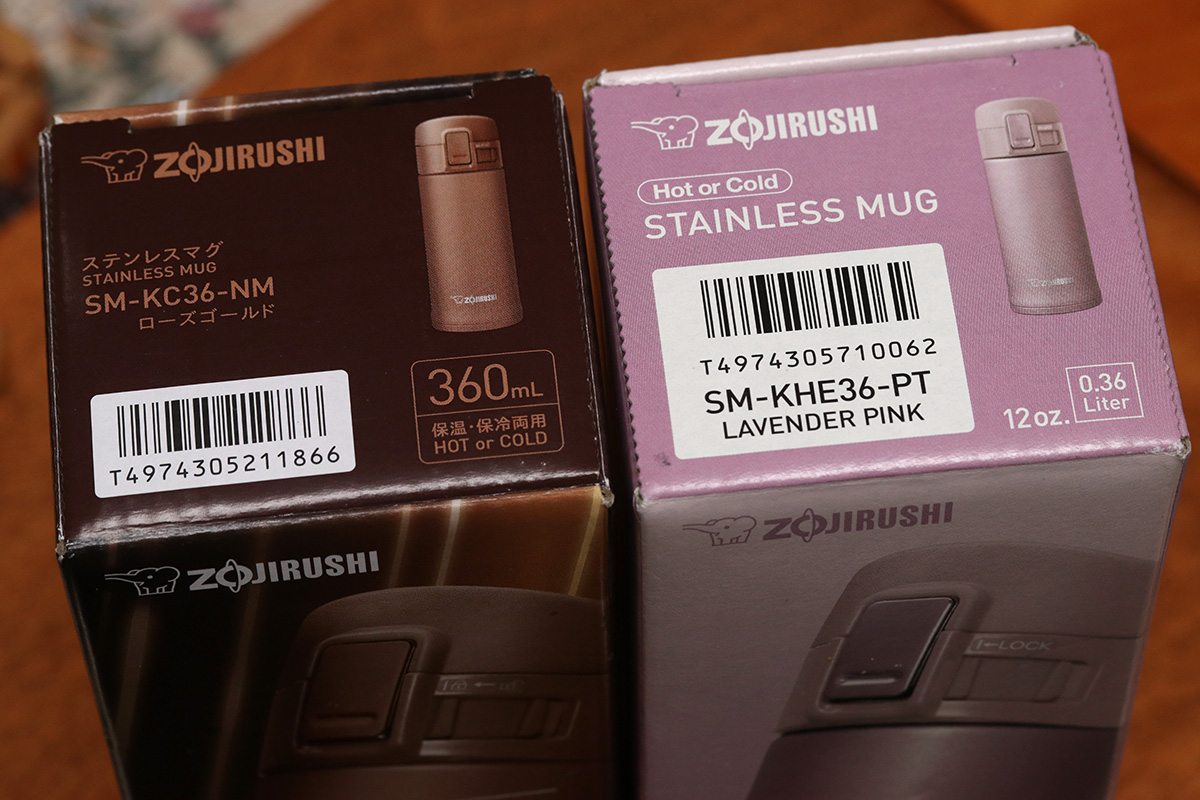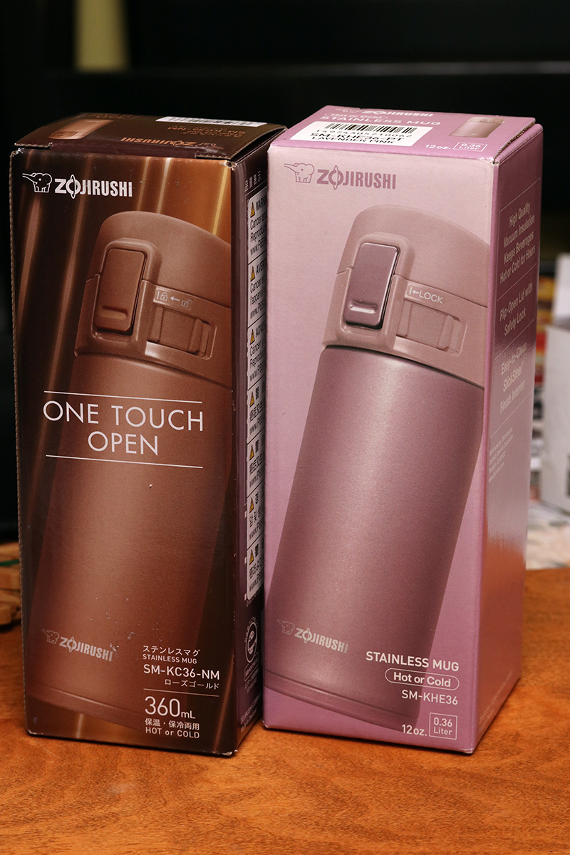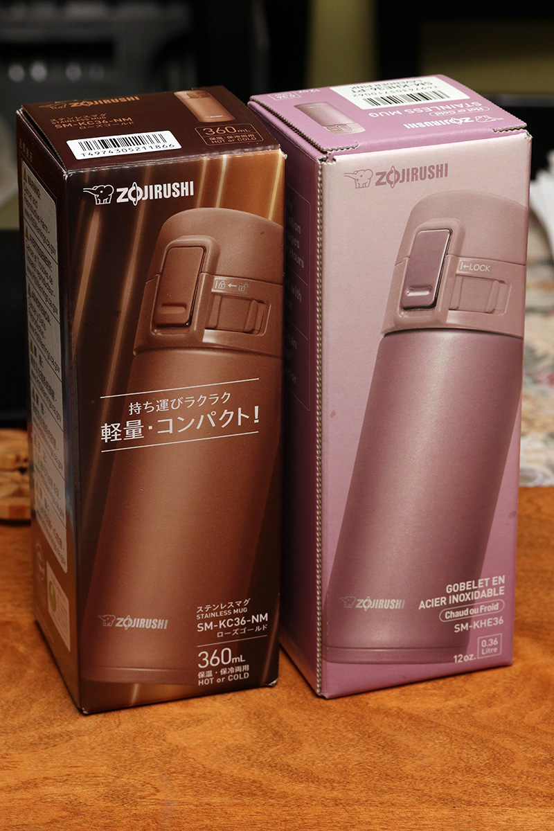 my mother bought a 12 oz. zojirushi insulated mug for my 2nd aunt's birthday, which is chinese new year. it's in rose gold, which looks more like bronze, compared to my mother's lavender pink. they're both nearly identical, except the one for my 2nd aunt came in a box that only had japanese writing on it, so it's obviously a japanese import.