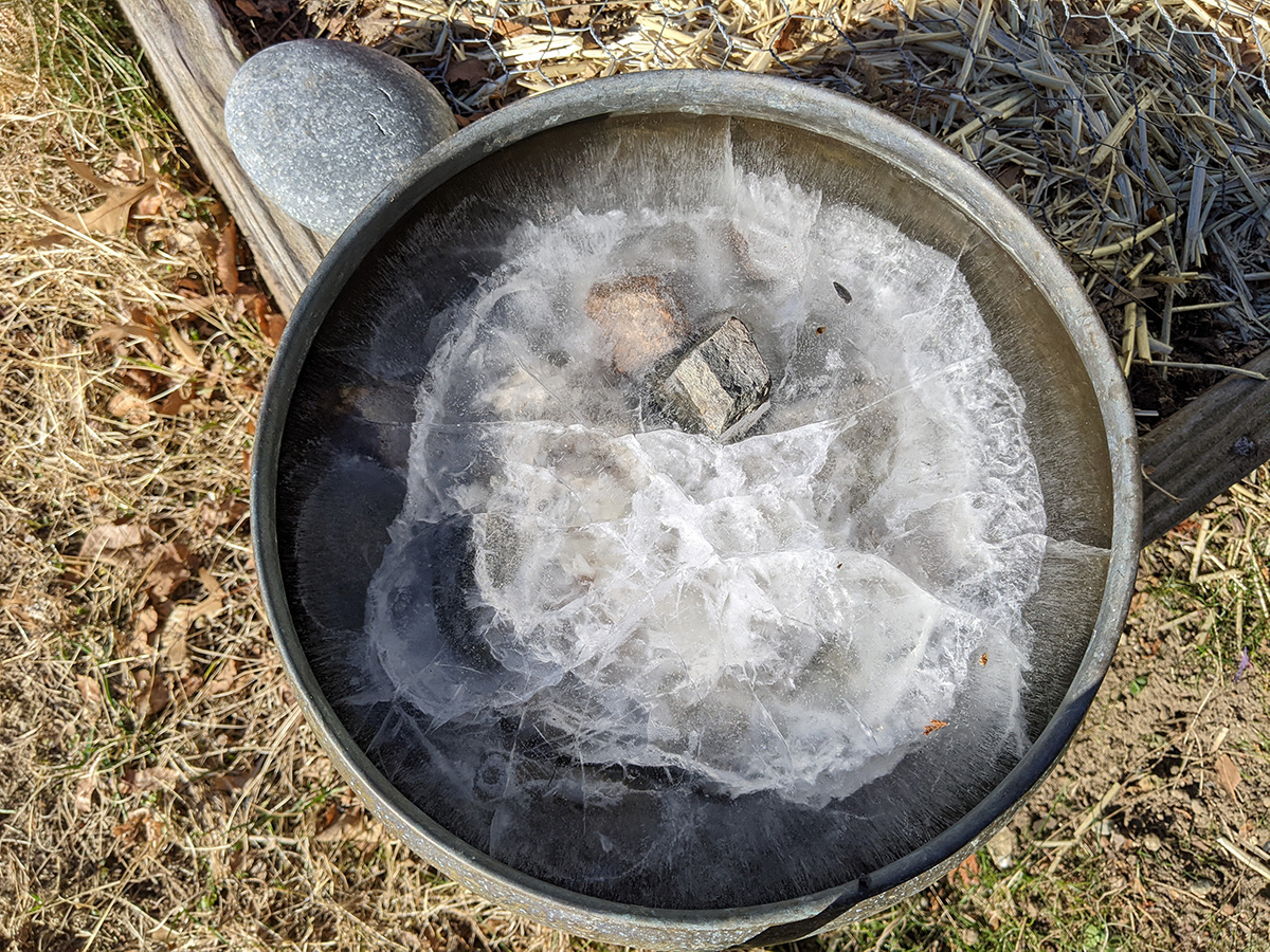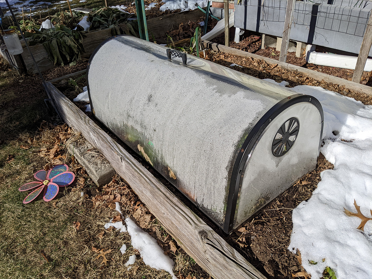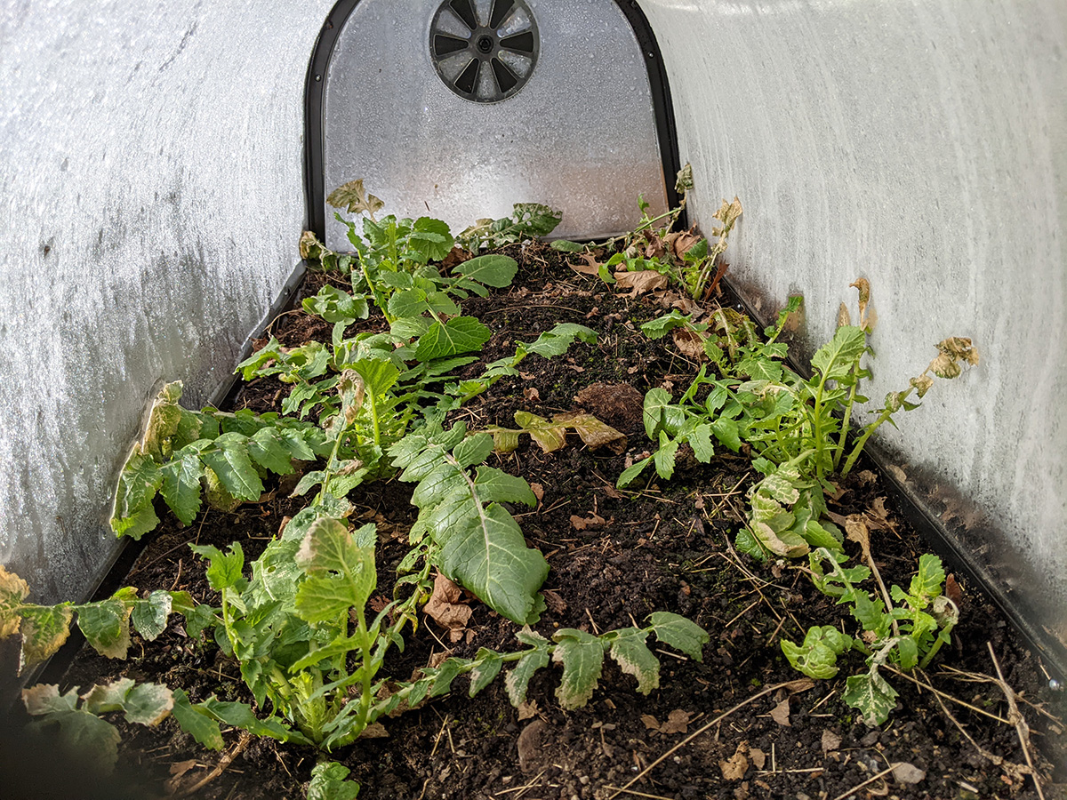 everything was frozen solid outside. condensation on the inside wall of the row cover had turned to ice. the radishes growing inside looked a bit ragged but still seemed alive, although any leaves touching the walls have all wilted.