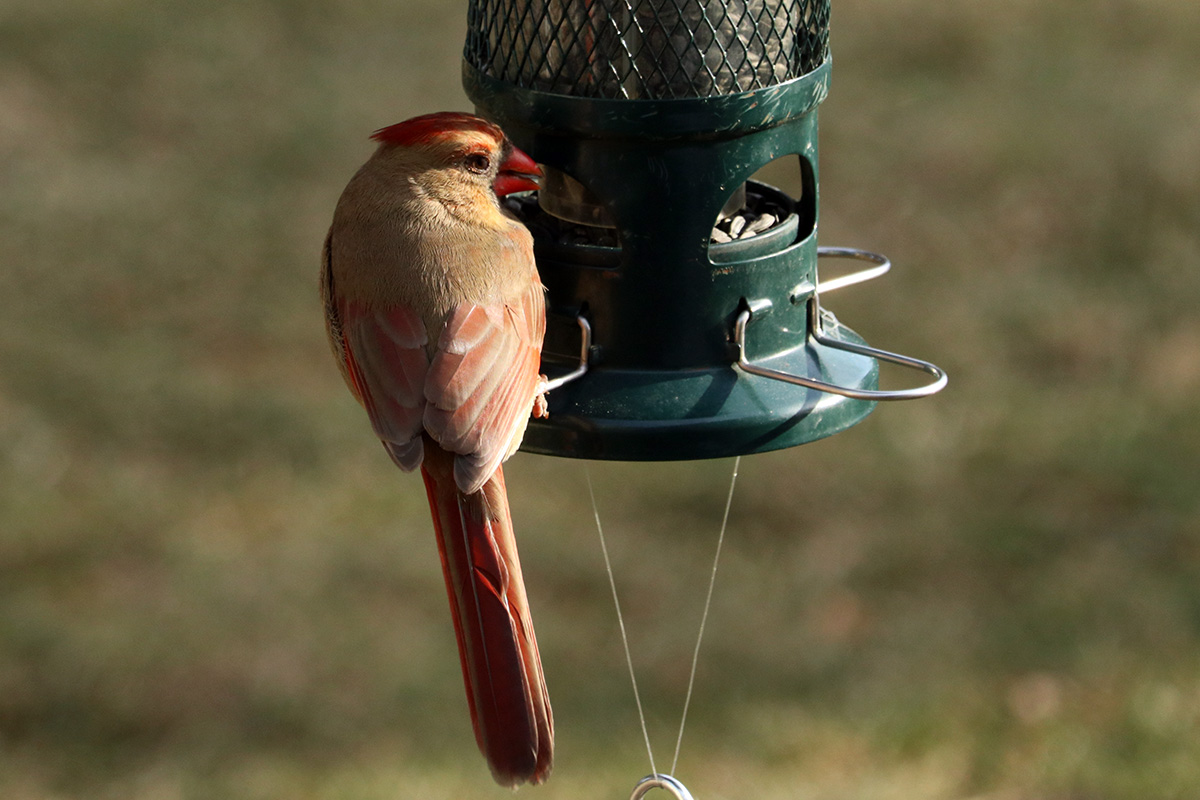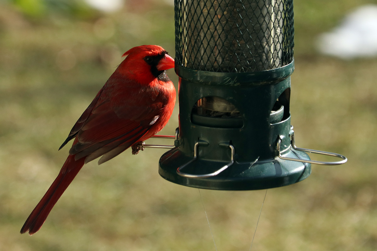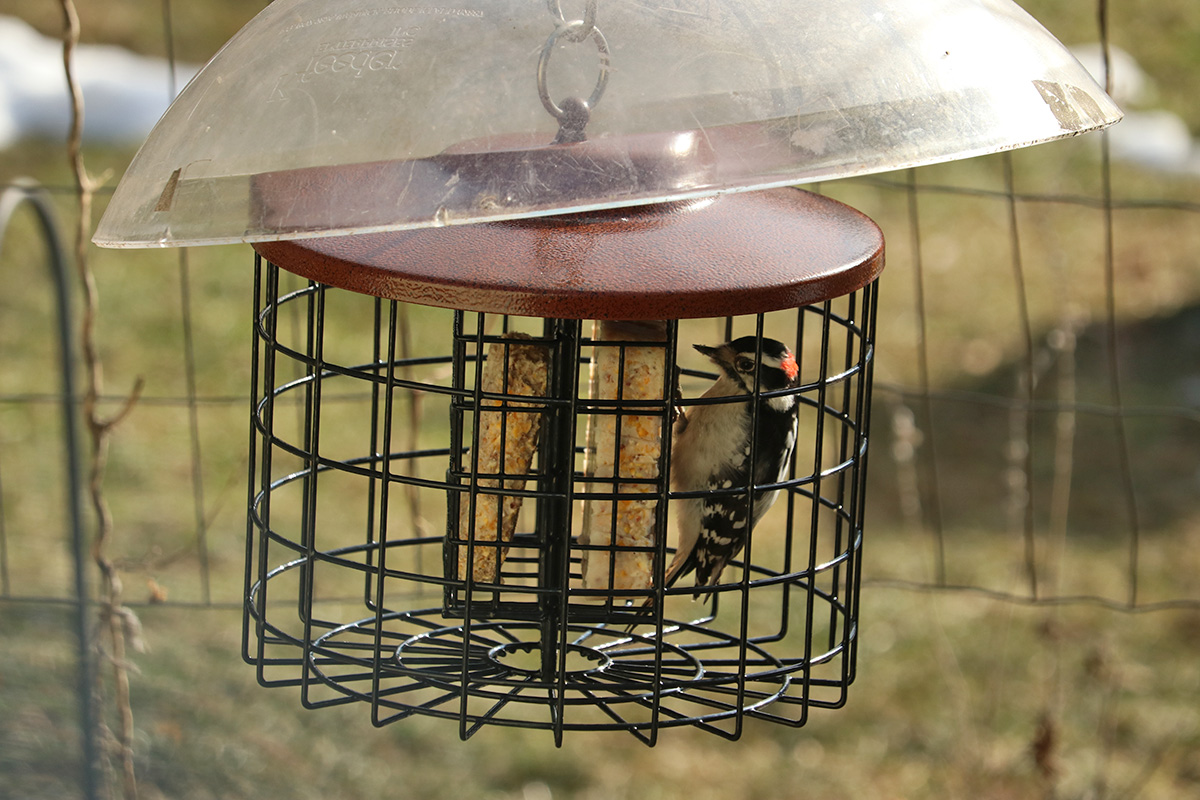 almost as soon as i put out the new suet feeder, we already had a visitor: a male downy woodpecker. i didn't see it fly into the feeder but it seemed to be feeding on the suet cake without an problems. i did see it leave, it easily slipped through the outer cage like it wasn't even there. it's definitely a feeder for smaller suet feeding birds like downy woodpeckers and carolina wrens. time will tell if larger suet feeding birds can get to it as well.
