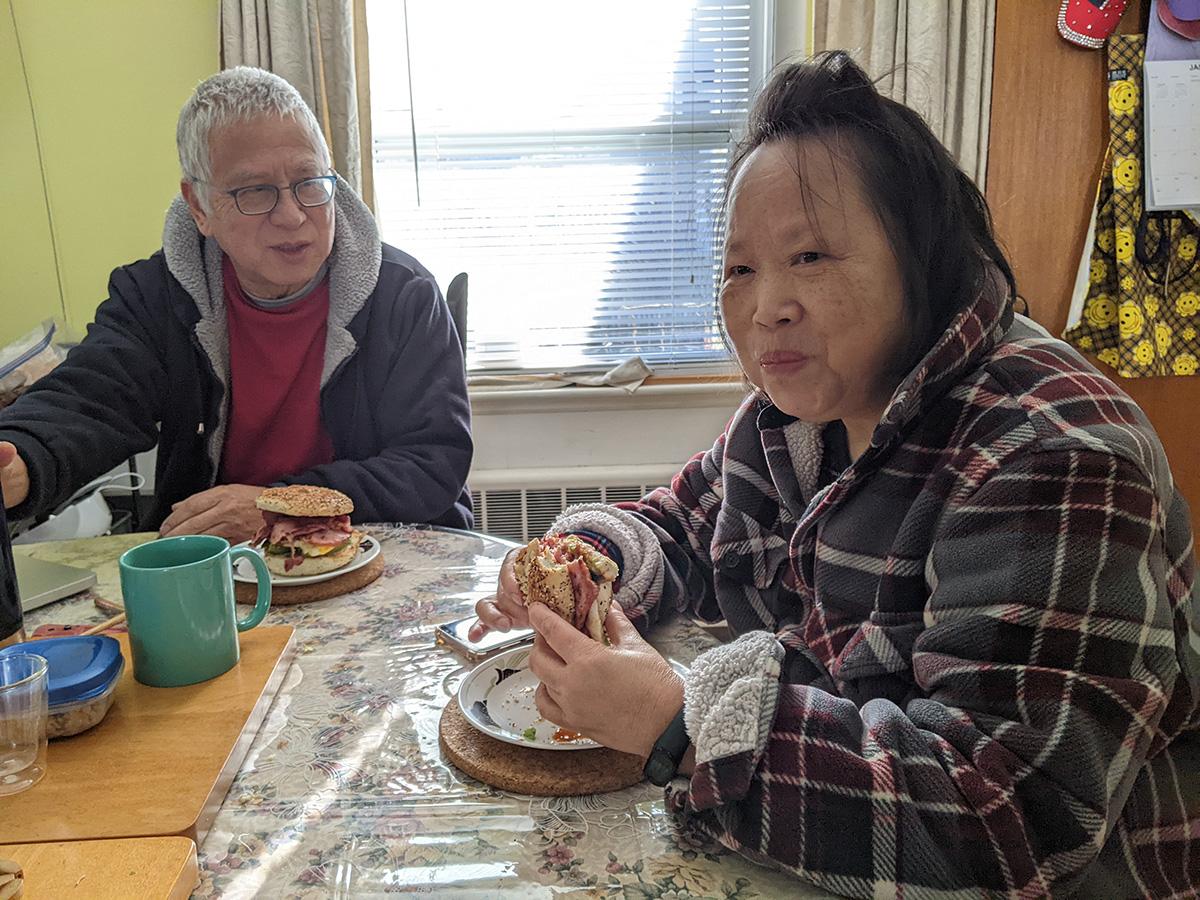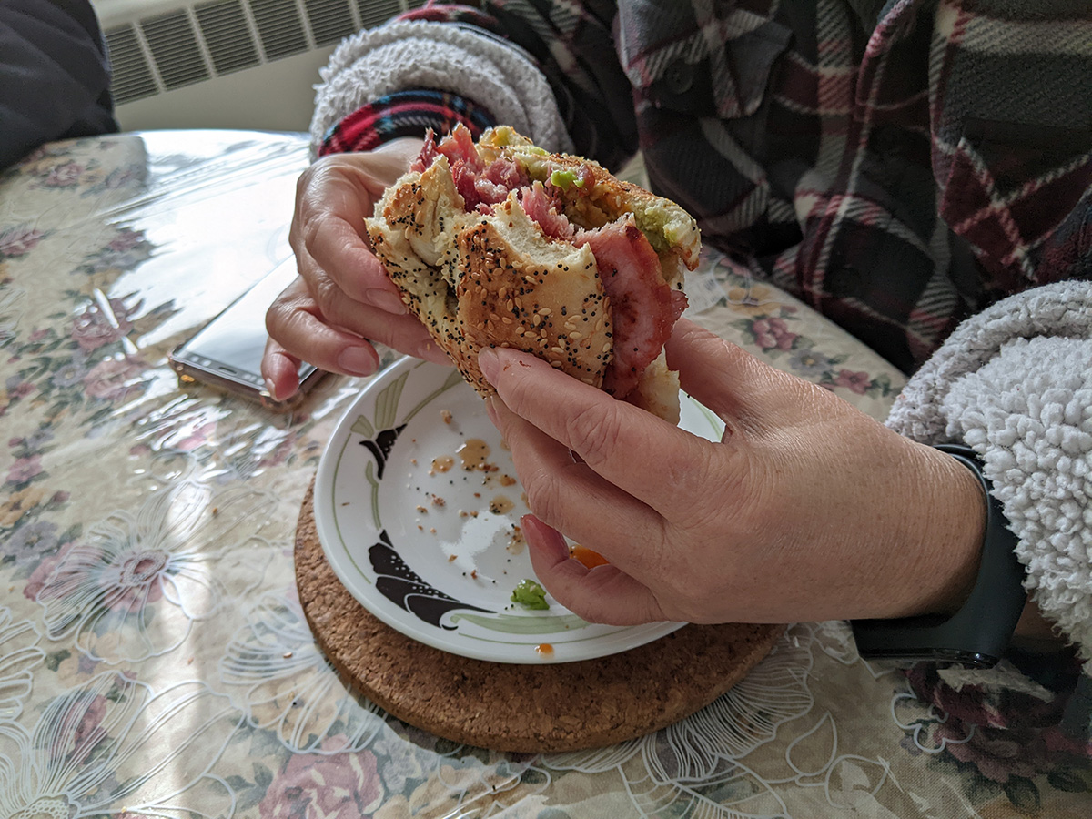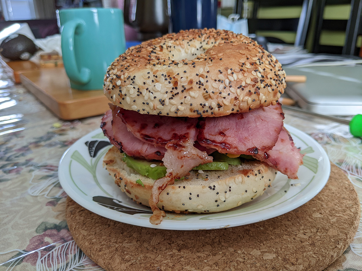 i made my special egg-ham-avocado bagel sandwiches for my parents. my father helped me grill all the leftover christmas ham i brought over from my house. each bagel sandwich required 4 thick layers of ham. a single large avocado was enough for 3 bagels. everyone seemed to like it although my mother couldn't find her sandwich and left a few bites.
