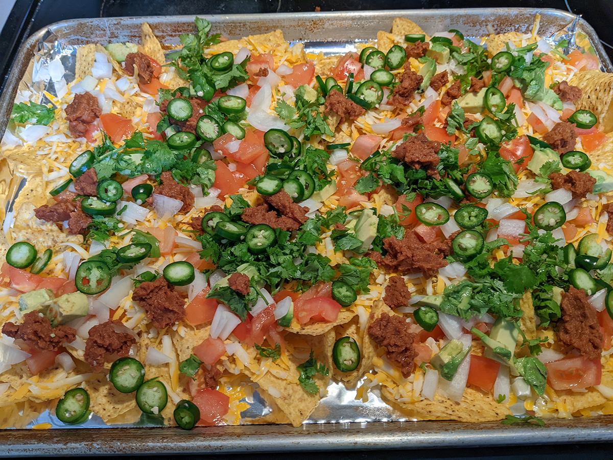 in the afternoon i made nachos for the very first time. i used simply market basket store brand corn chips, baked them a few minutes in the oven on a large aluminum-foil-covered tray before adding the toppings. the first layer was fresh shredded colby pepper jack cheese. i then added chopped tomatoes (3), chopped onions (half), chopped avocado (half), cilantro, and chopped serrano peppers (3). i then scooped chipotle-flavored refried beans from a can with a spoon and used my hands to roll them into balls before dropping them onto the nachos. into the oven it went, 350°F for about 10 minutes, or until the cheese melted.