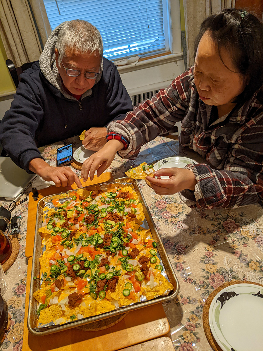 it wasn't bad for my first attempt, you really can't go wrong as long as you have corn chips and melted cheese. i could've used a bit more cheese, and sometimes the nachos stacked on top of each other so the bottom nachos had no toppings. the serrano peppers turned out to be very hot, and my mother picked off most of them otherwise my father couldn't eat them. i also didn't need to add the cilantro, they just wilted in the oven. i also had sour cream and olives, but i didn't use them. i think the refried beans are essential, otherwise the nachos can be a little bland, the only flavors coming from the slightly salted chips and the melted cheese. the three of us ended up finishing the whole pan. i have more leftover ingredients to make more nachos tomorrow.