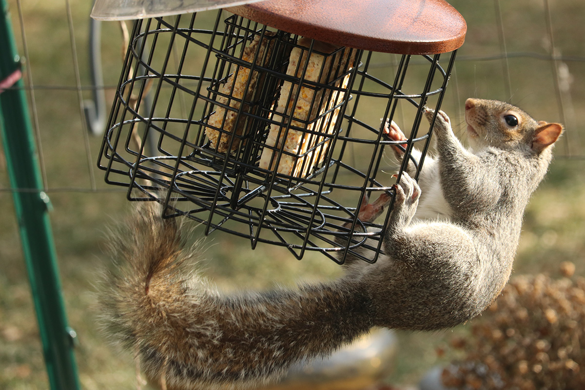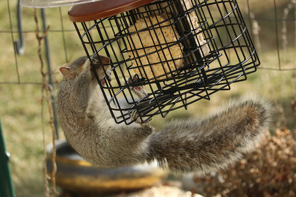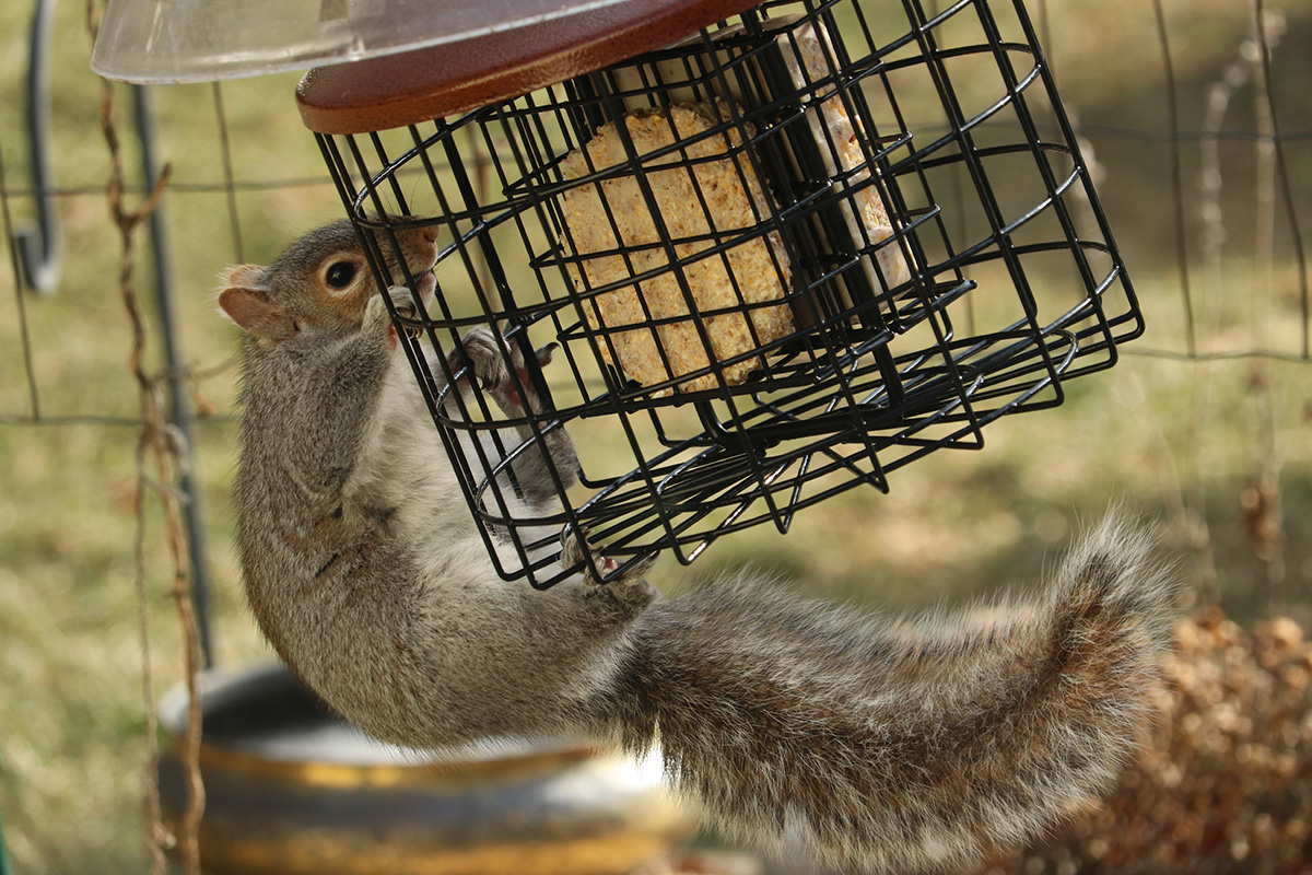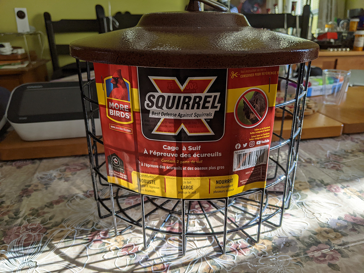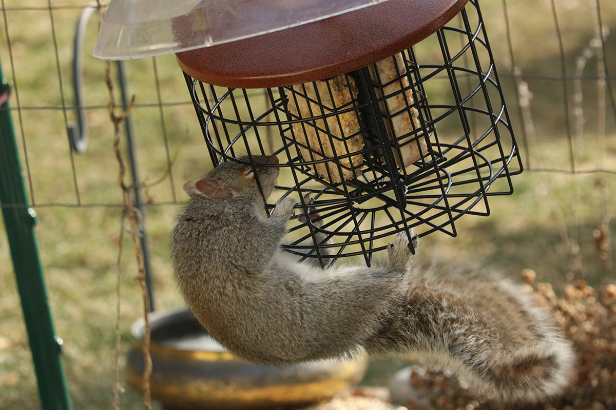 it didn't take long for a squirrel to come and investigate the new feeder. up until now, our old suet feeder - the classic square cage model - was essentially a squirrel feeder. it fed from that old feeder at will, despite my many attempts to mount the feeder so it'd be harder for the squirrel to get to. this new feeder though - with it's double cage design - i could already tell the squirrels would not be able to get to the suet cakes. it was fun to watch, as the squirrel kept on trying, biting the metal lid and the cage. at one point i even saw it stick its squirrel arm into the feeder, trying to claw off of a piece of suet, but it was all in vain.