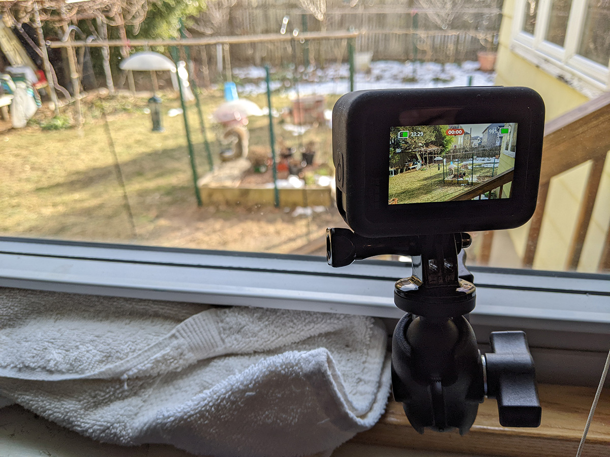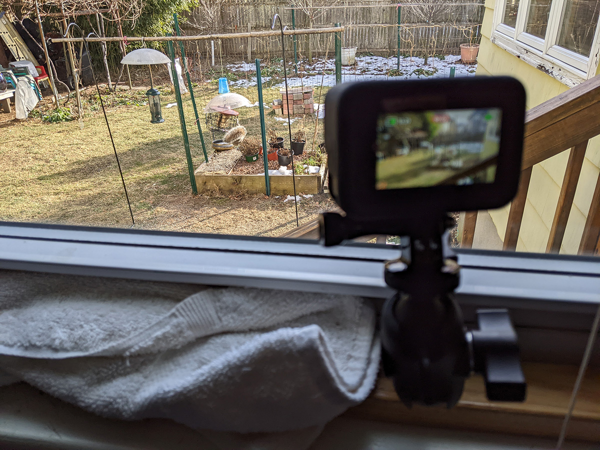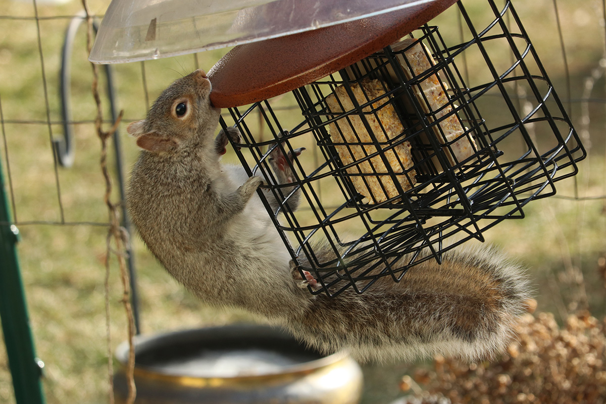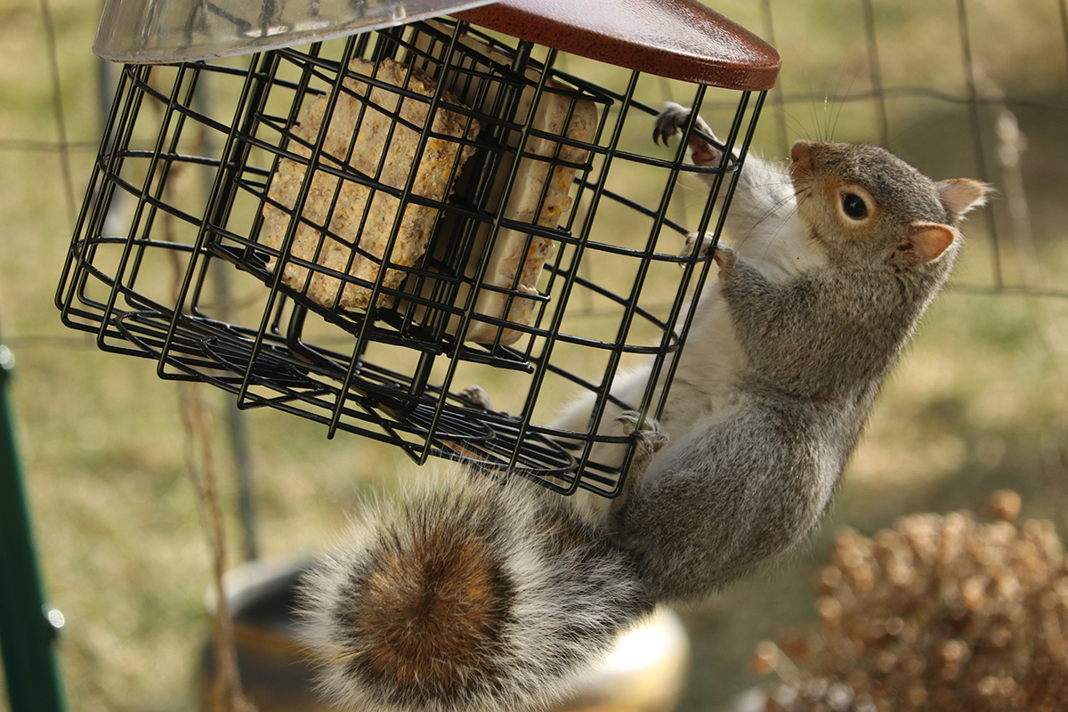 it didn't take long for a squirrel to come and investigate the new feeder. up until now, our old suet feeder - the classic square cage model - was essentially a squirrel feeder. it fed from that old feeder at will, despite my many attempts to mount the feeder so it'd be harder for the squirrel to get to. this new feeder though - with it's double cage design - i could already tell the squirrels would not be able to get to the suet cakes. it was fun to watch, as the squirrel kept on trying, biting the metal lid and the cage. at one point i even saw it stick its squirrel arm into the feeder, trying to claw off of a piece of suet, but it was all in vain.