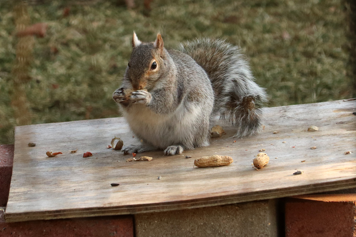 peanuts i put out yesterday were all gone. i put out some more. later in the afternoon i saw a fat squirrel going to town on the peanuts. apparently there's no stop when it comes to eating, it ate all the peanuts before finally leaving. funny thing is there were also some sunflower seeds but it didn't bother with them. that's probably the same squirrel that's been engorging itself on the suet, before i installed the squirrel-proof feeder.