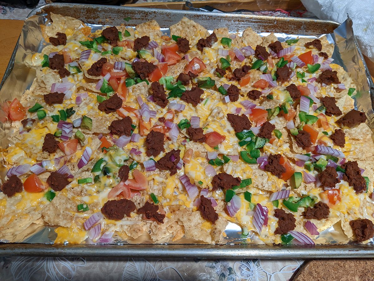 we made some more nachos today. my mother helped me cut the vegetables as i grated the cheese. we used jalapeño peppers this time, but my mother said they weren't spicy at all. we managed to finish the whole pan of nachos.