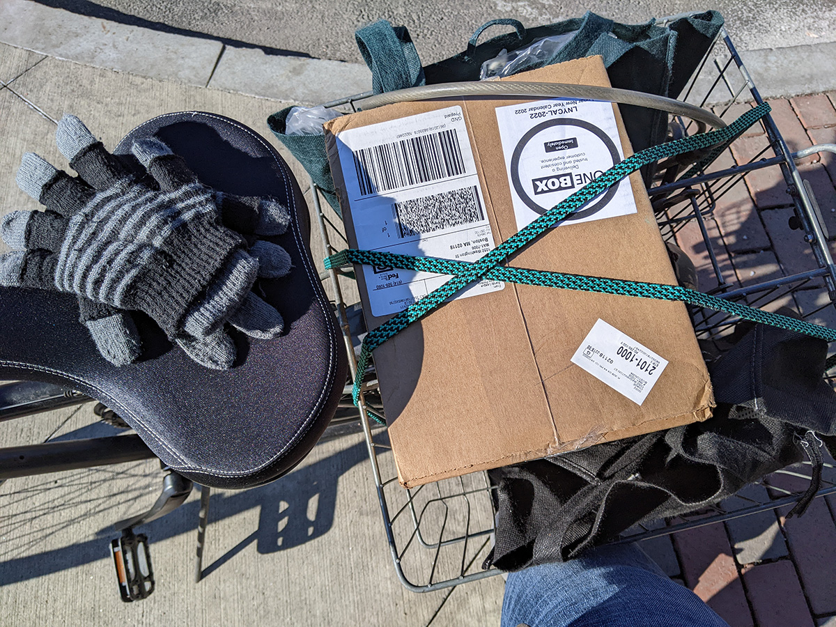 after i got back home and finished eating the leftover pizza, i biked to market basket to get a few groceries item, before the inevitable crush of people doing their panic buying before the impending snowstorm this saturday. my bungie cords were still draped across my rear bike baskets. since they didn't get caught on my way back from the cafe, i figured i was safe and would take care of them when i returned home. unfortunately one of the cords fell off and wrap itself around my rear cogwheels. i had to pull over onto the side of the road and take care of it, getting black grease stains on my gloves and hands. once the cord was removed, i had to realign the chain because it came off the gears completely. but i managed to fix it before continuing onwards to market basket.