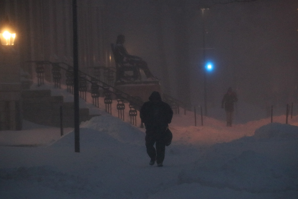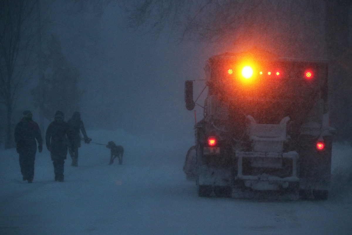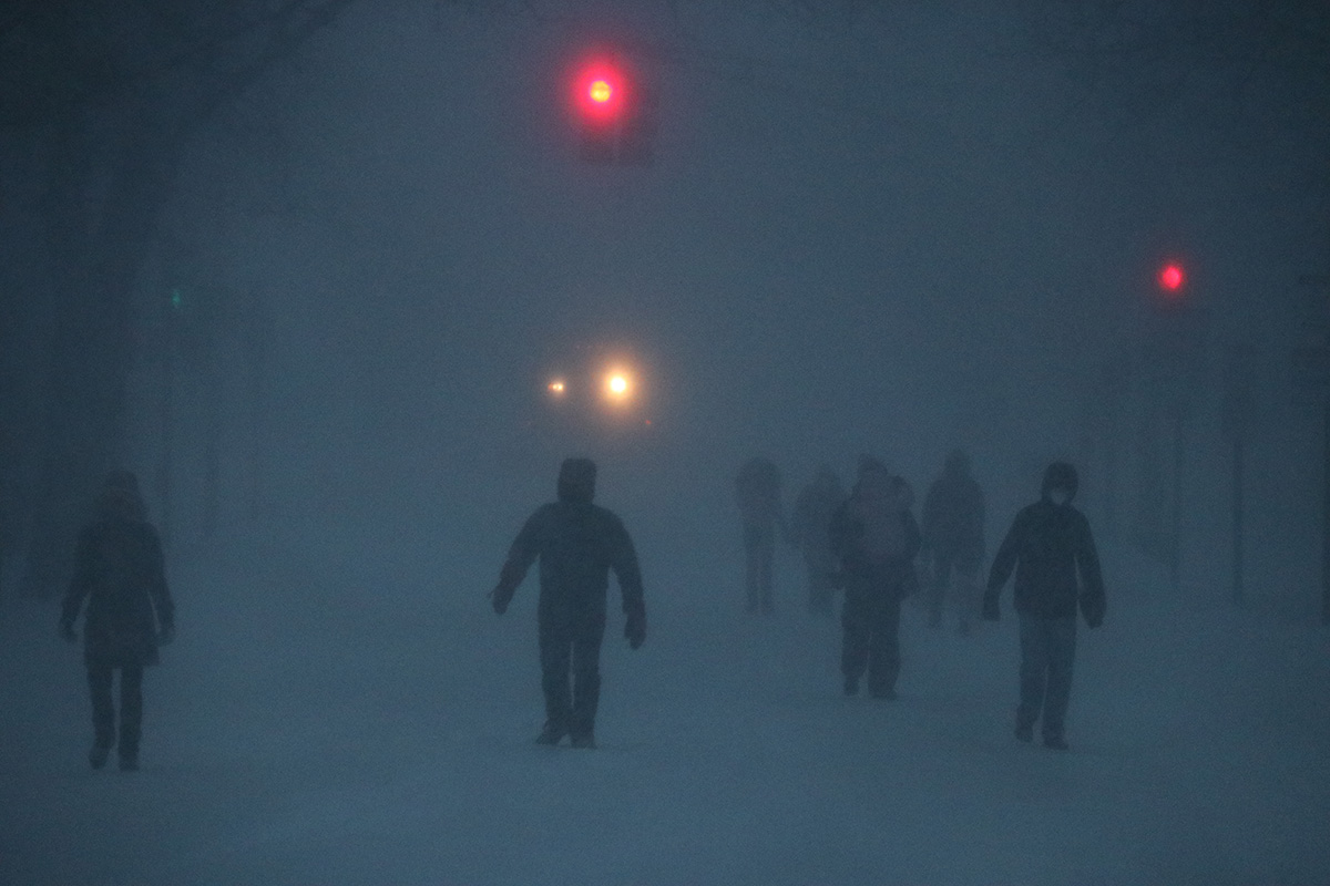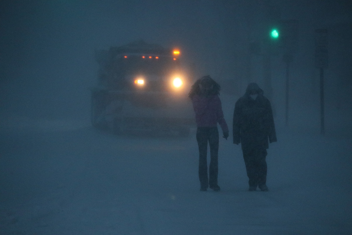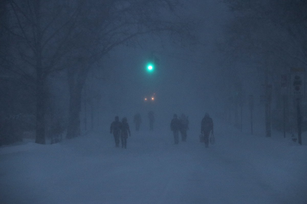 i tried to walk on the sidewalks but many weren't shoveled yet, so the only recourse was to walk in the streets. many other people had the same idea, and i was surprised to see a lot of people out and about, taking in the snowstorm. fortunately the only vehicles on the roads were snowplows. the pedestrians didn't seem to notice them, neither did the plow drivers do any honking, everyone doing their own slow dance. the landscape looked desolate, dystopian, like a scene from dune, except instead of sand it was ice crystals. the plows - with their blinking lights - where like futuristic spaceships. i spoke with one plow driver who was knocking off the slush on the bottom of his vehicle. he'd been working since 3am, and not quite sure when to stop. "when the city tells me," he said.