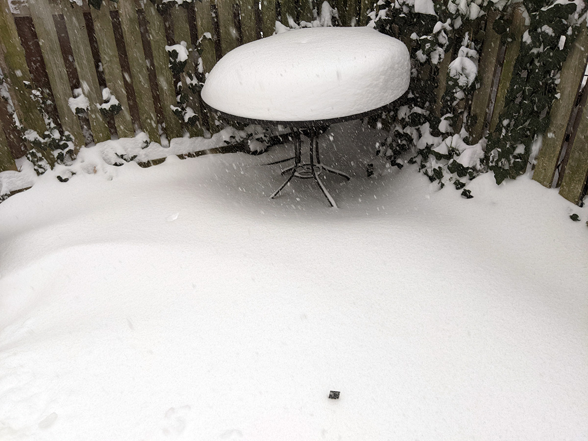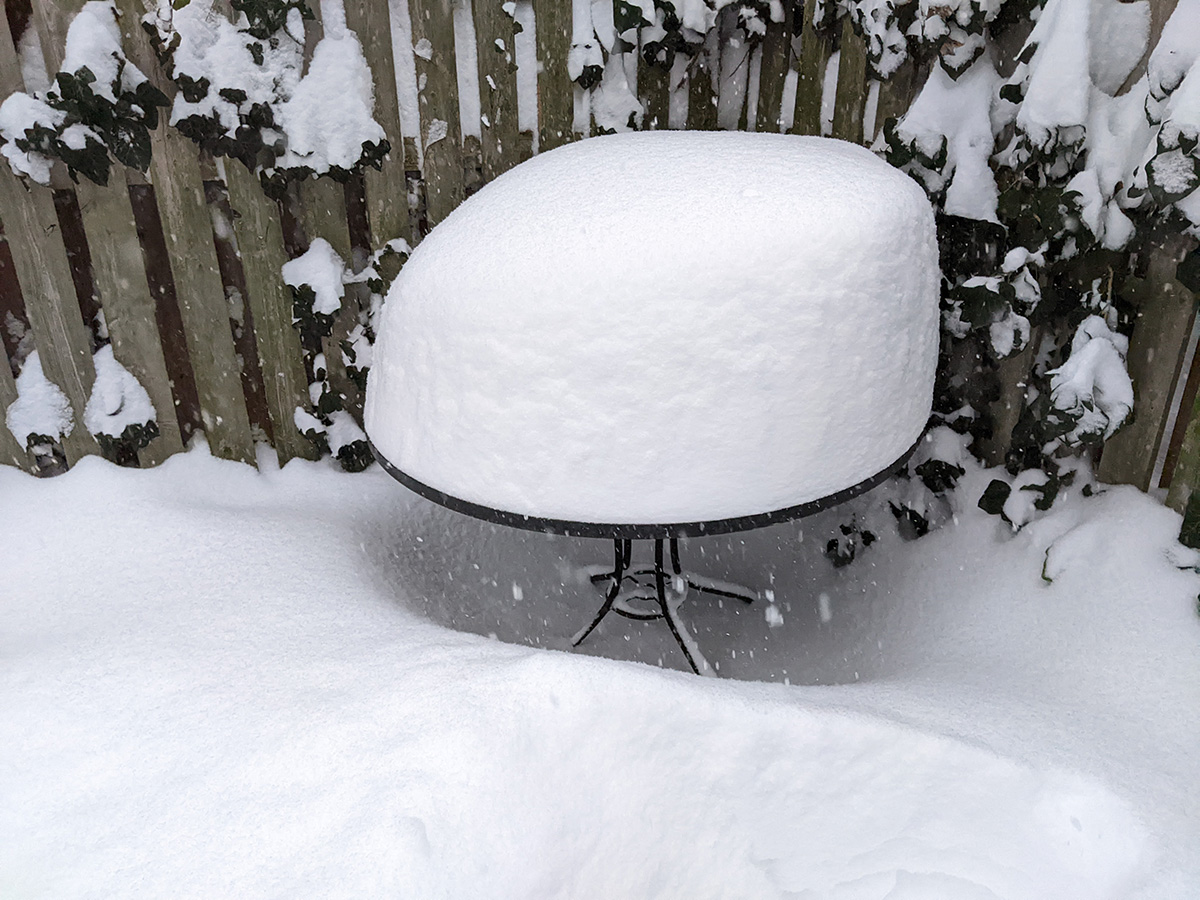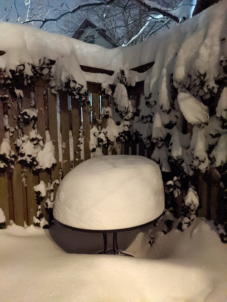 afterwards i grabbed a ruler and took some measurements. the largest pile of snow on the sidewalk was only about 4 inches. snow in the alleyway was up to 9 inches, but further into the southeastern corner of the backyard it was 11 inches. there was a snow cake on our cast-iron backyard table that i figured would give me the purest accumulation total: it was about 9 inches.