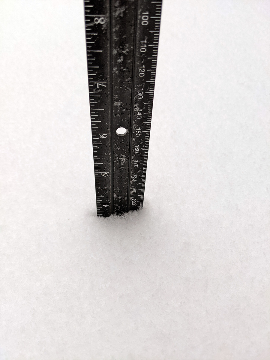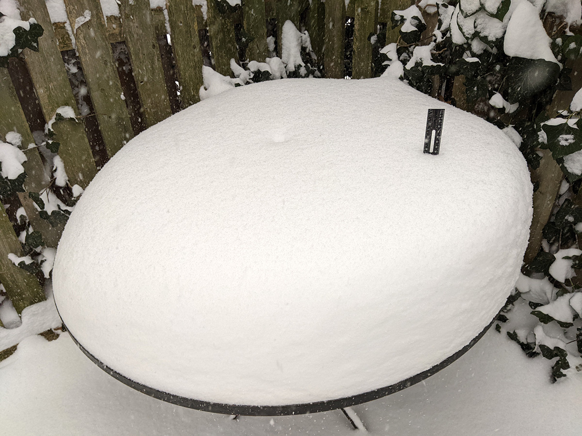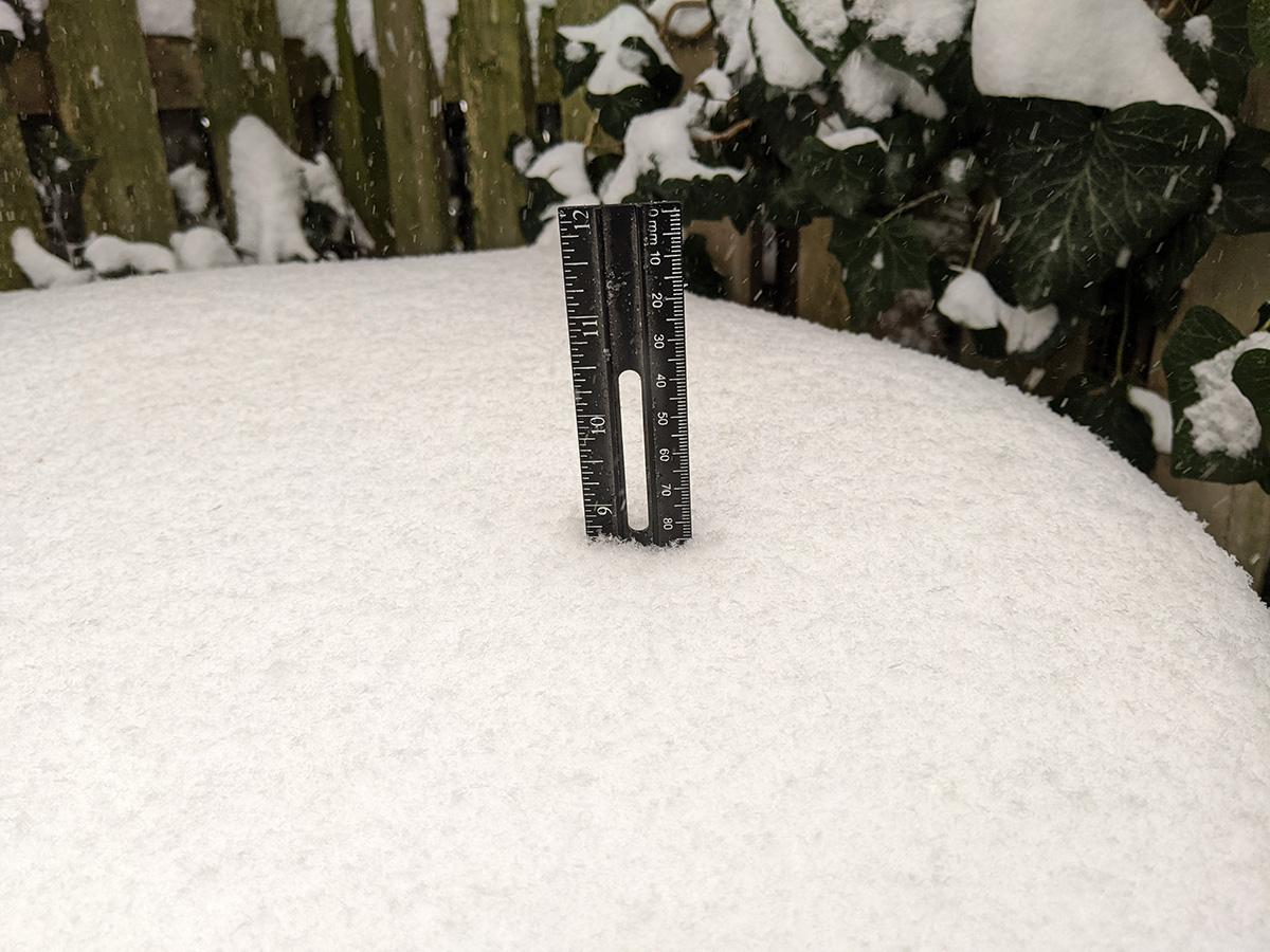 afterwards i grabbed a ruler and took some measurements. the largest pile of snow on the sidewalk was only about 4 inches. snow in the alleyway was up to 9 inches, but further into the southeastern corner of the backyard it was 11 inches. there was a snow cake on our cast-iron backyard table that i figured would give me the purest accumulation total: it was about 9 inches.
