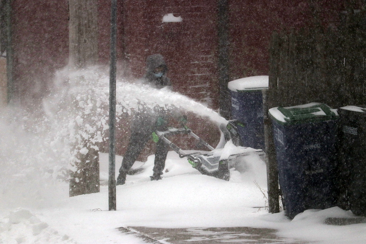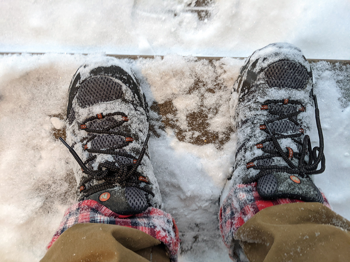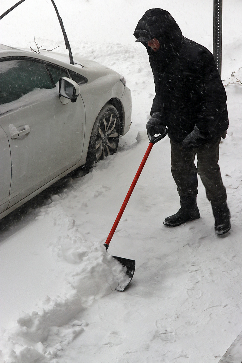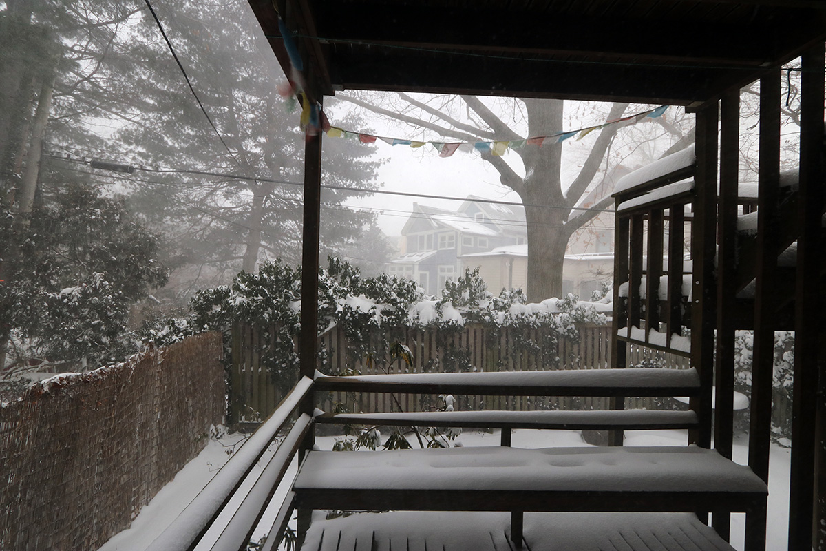 when i woke up this morning, i was a little disappointed that there wasn't as much snow as i thought there'd be. of course we were less than halfway into the snowstorm, and the bulk of which hadn't fully arrived yet. doppler radar showed a long smear of white up along the eastern seaboard. not only was it snowy, not only was it windy, but it was also cold, with temperature in the teens. this meant powdery fluffy snow, which is easier to shuffle but harder to pile up.