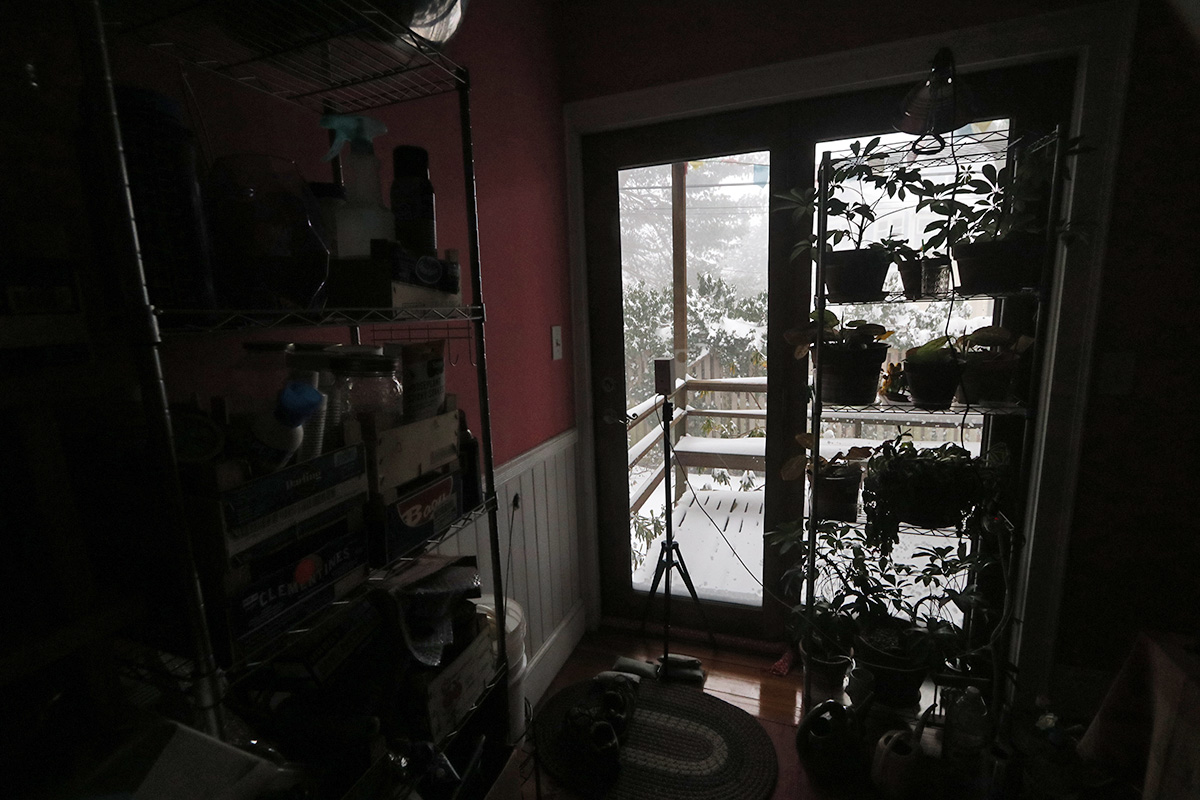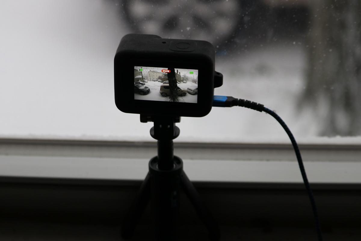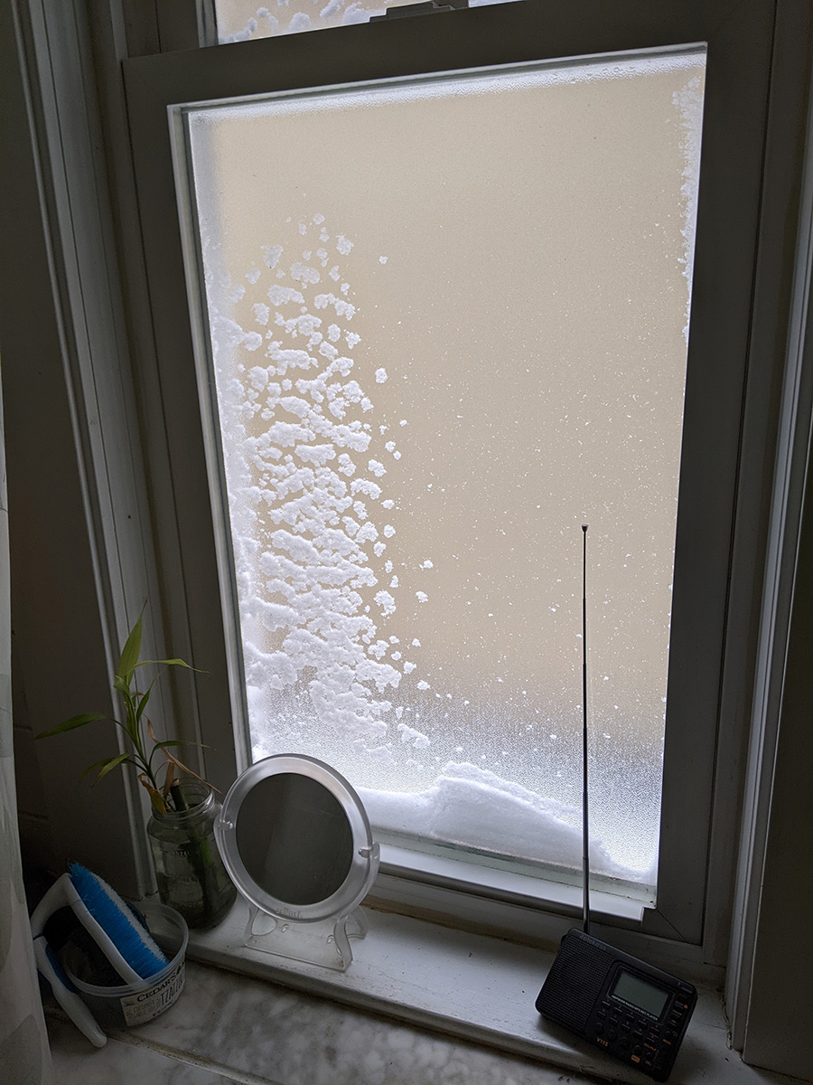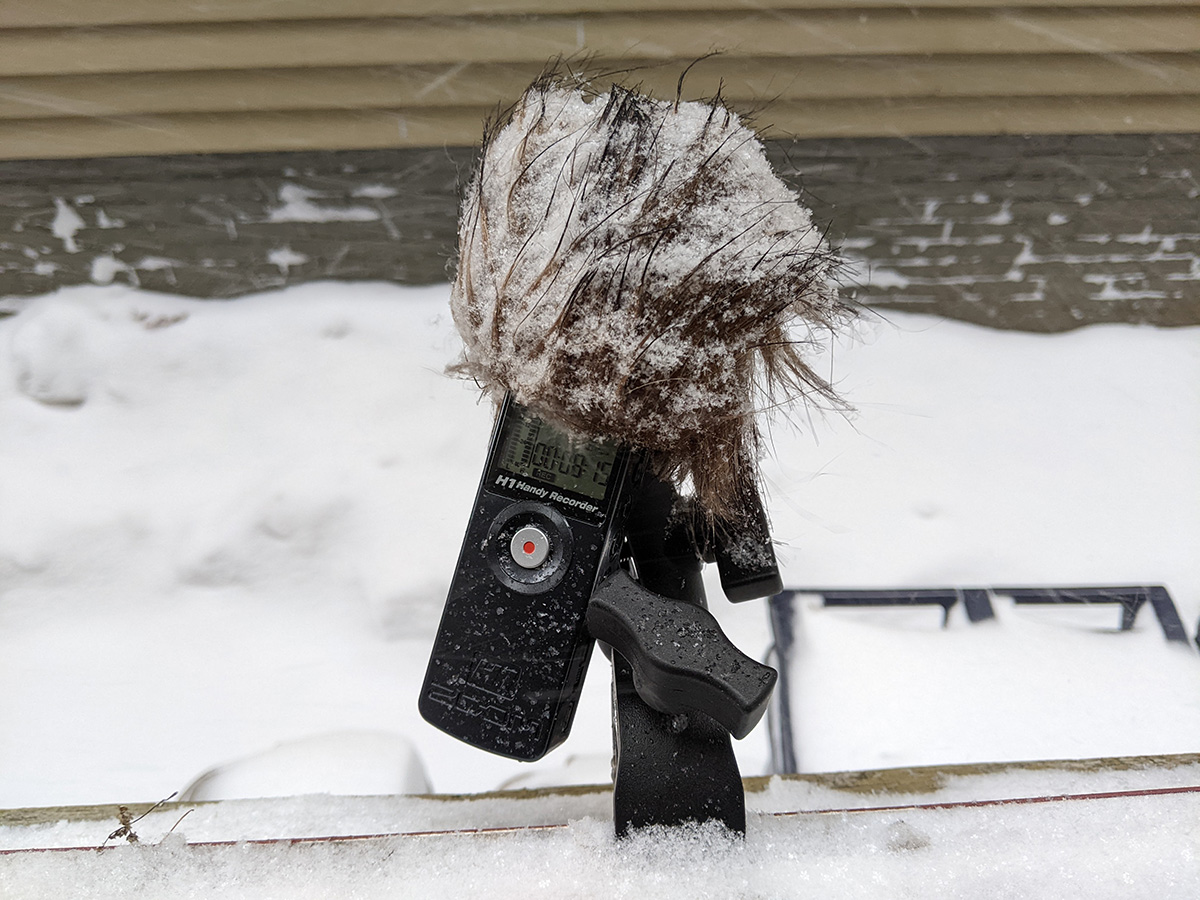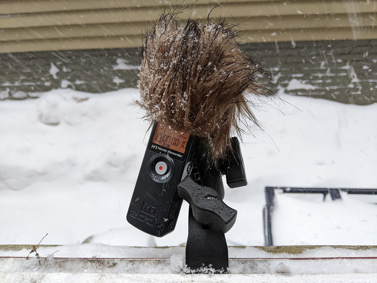 back inside, i wanted to record some wind sounds for my video projects. i attached my zoom H1 microphone onto my clamp mount and secured it onto the outside windowsill edge. just 8 minute was enough to cover my homemade deadcat attachment in snow. i couldn't get a good recording though, the wind was too strong, causing plosives in the audio (what i need is a blimp).