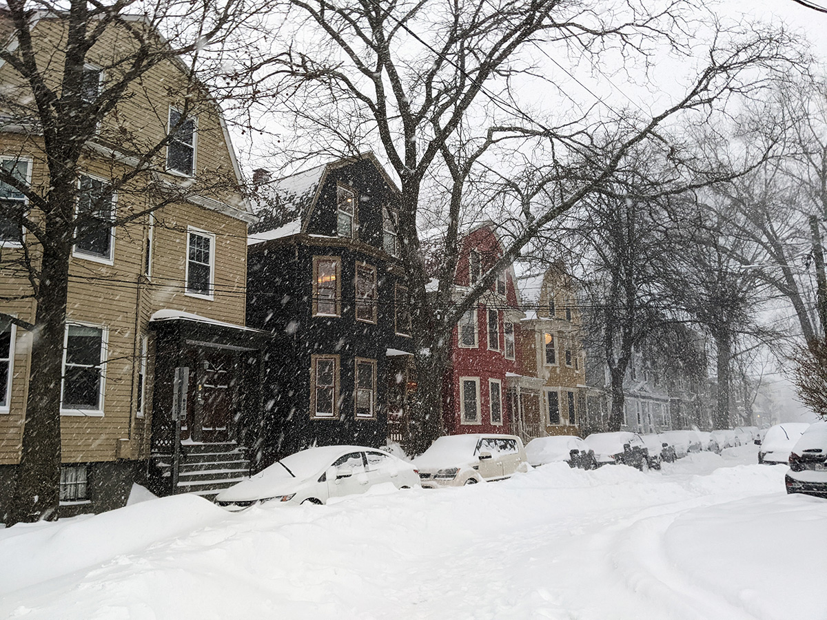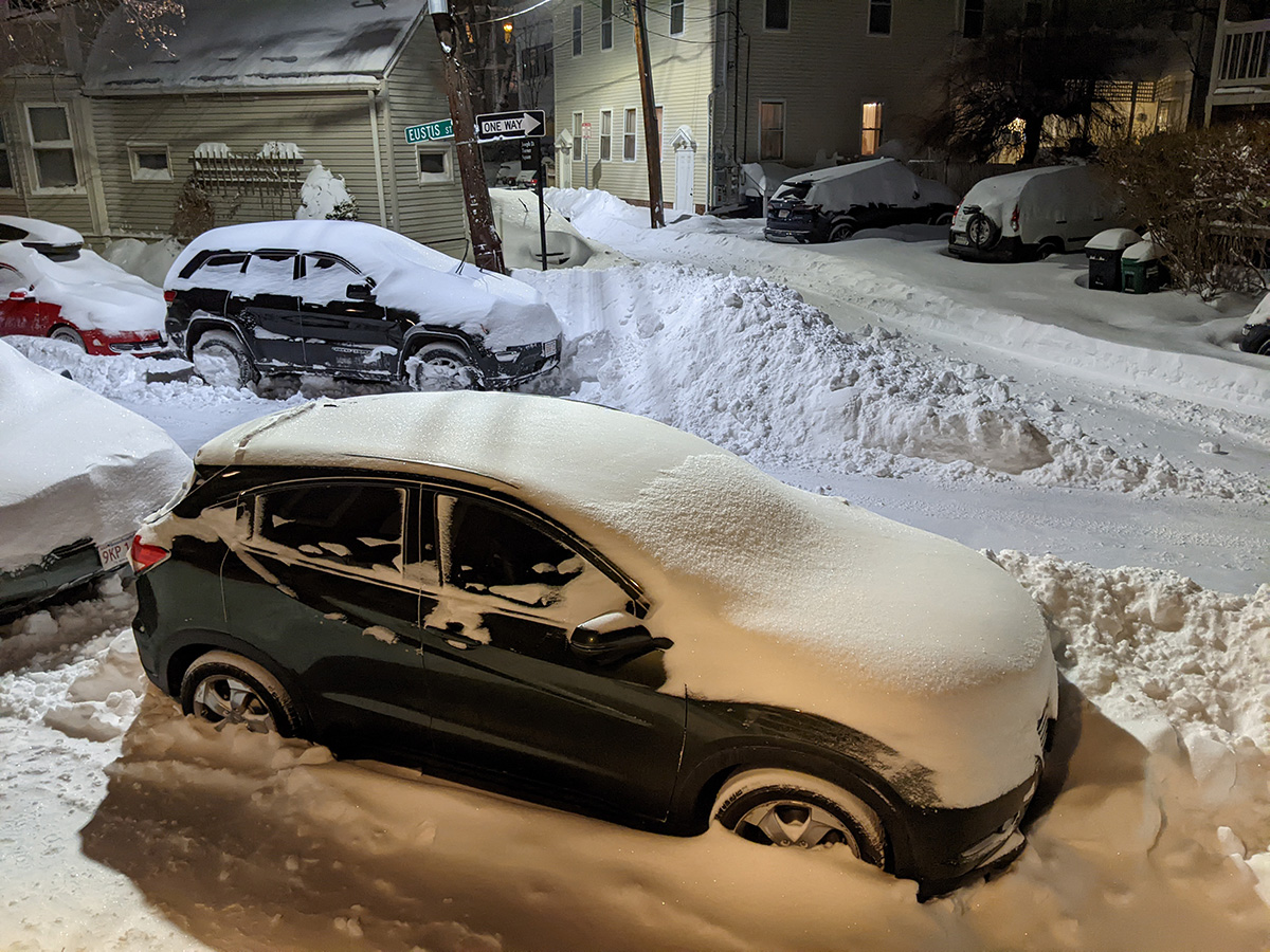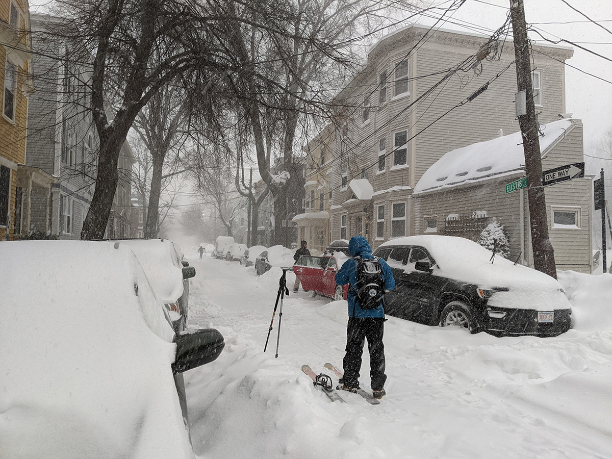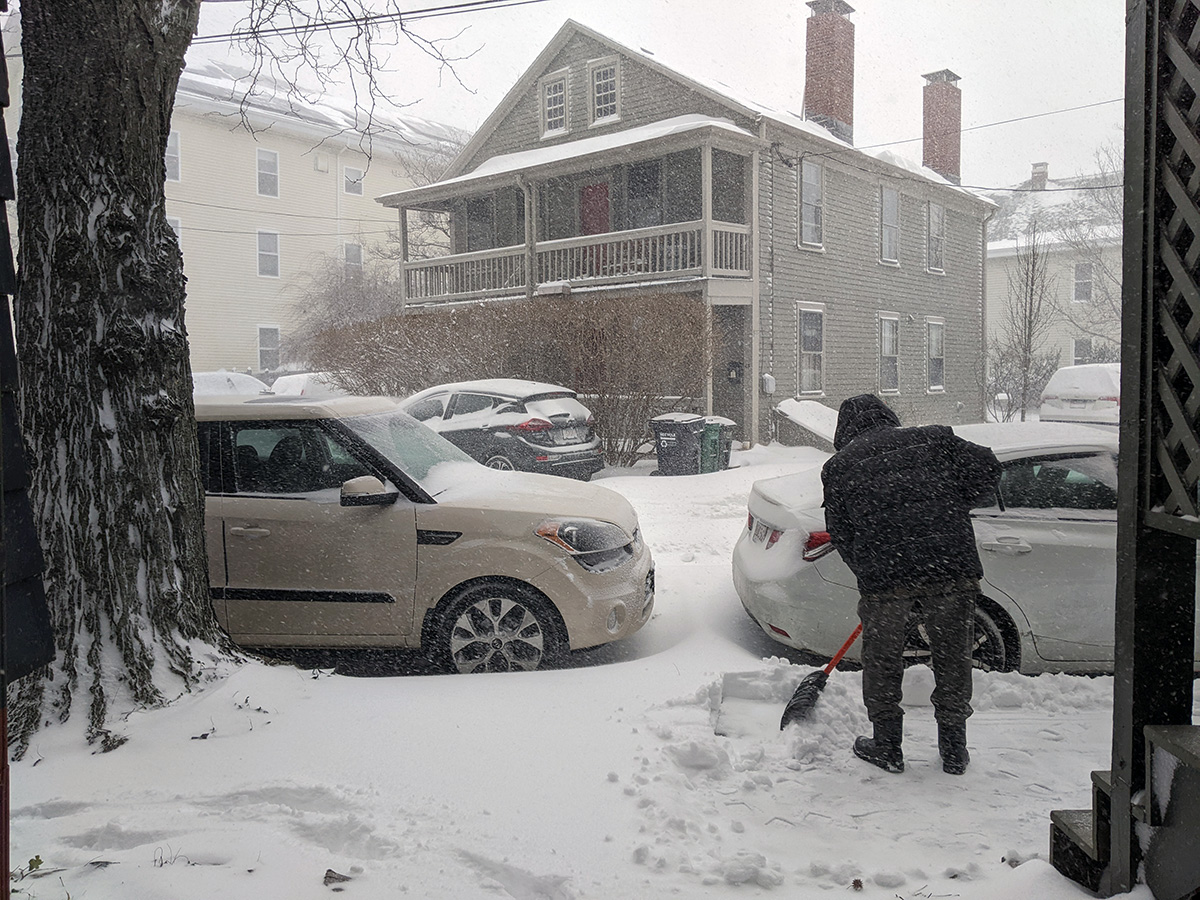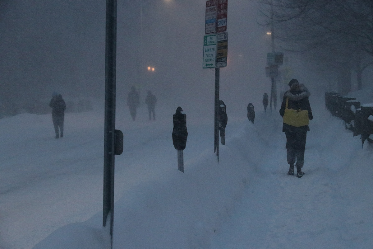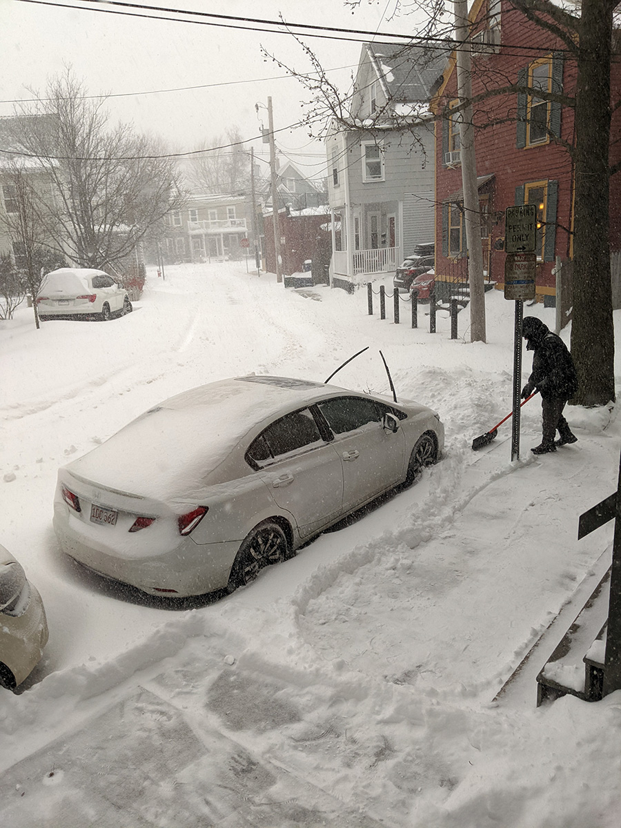 starting around 2pm i began to see more people outside. folks were walking to the nearby supermarket to get groceries, probably also a chance to go out and experience the snowstorm firsthand. occasionally i'd also see cross country skiers sliding down the road. it was around this time that my other neighbors started to come out and shovel their sidewalks and dig out their cars, despite the fact that it was still snowing pretty hard, and the wind seemed even more intense. i was waiting for them to finish up with their shoveling before going out myself, but then i saw my neighbors jen and moira not only shoveling our sidewalk but our steps as well!