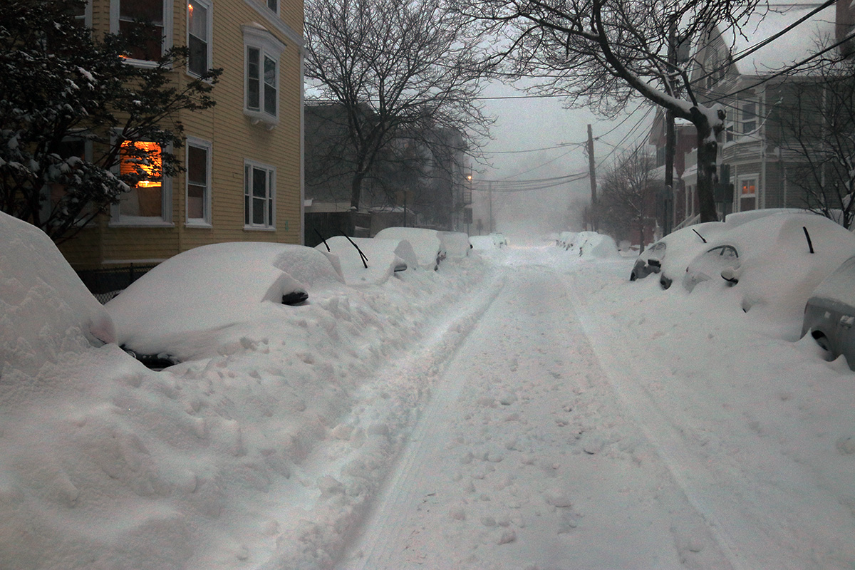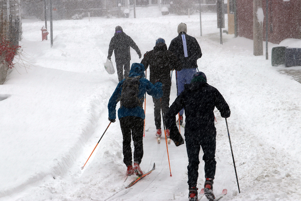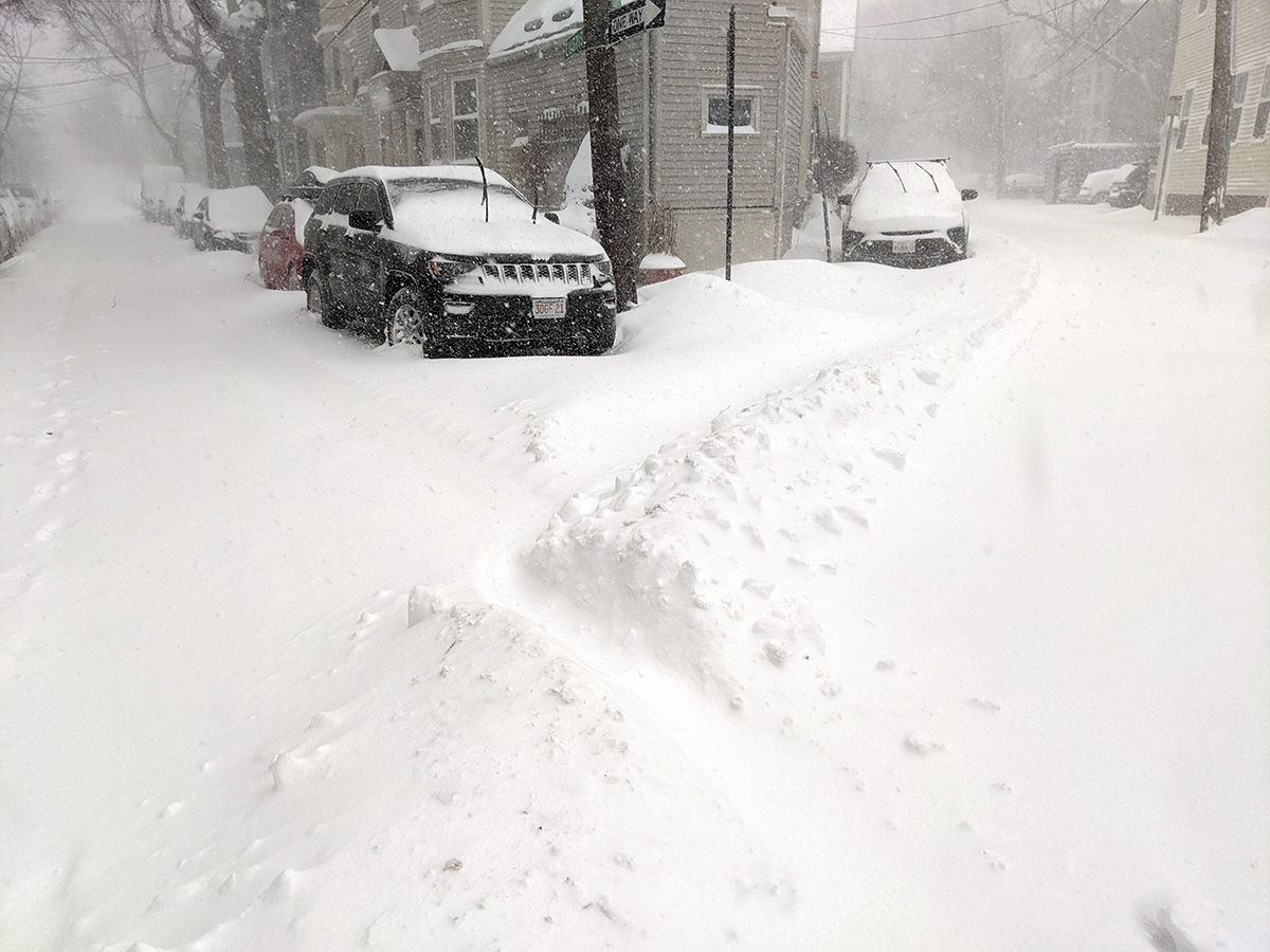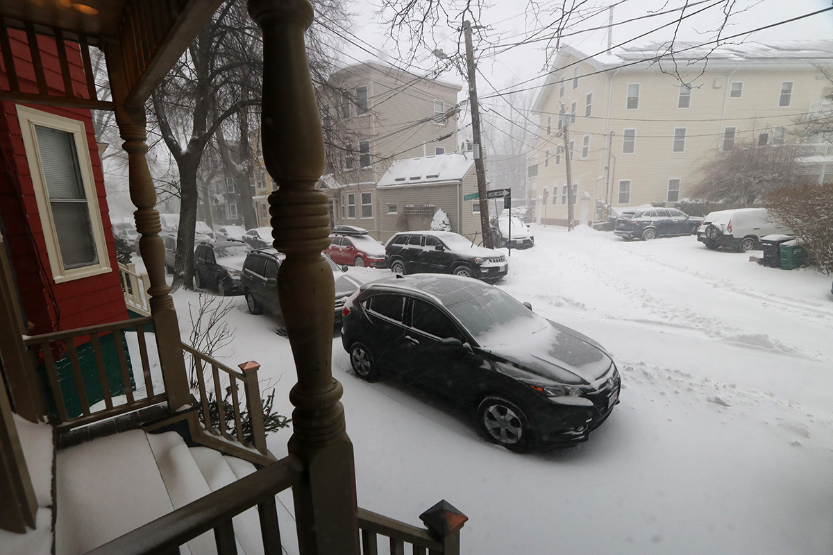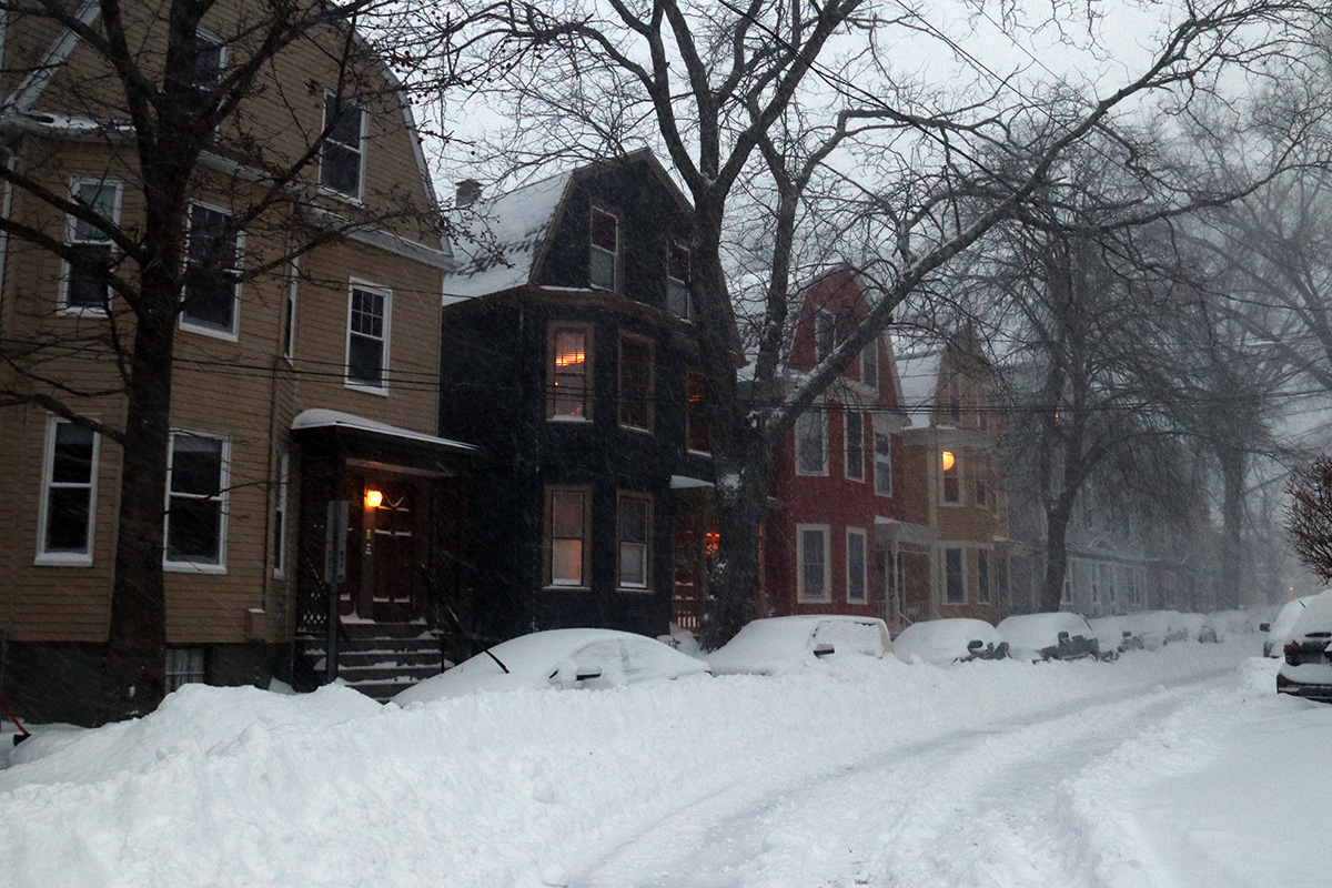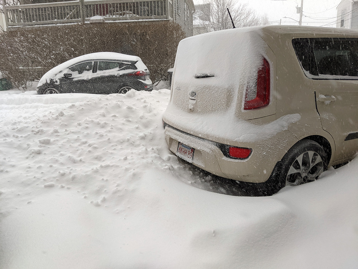 starting around 2pm i began to see more people outside. folks were walking to the nearby supermarket to get groceries, probably also a chance to go out and experience the snowstorm firsthand. occasionally i'd also see cross country skiers sliding down the road. it was around this time that my other neighbors started to come out and shovel their sidewalks and dig out their cars, despite the fact that it was still snowing pretty hard, and the wind seemed even more intense. i was waiting for them to finish up with their shoveling before going out myself, but then i saw my neighbors jen and moira not only shoveling our sidewalk but our steps as well!