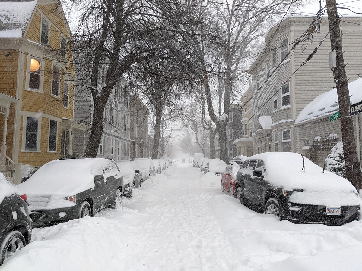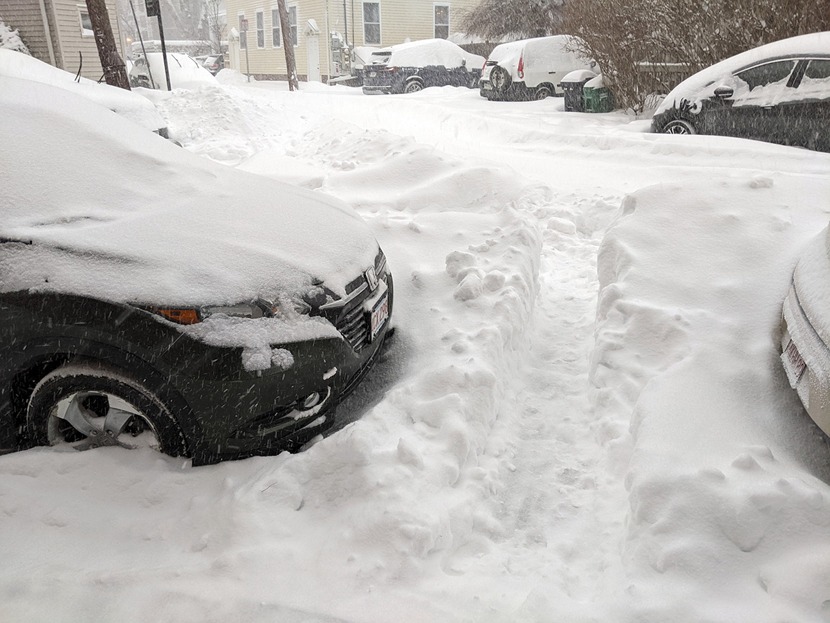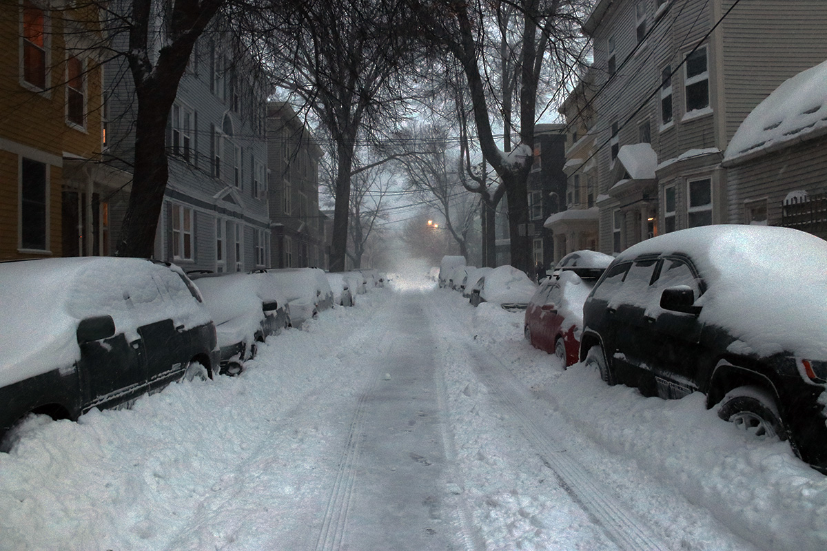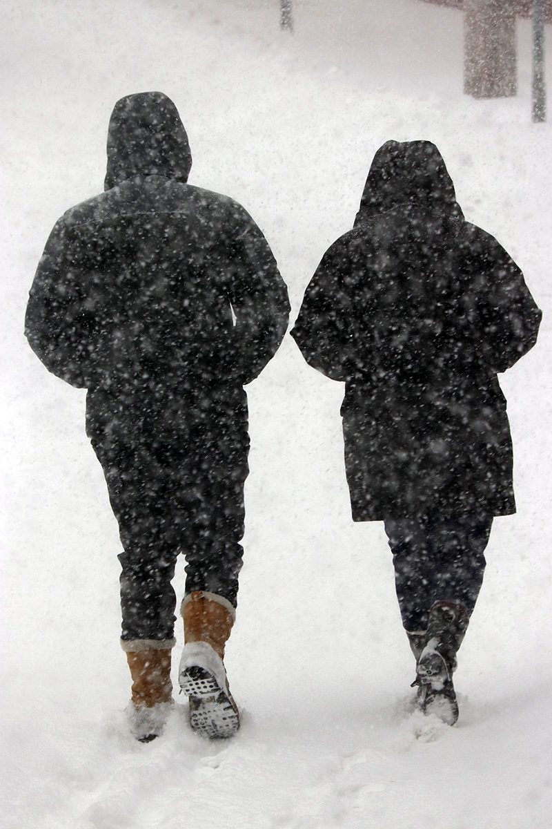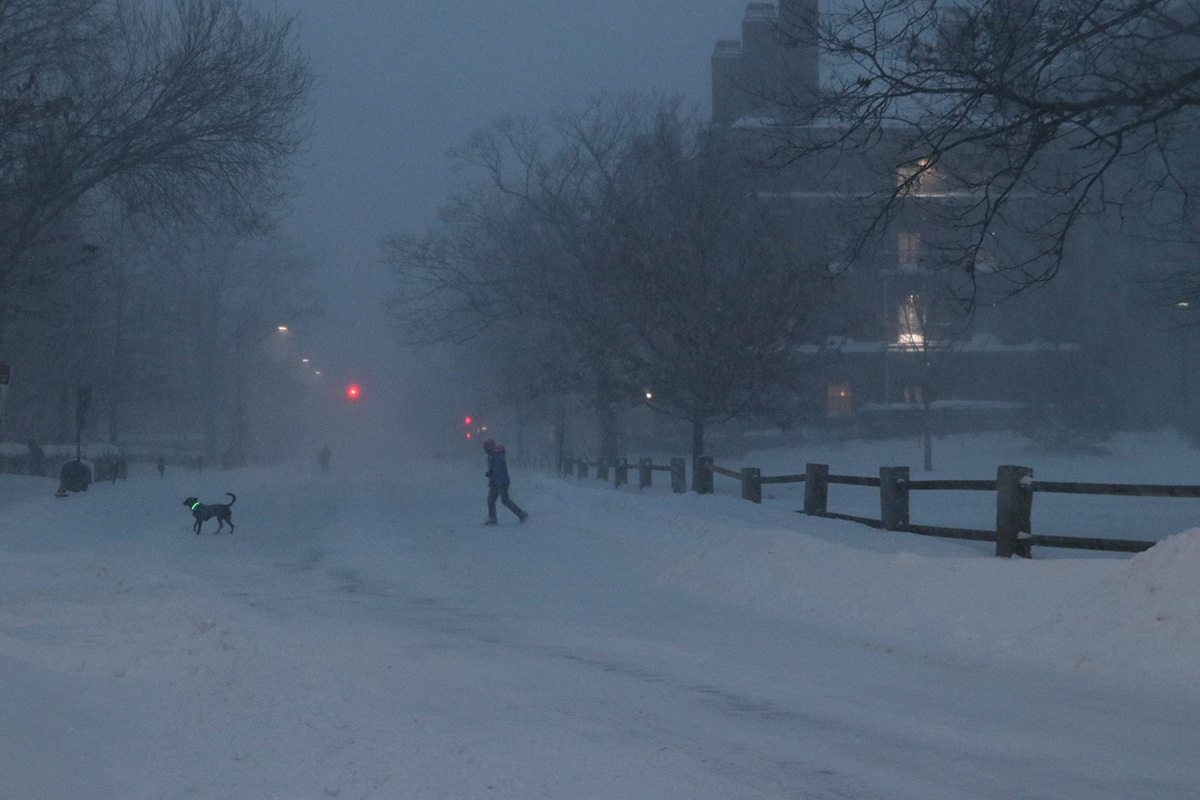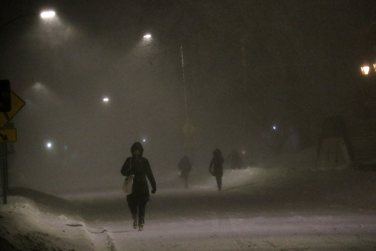 starting around 2pm i began to see more people outside. folks were walking to the nearby supermarket to get groceries, probably also a chance to go out and experience the snowstorm firsthand. occasionally i'd also see cross country skiers sliding down the road. it was around this time that my other neighbors started to come out and shovel their sidewalks and dig out their cars, despite the fact that it was still snowing pretty hard, and the wind seemed even more intense. i was waiting for them to finish up with their shoveling before going out myself, but then i saw my neighbors jen and moira not only shoveling our sidewalk but our steps as well!
