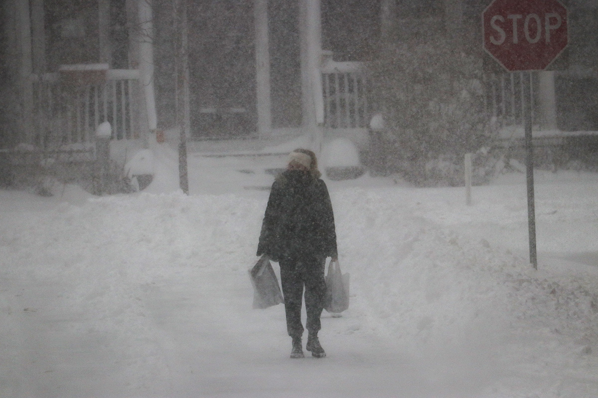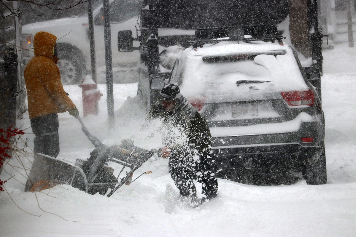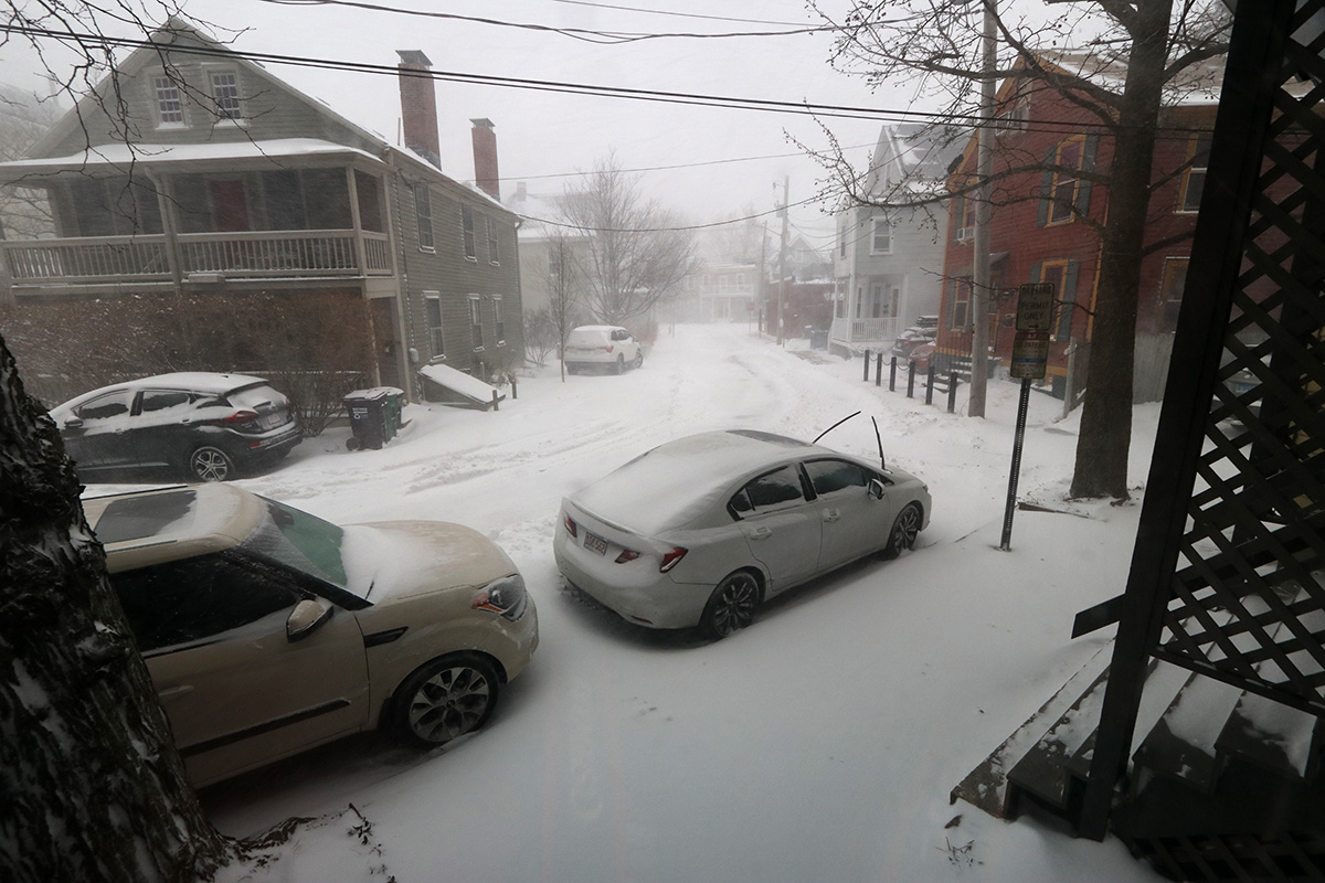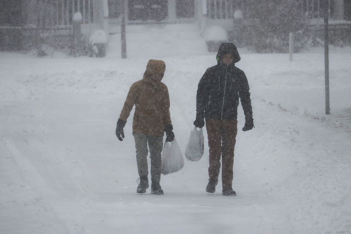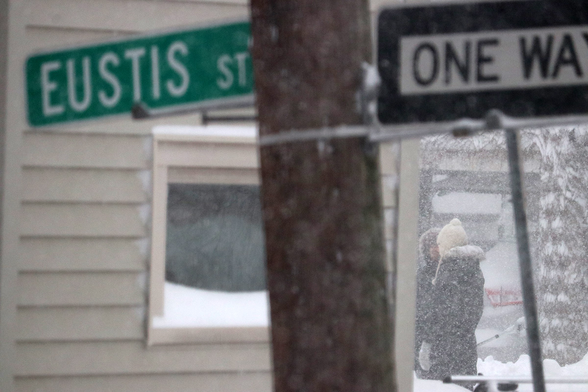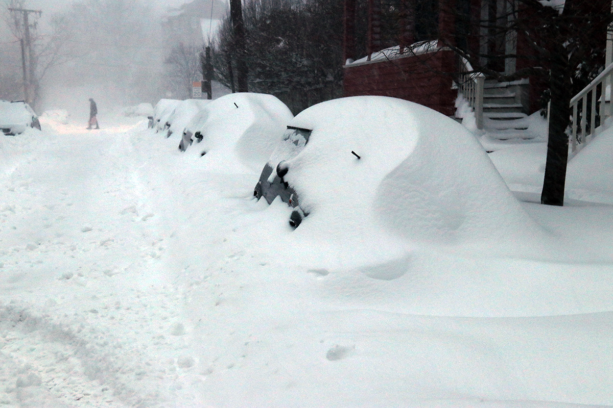 starting around 2pm i began to see more people outside. folks were walking to the nearby supermarket to get groceries, probably also a chance to go out and experience the snowstorm firsthand. occasionally i'd also see cross country skiers sliding down the road. it was around this time that my other neighbors started to come out and shovel their sidewalks and dig out their cars, despite the fact that it was still snowing pretty hard, and the wind seemed even more intense. i was waiting for them to finish up with their shoveling before going out myself, but then i saw my neighbors jen and moira not only shoveling our sidewalk but our steps as well!