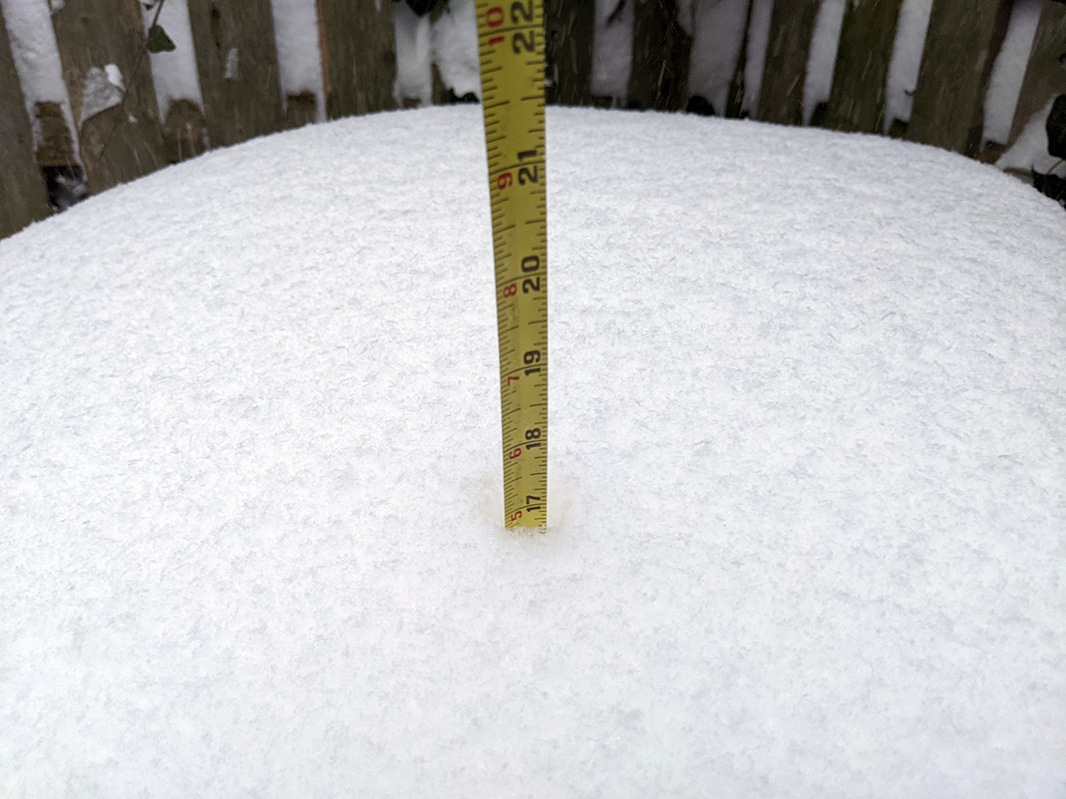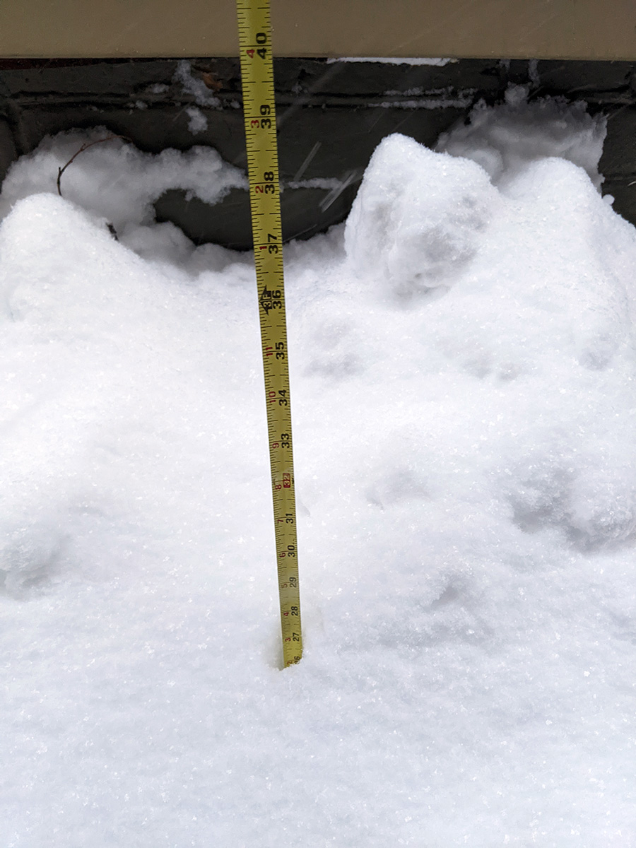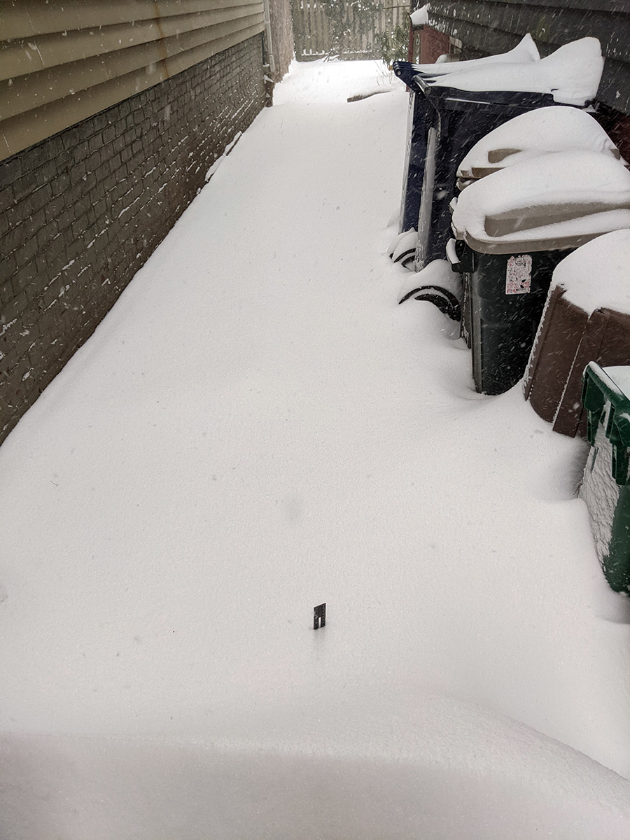 after i finished shoveling, i went out with a tape measure to do more measuring. the snow banks in our alleyway was up to 27 inches. the snow around the hydrangea patch was 12 inches. at the bottom of the backyard deck staircase 16 inches. finally the backyard snow cake measured 17 inches.