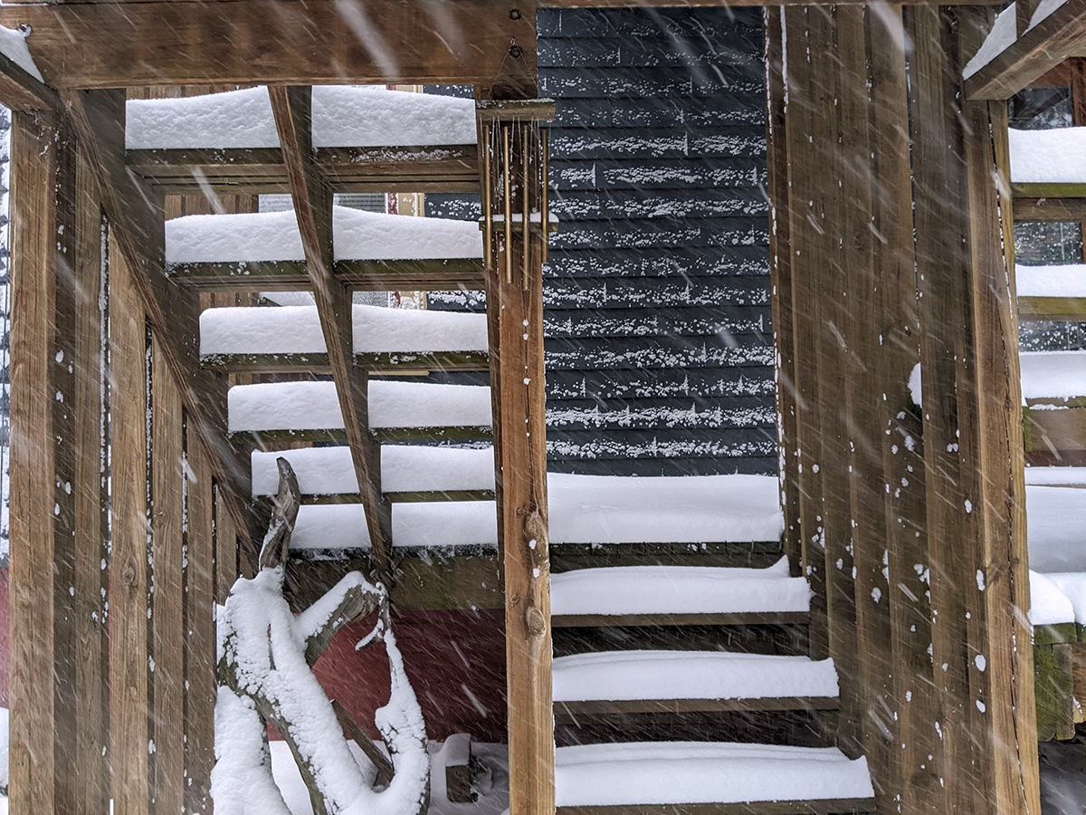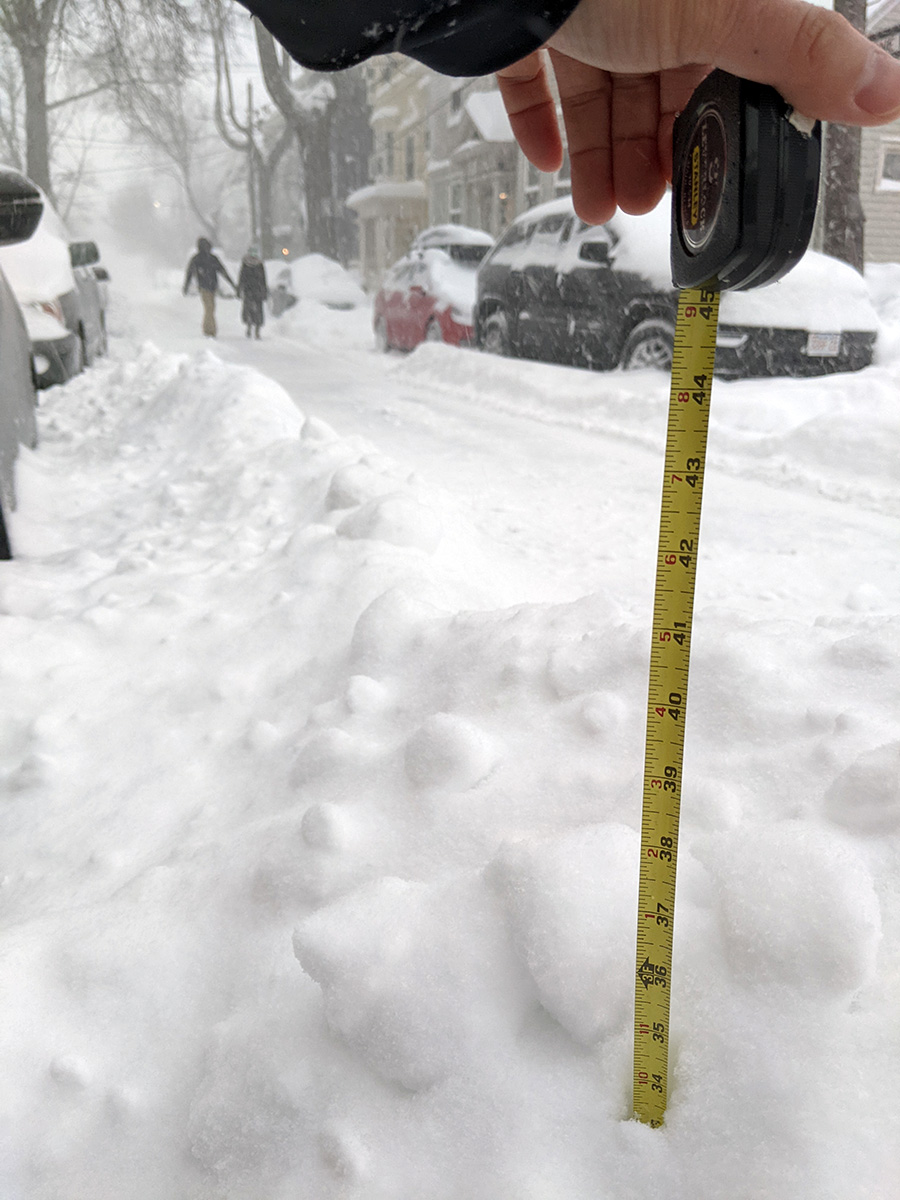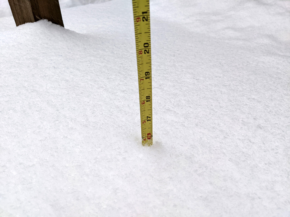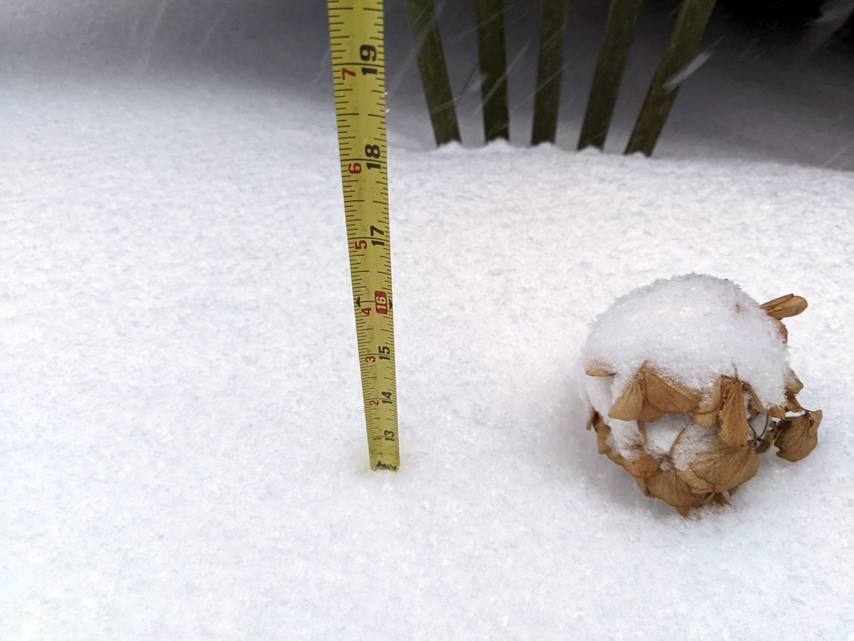 after i finished shoveling, i went out with a tape measure to do more measuring. the snow banks in our alleyway was up to 27 inches. the snow around the hydrangea patch was 12 inches. at the bottom of the backyard deck staircase 16 inches. finally the backyard snow cake measured 17 inches.