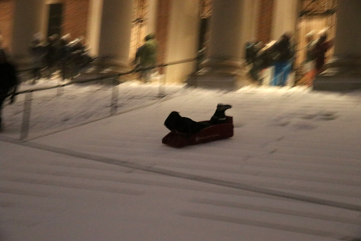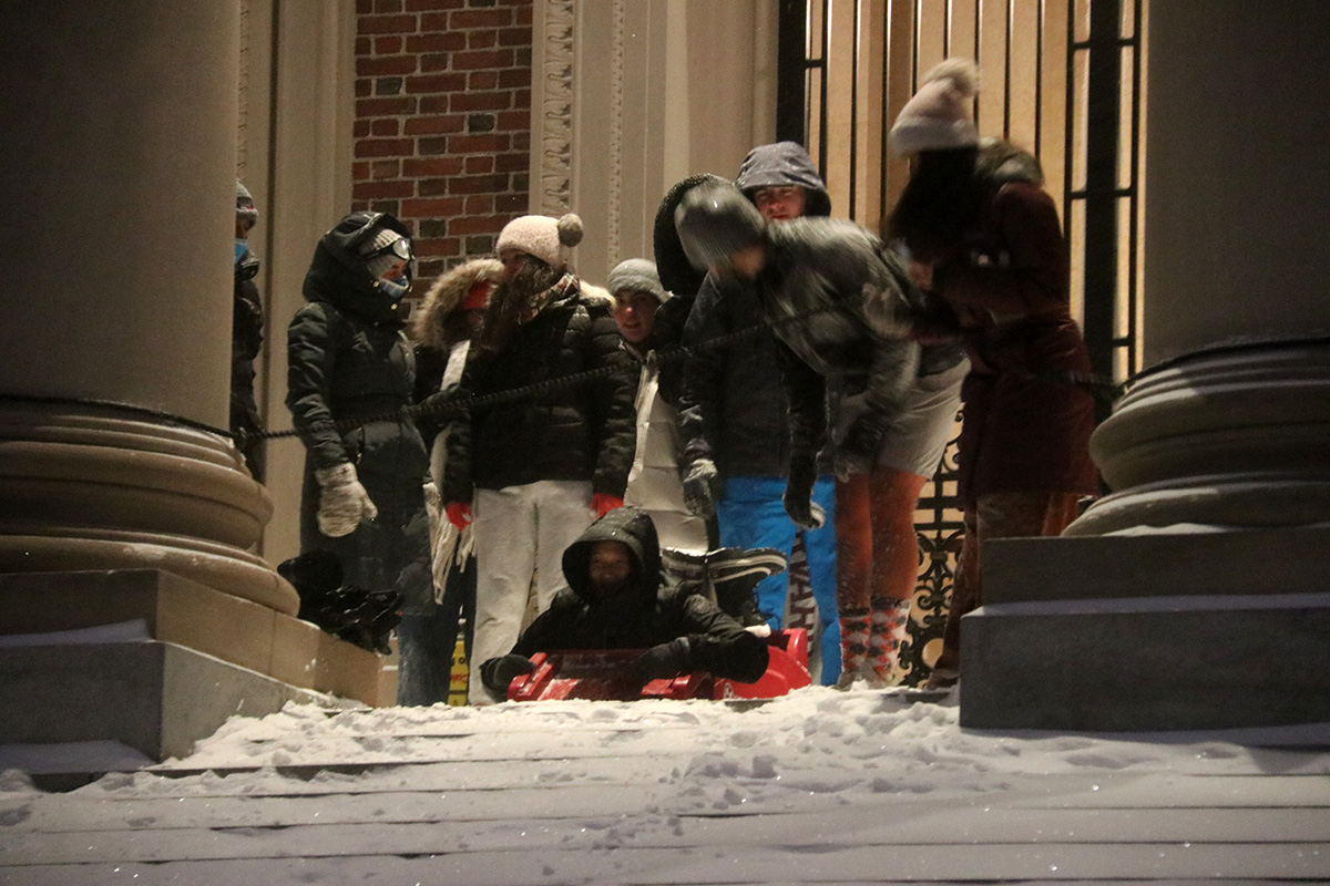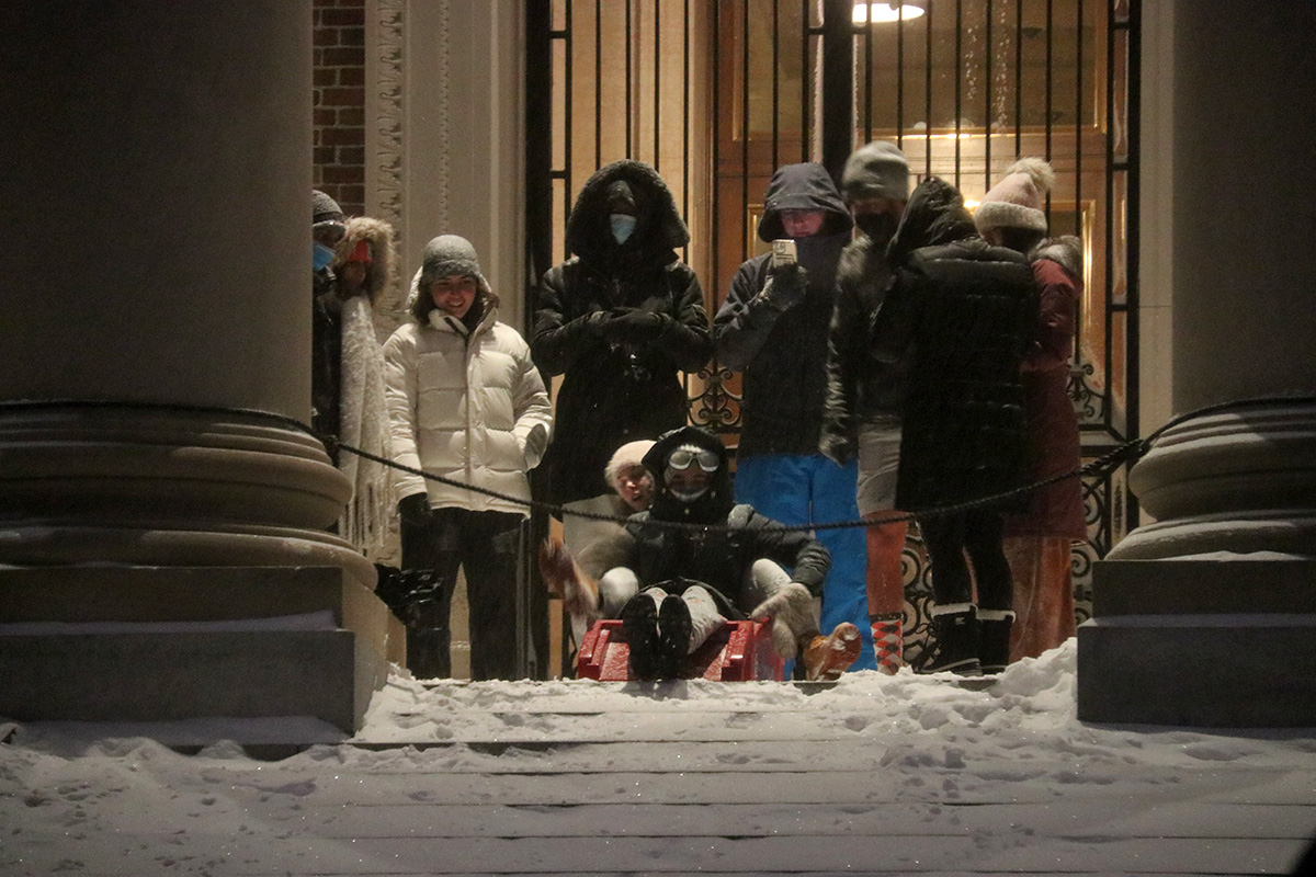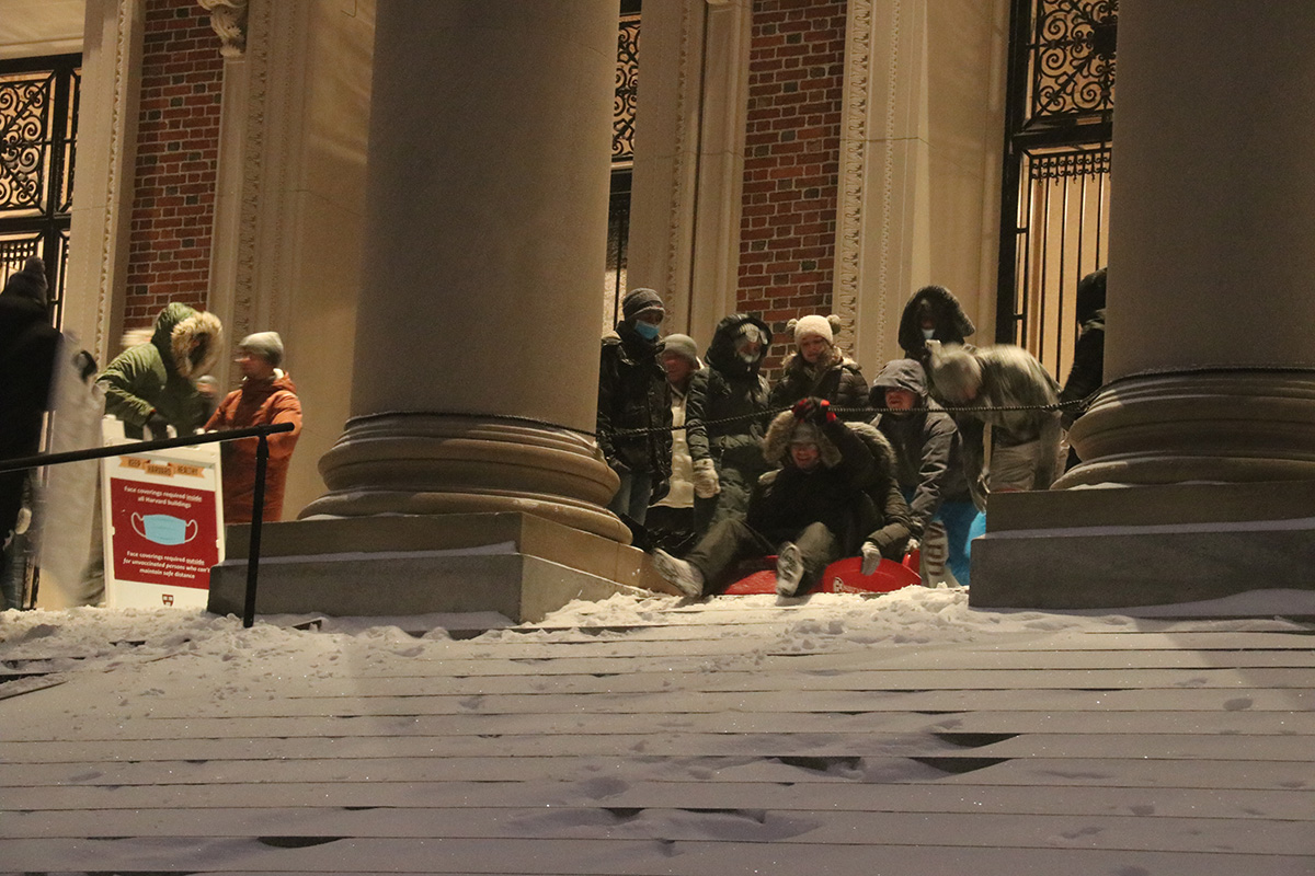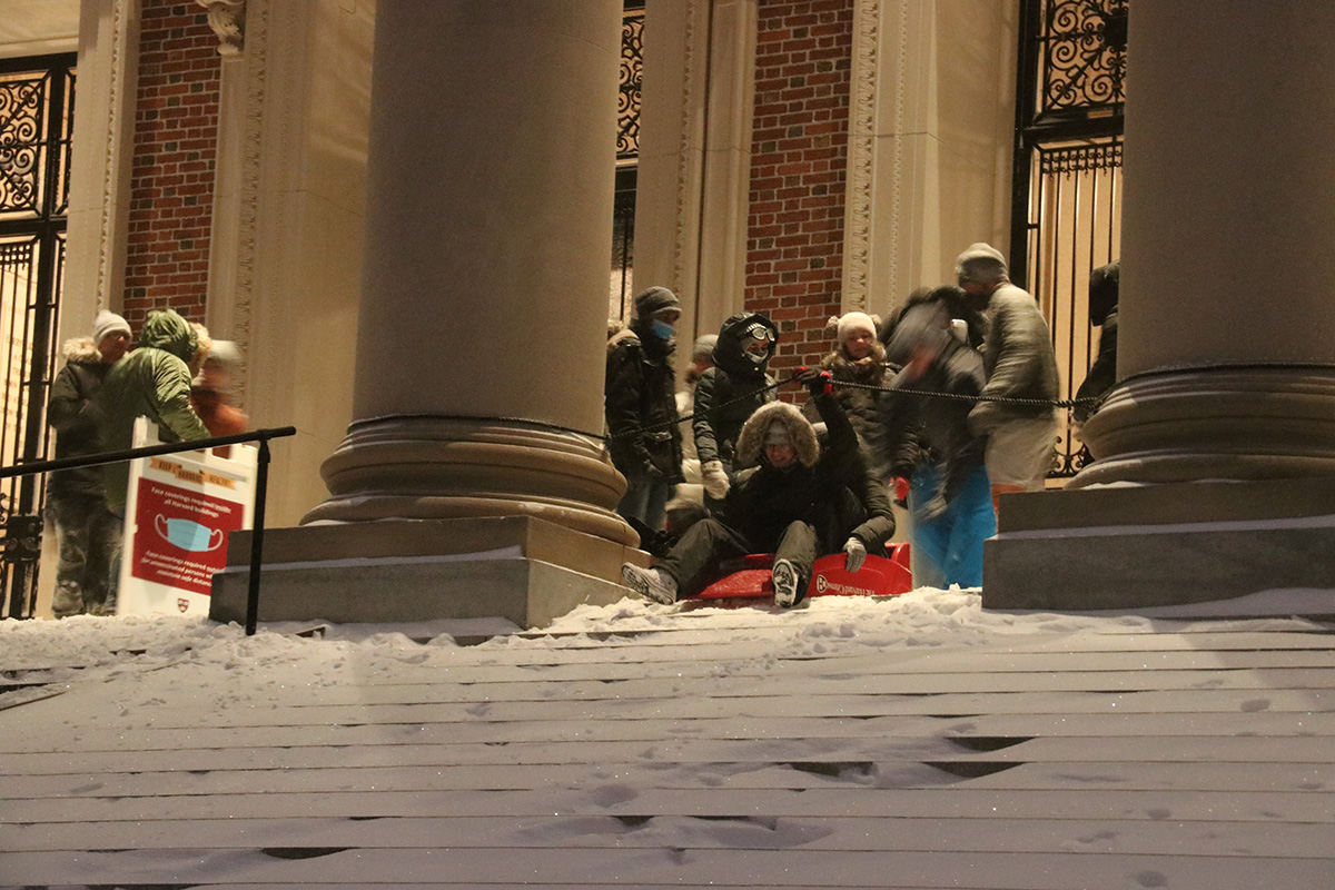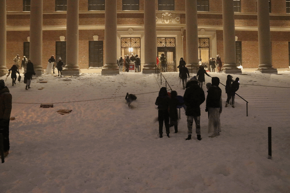 heading back through harvard square, i saw a group of over 100 students congregating outside the steps of the widener library. all that commotion was apparently because students were using the steps as a sledding hill. instead of sleds, they used whatever they could get their hands on, like sidewalk signs. it was a little weird seeing the brightest young minds in all of the world behaving like children. i was afraid somebody would get decapitated, because there was a metal chain across the front of the library specifically to prevent people from climbing the icy steps; students sledding down would push up the chain before they landed.