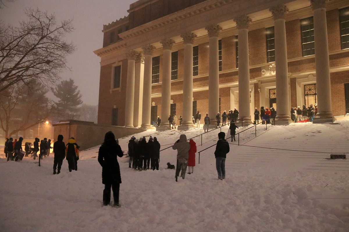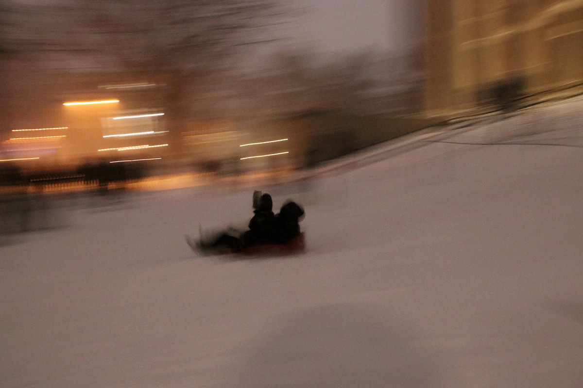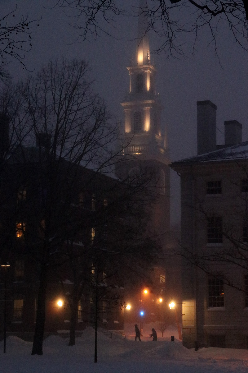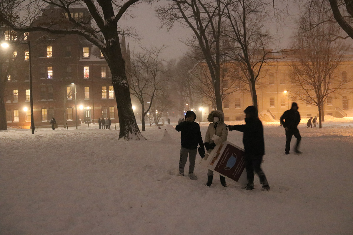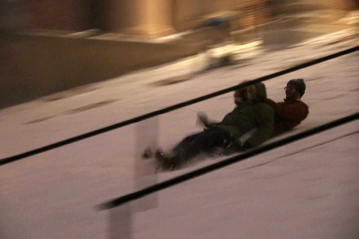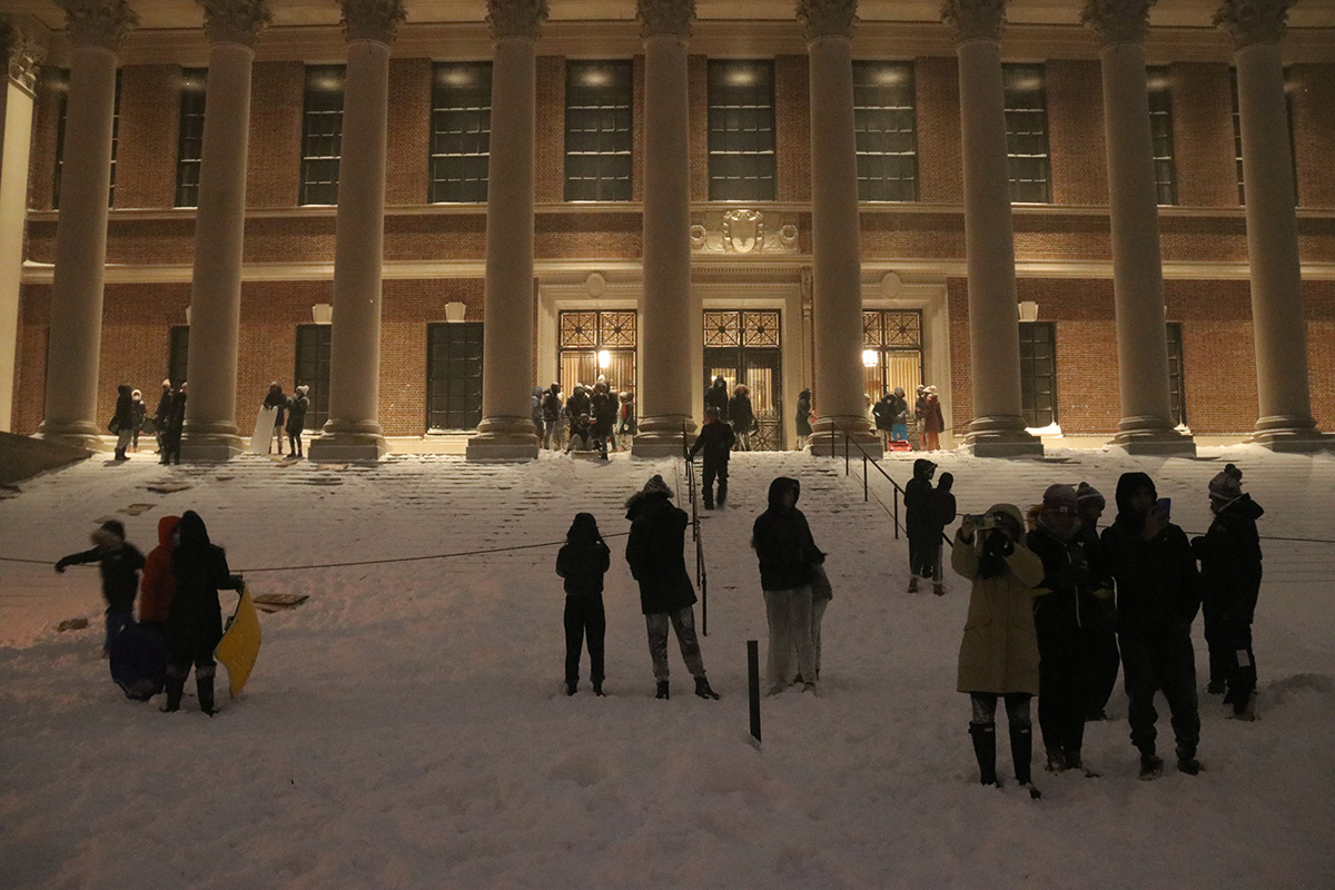 heading back through harvard square, i saw a group of over 100 students congregating outside the steps of the widener library. all that commotion was apparently because students were using the steps as a sledding hill. instead of sleds, they used whatever they could get their hands on, like sidewalk signs. it was a little weird seeing the brightest young minds in all of the world behaving like children. i was afraid somebody would get decapitated, because there was a metal chain across the front of the library specifically to prevent people from climbing the icy steps; students sledding down would push up the chain before they landed.