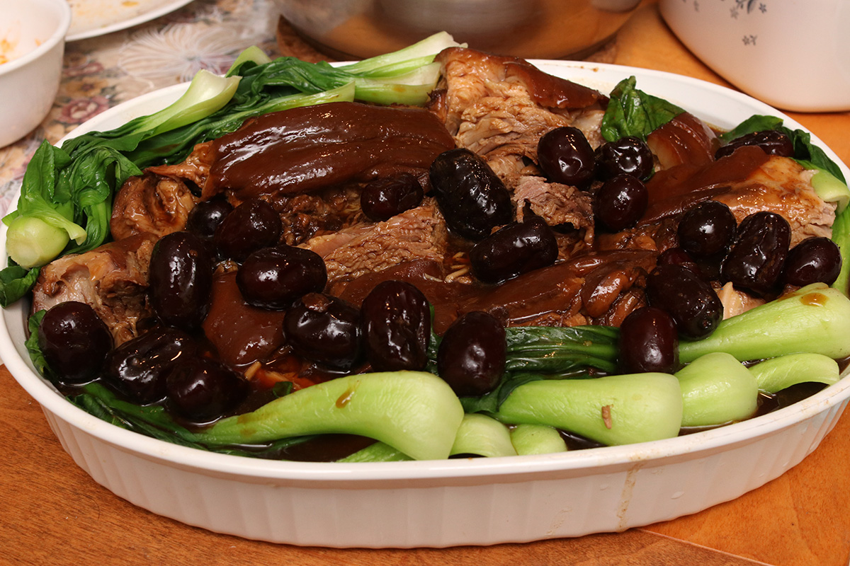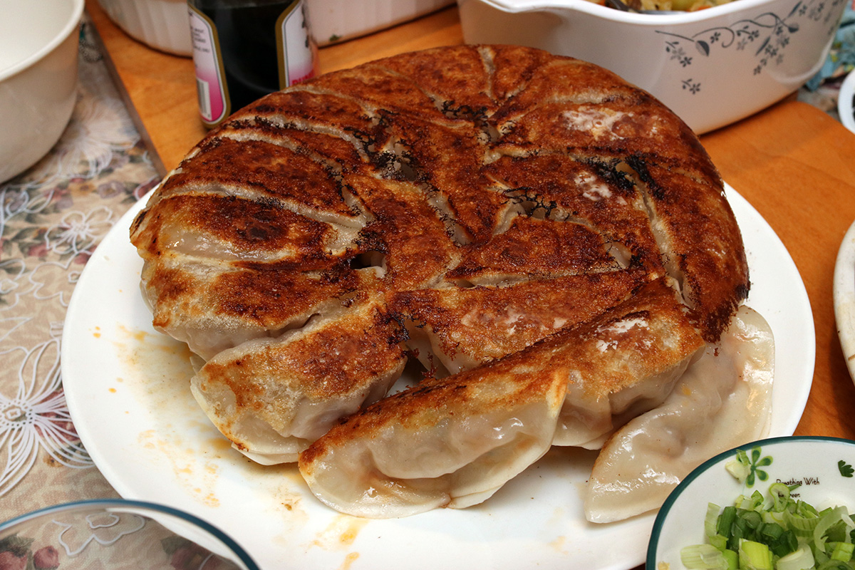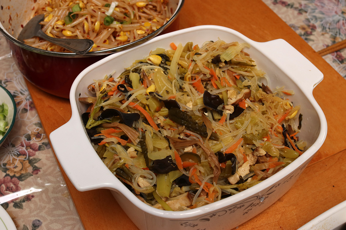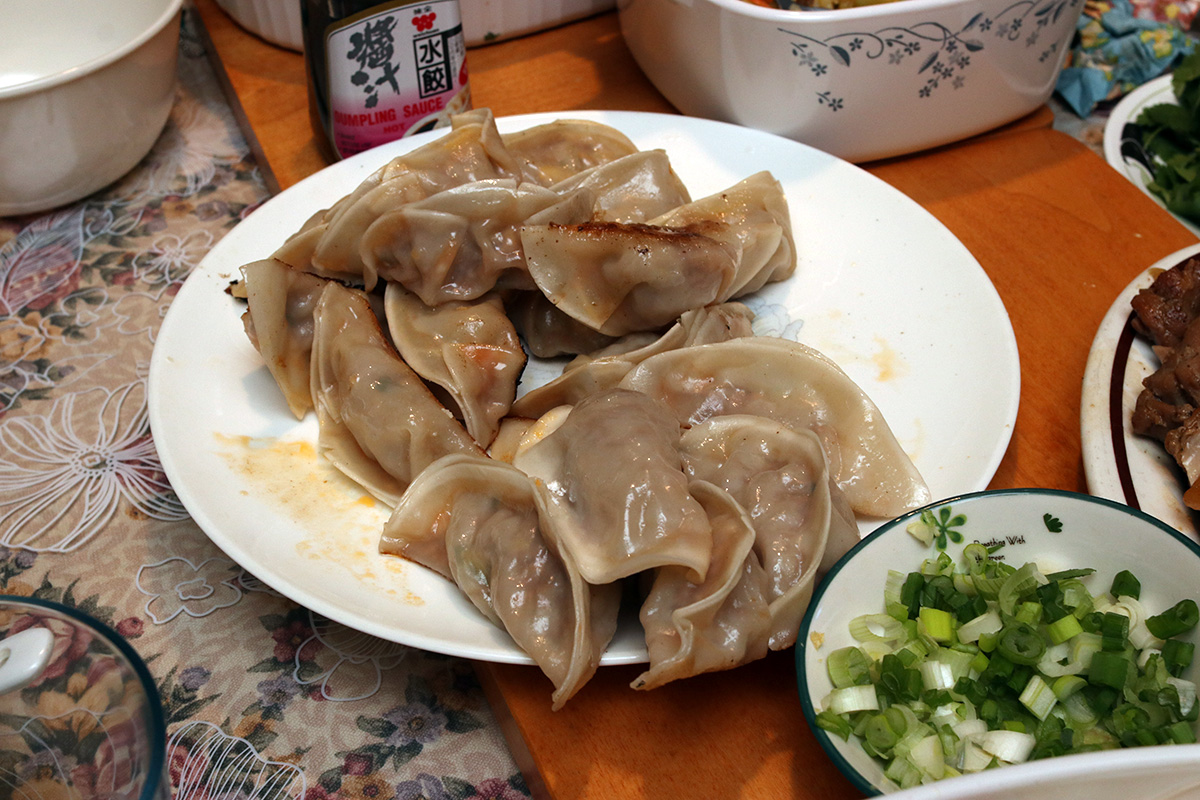 my father made a braised pork hock dish with sweet dates. my sister made these beef korean pan-fried dumplings (even though we were already having traditional chinese dumplings). my mother made a 15-ingredient dish, never seen that before. my parents also fried up some jumbo shrimps in the air fryer. i made some bean sprouts banchan and korean rice cakes.