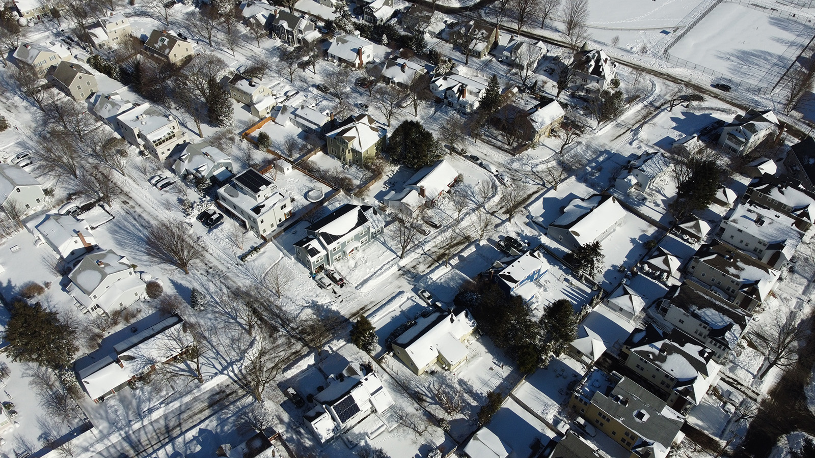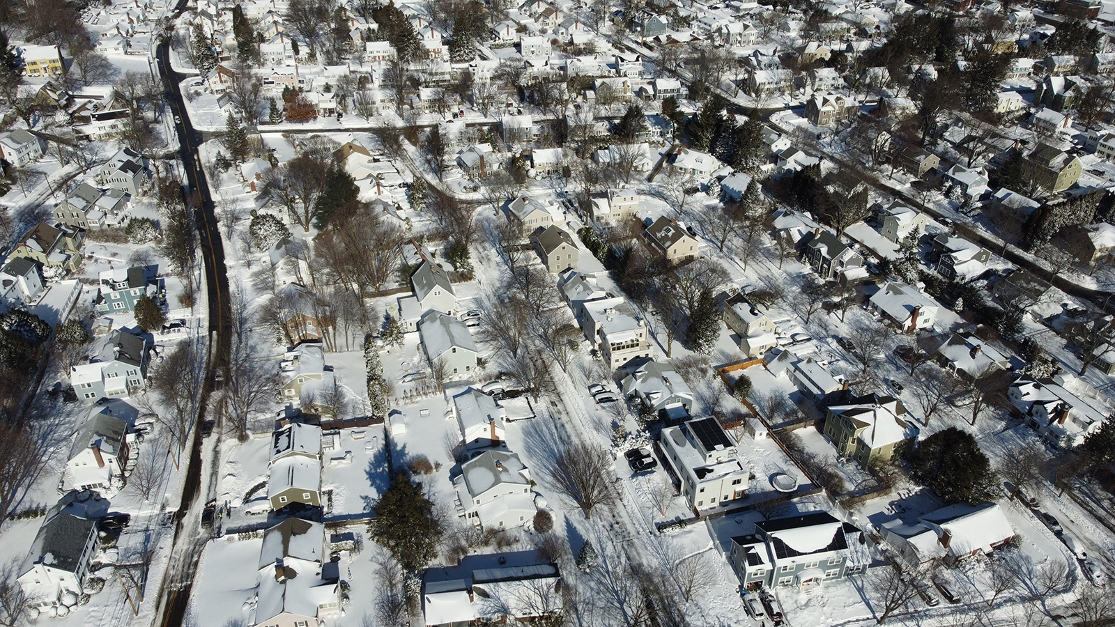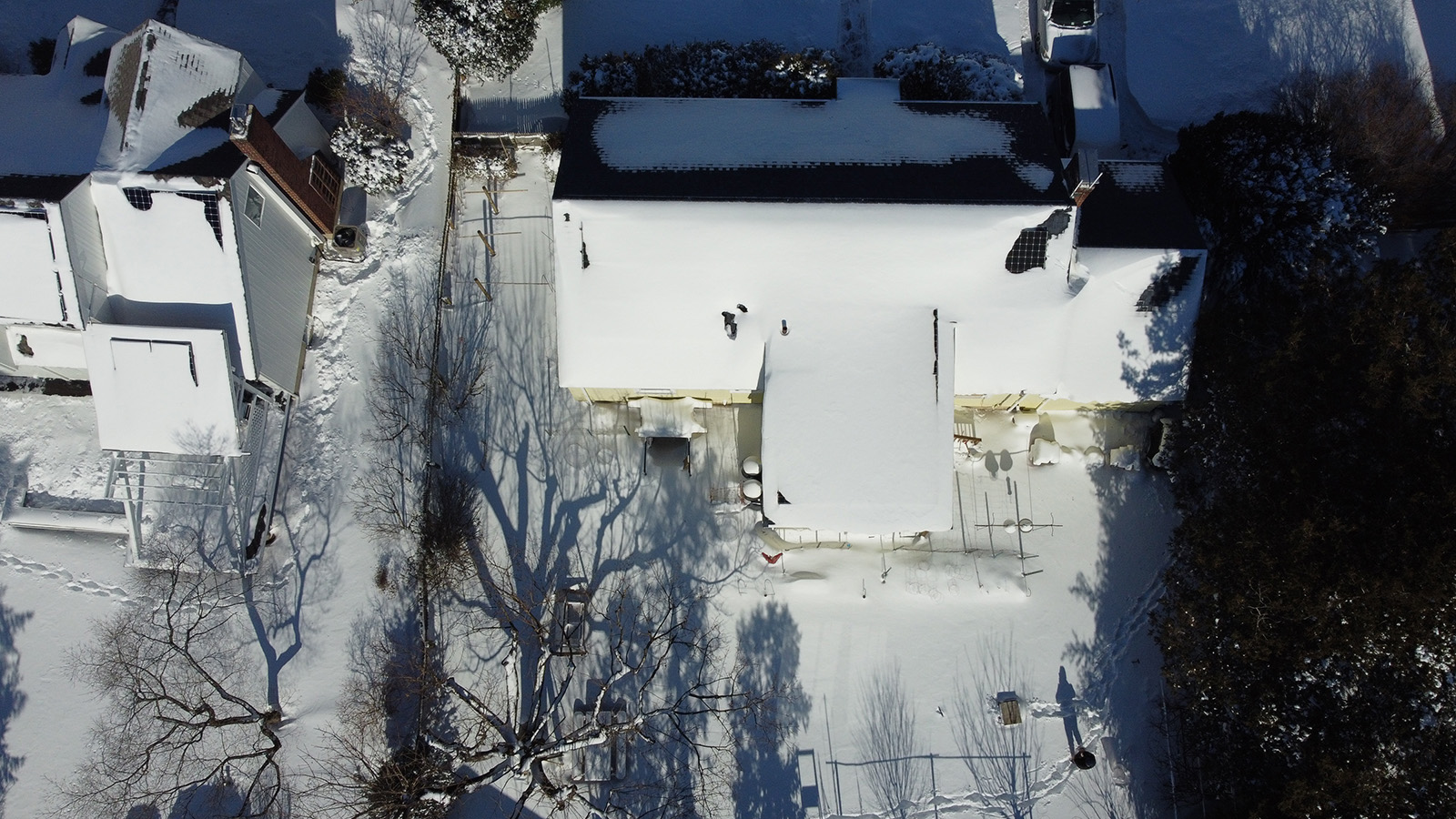 first thing i did when i got to belmont was send the drone into the air so i could inspect the solar panels on the roof. i noticed the red rain barrel by the corner of the sunroom had blown over. in the air, the south side of the roof was covered in snow except at the top corners. the north side of the roof barely had any snow on it due to the wind exposure.