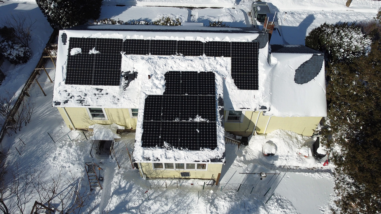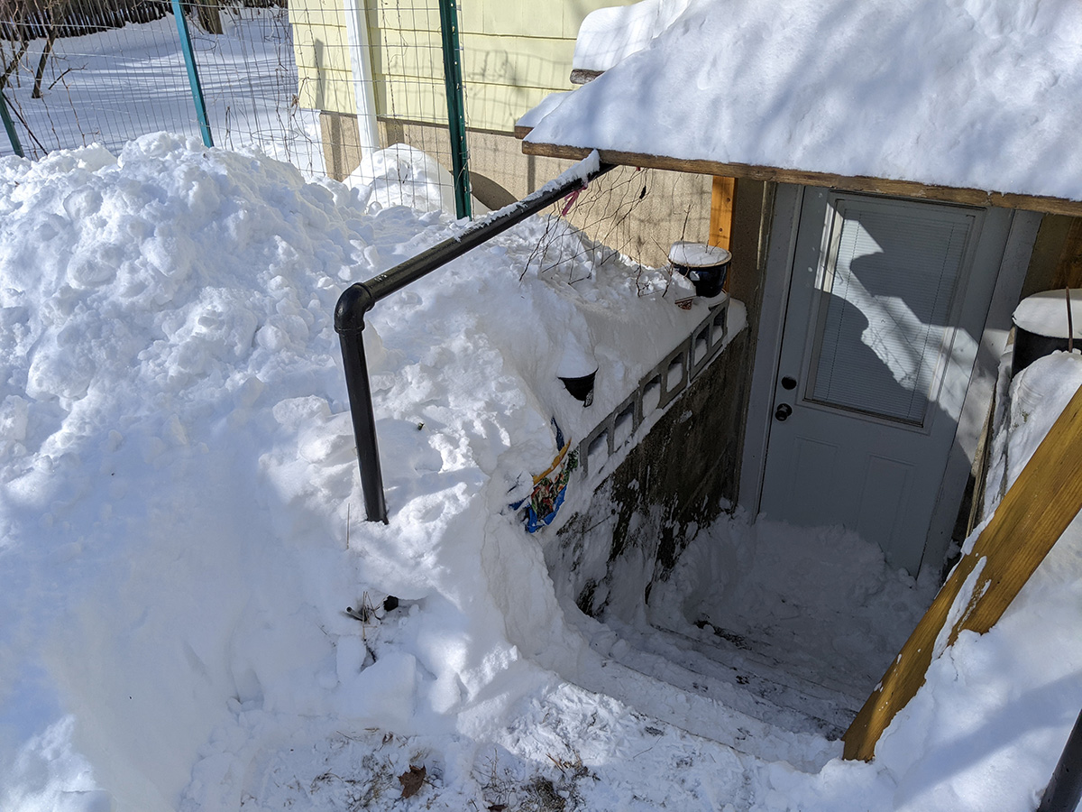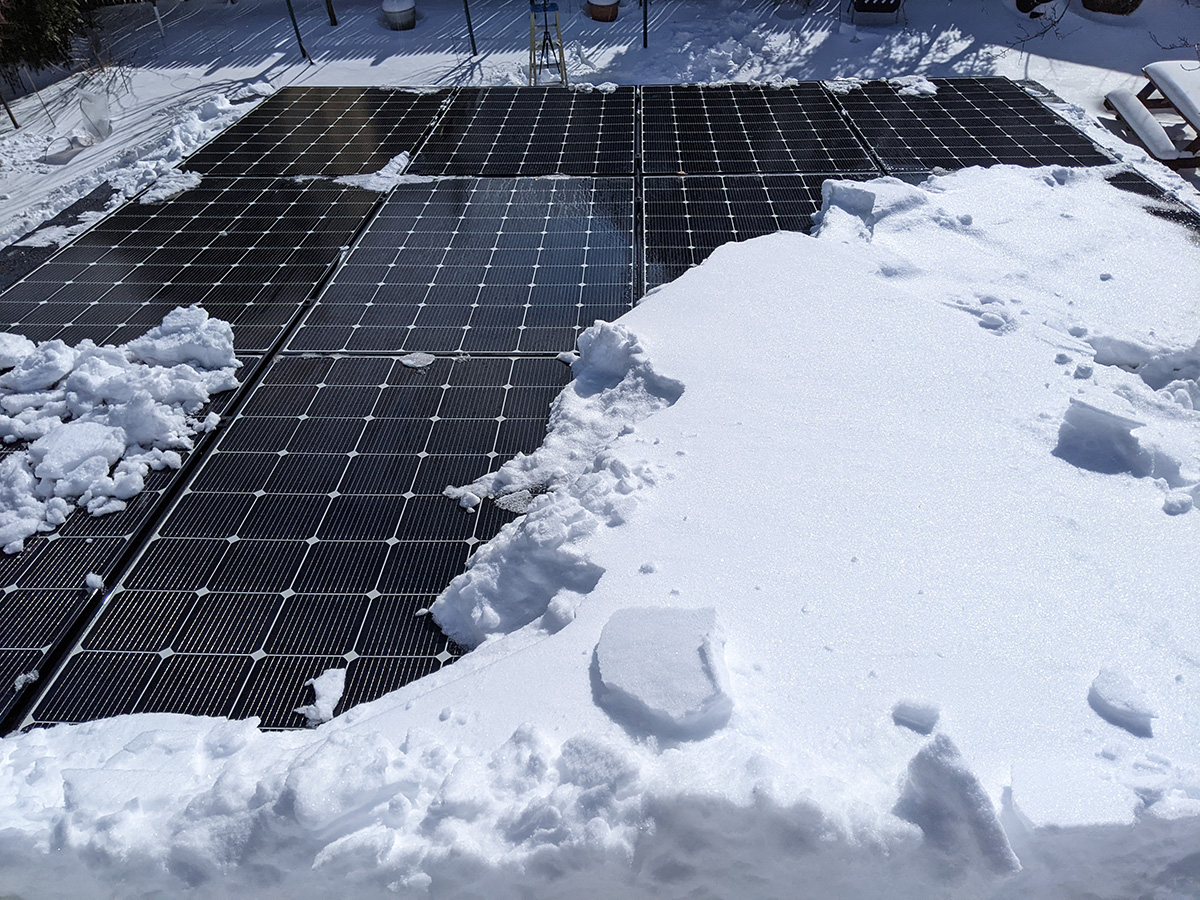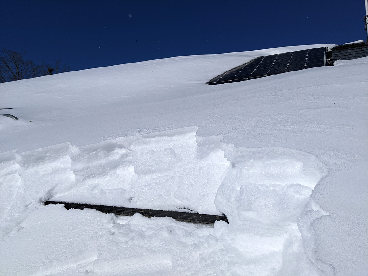 2 hours later we were finally done clearing the snow from the solar panels. but i stayed out for another half hour, digging out the roof snow that'd dumped into the basement stairwell; if we don't clear that area, the snow could melt and get into the basement. once that was all done, i finally sent the drone into the air on last time for a final inspection. there were still clumps of snow on the panels,