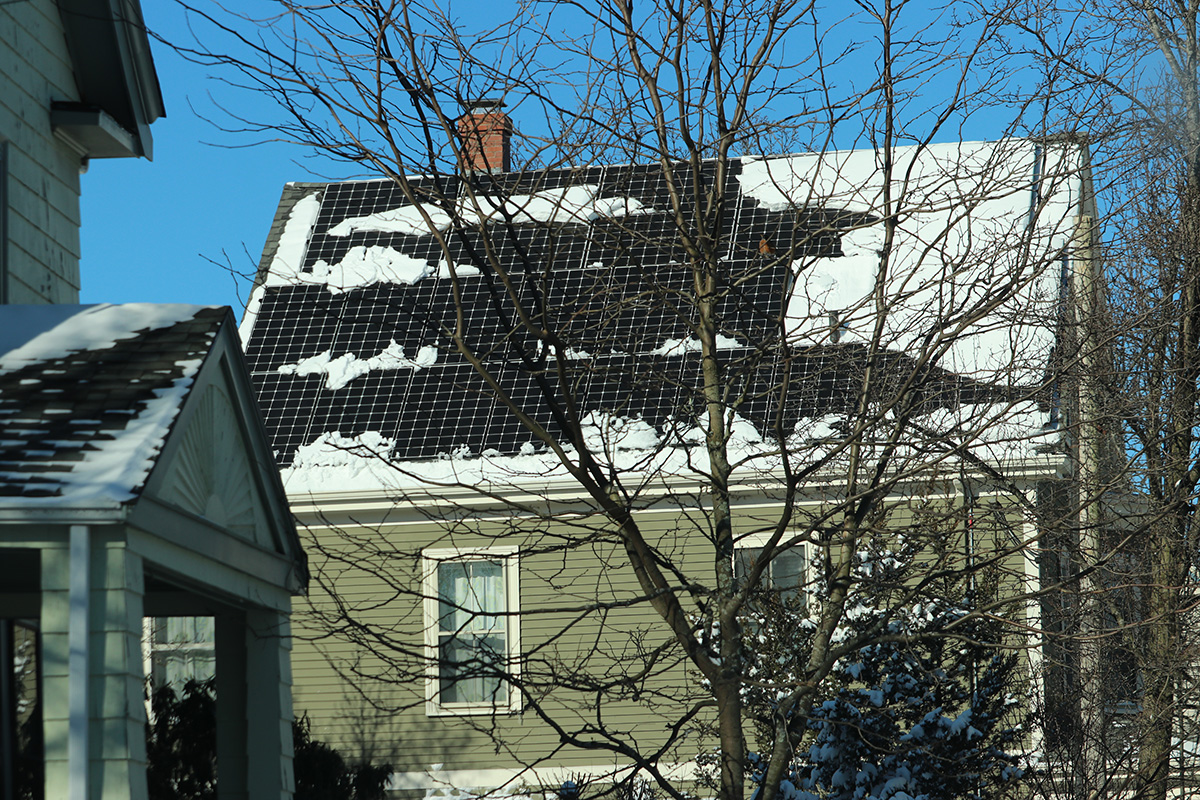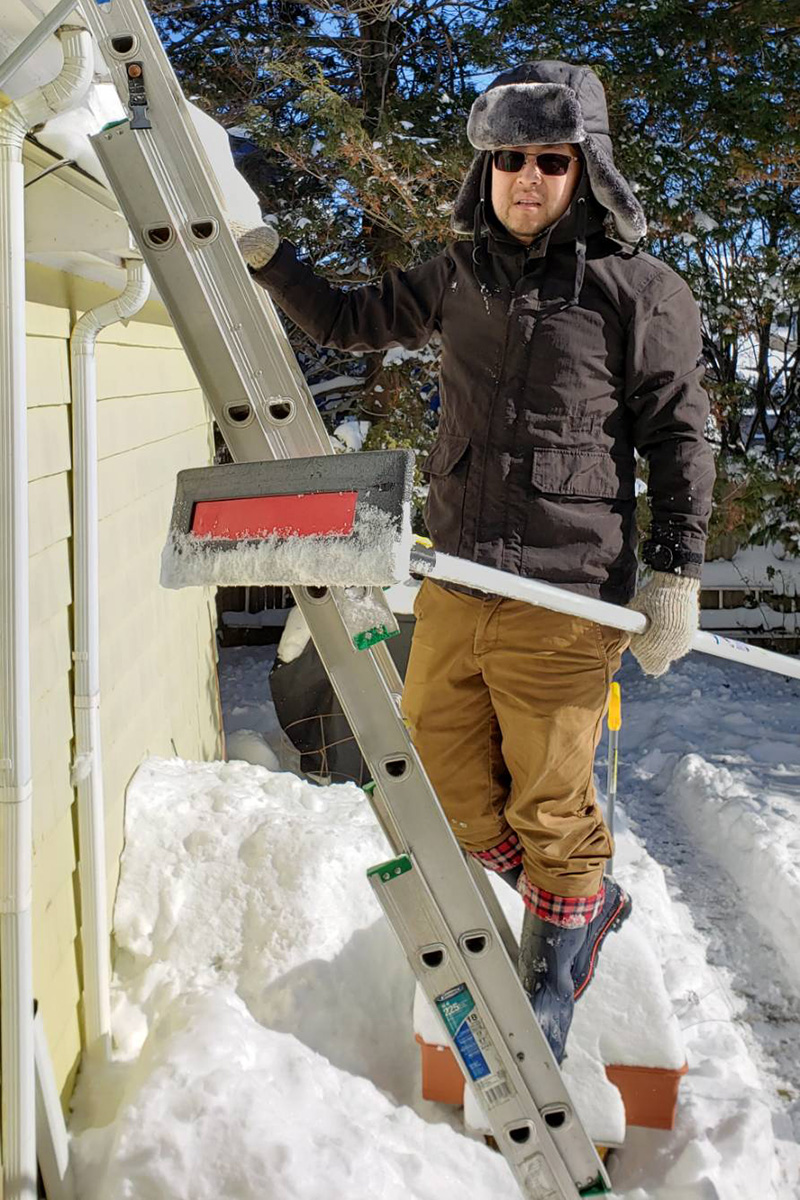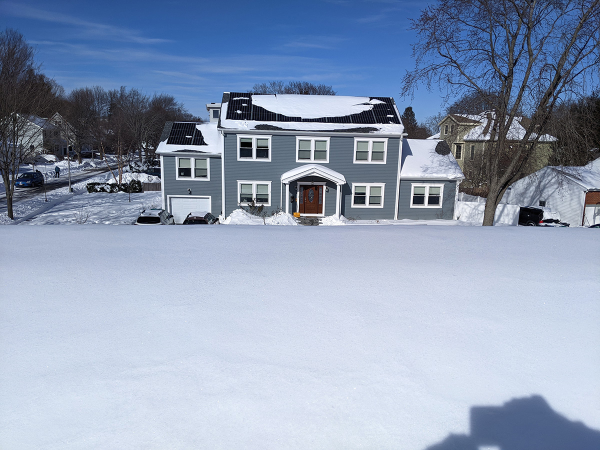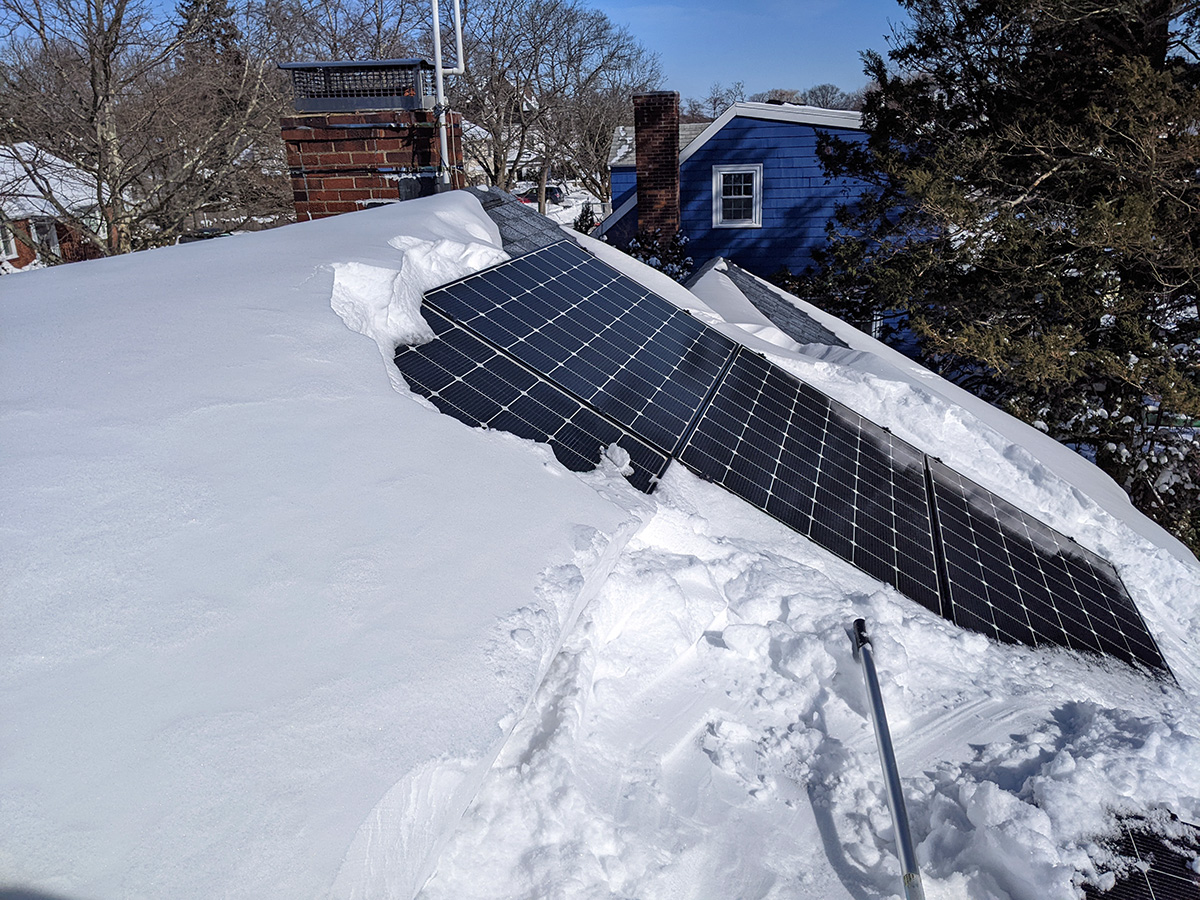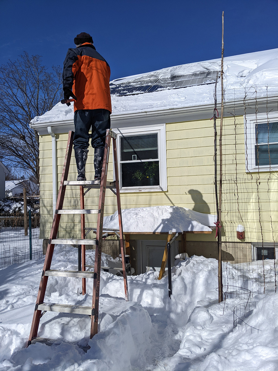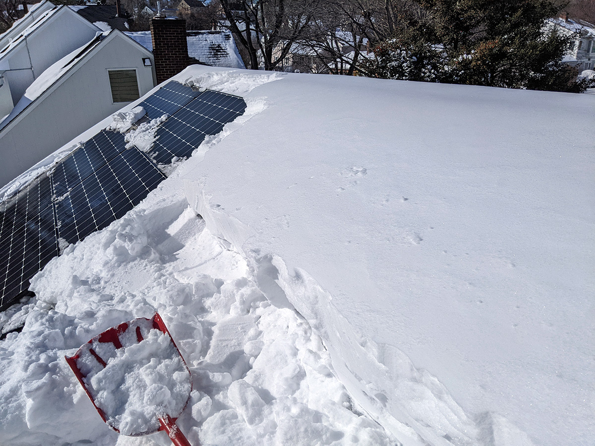 i cleared the snow from the eastern side of the roof before my father came out to help. the snow on the panels on the either side of the roof were easy to clean; it was the snow on the panels in the middle part of the roof that was difficult. we cleared as much as we could from just ladders and roof rakes, but eventually we had no choice but for me to climb onto the roof with a shovel to literally shovel the foot of snow that'd accumulated there.