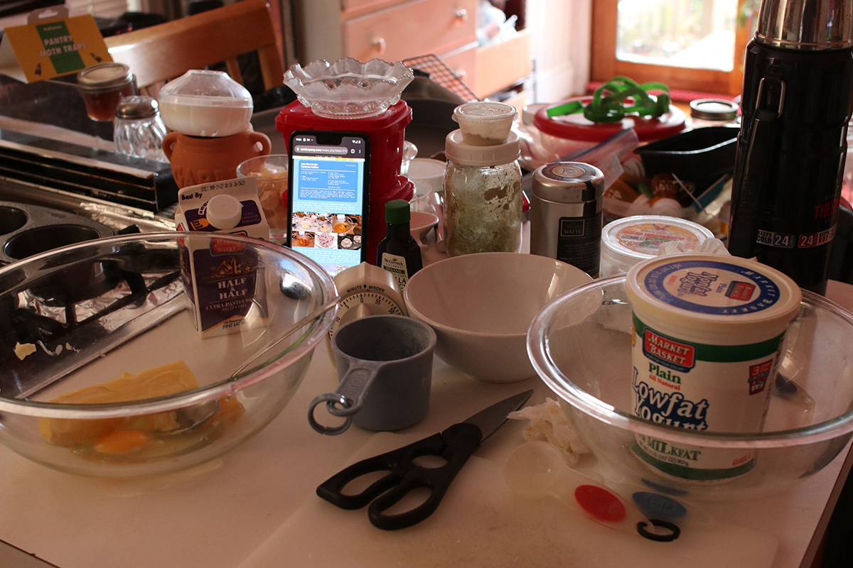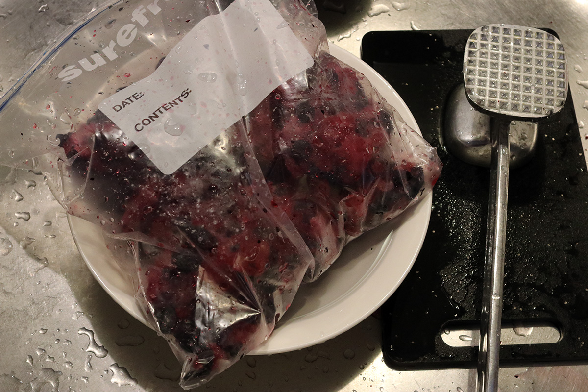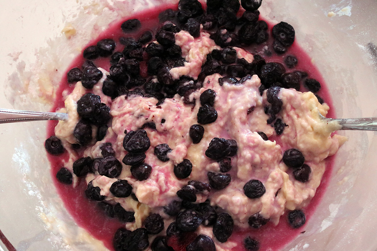 when it came time to add the blueberries, i realized this was a very old package, so much so that it was just a solid block of ice with blueberries embedded on the inside. i put the blueberry ice block in a ziploc bag and ran it under hot water, breaking apart the ice with my bare hands, sometimes with a meat tenderizing, making a mess of purple blueberry juice all over the sink. i finally had enough blueberries to fill 2 cups. in hindsight, that was probably too much blueberries, since i usually use frozen. 2 cups of thawed soft blueberries is more like 4 cups of blueberries.