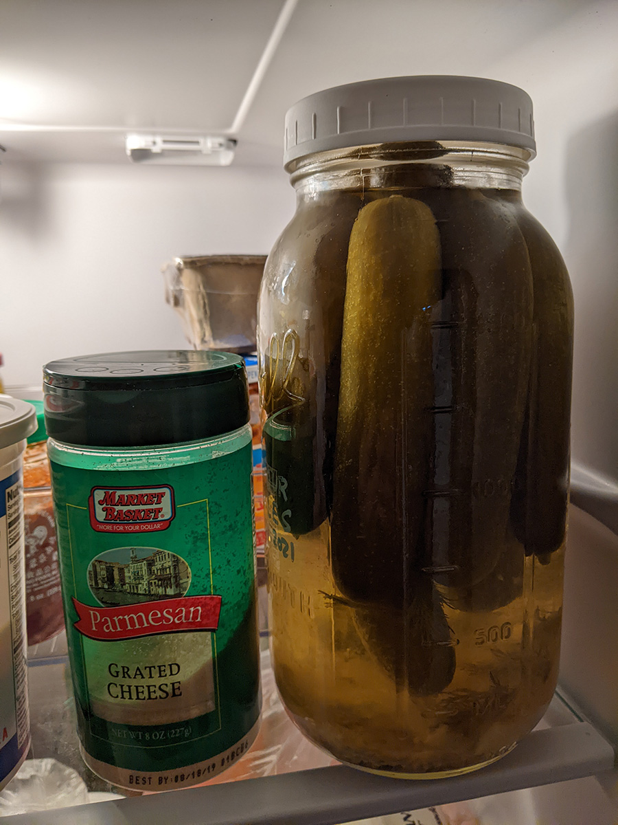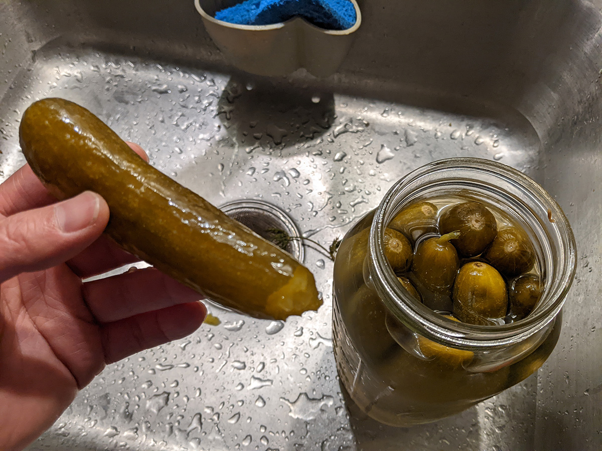 i had a craving for pickles and finally opened my jar of half sour pickles. i pulled one out and i already knew something was off: instead of a crispy pickle, this one was soft and water-logged. in fact, they were all like that. i made these back in september, apparently you can't keep them for over 5 months and expect them to be still crispy. i should've ate them soon after they'd already fermented for a few days. at least i know how to make them again if i ever come across some small pickles.