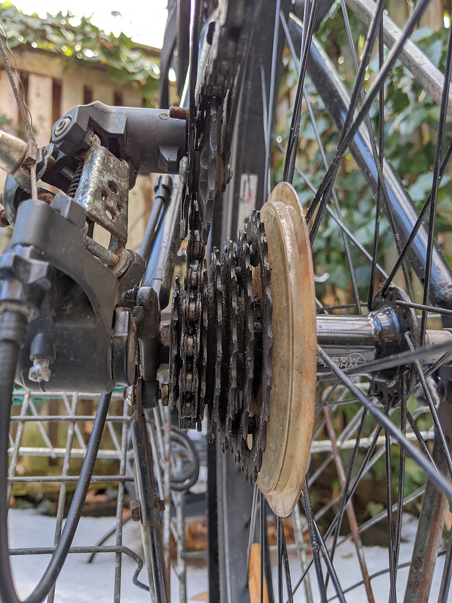i dragged my bicycle into the backyard to see what was causing the rattling sound when i changed gears. the noise only happened when i was in 7th gear, it looked like the chain wasn't properly aligned. i tried bending the rear derailleur but the sound was still there. i cleaned the derailleur cogs and fiddled around with the bike some more to make it less noisy. i was ready to call it quits when i noticed something: there was a loose screw that was rattling inside the rear cassette. it's a screw that's holding the nut of a fender strut. i totally don't need it and the screw already fell off on the other side a long time ago. i ended up taking off the rear wheel to fish the loose screw out and that fixed the rattling sound. i wiped clean the chain and oiled it before putting my bike away.