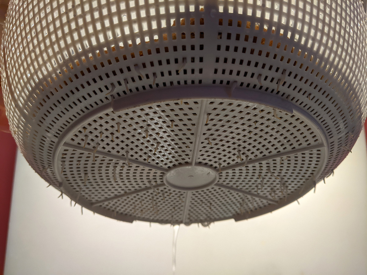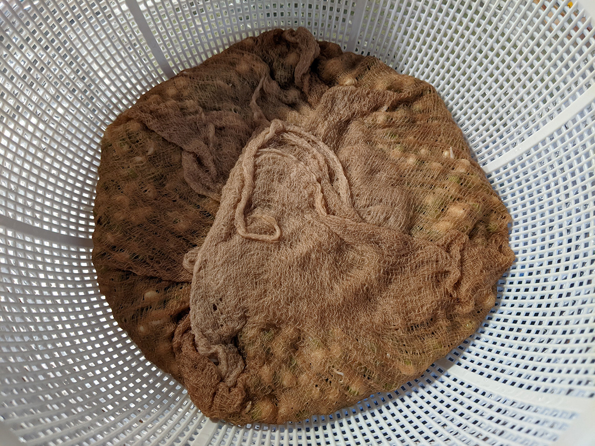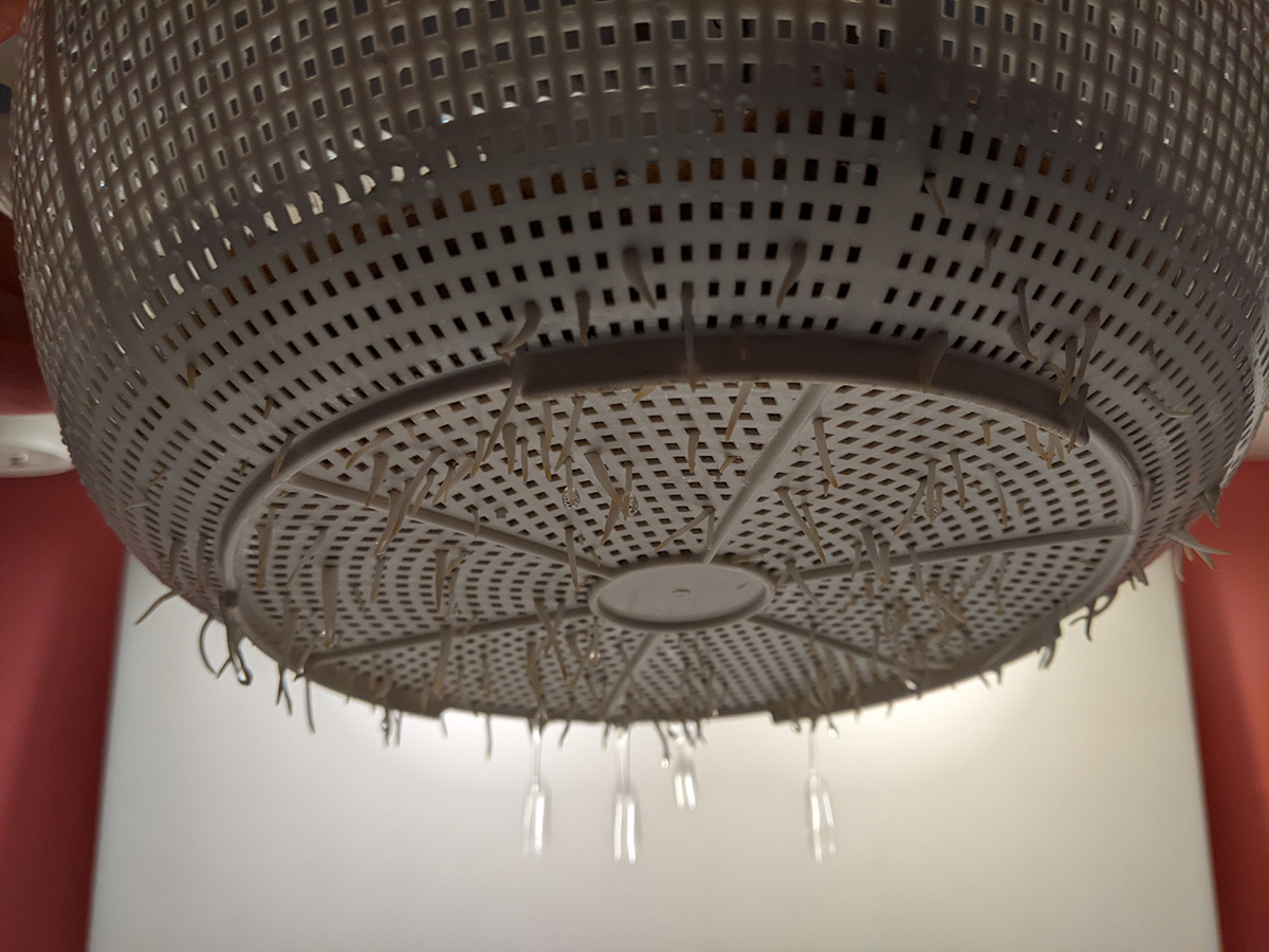 this morning marks the official first full day of mung bean sprouting (day 1). i brought it out to the kitchen sink (10:30am) so i could water the beans. tiny roots were already starting to poke out through the plastic colander. in my previous attempt, that didn't happen until day 3.
