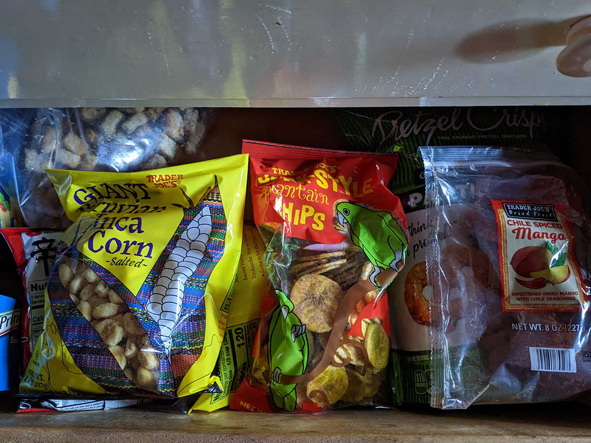 my mother was happy to receive the muffins, gave her an excuse to have some coffee. i left soon afterwards, went to the fresh pond trader joe's to get some snacks. there are so many trader joe's near me, besides the one on fresh pond, there's also the one along memorial drive in cambridgeport and the one in allston next to the harvard stadium. only the harvard one sells alcohol. i left with some giant inca corn, spicy plantain chips, and chile mango slices.