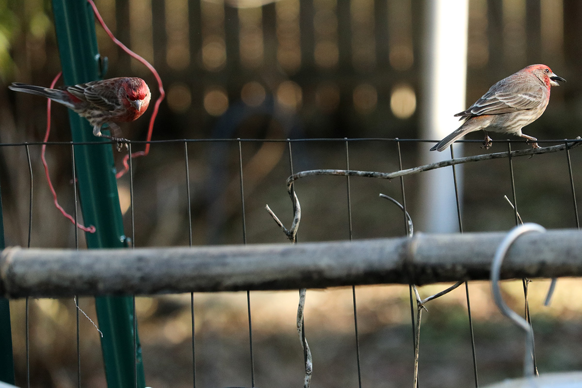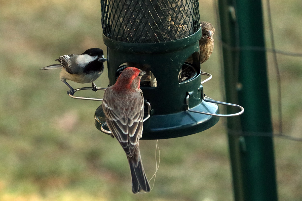 there was a myriad of birds visiting the feeder today: mourning doves, juncos, chickadees, house finches, song sparrows, bluejays. i didn't see any white-throated sparrows but there's definitely a few that lives in the neighborhood. i haven't seen nuthatches in while either, maybe once or twice all winter, i wonder if they moved elsewhere, or found better things to eat. i saw a chickadee go into the double caged suet feeder, but it was just investigating, i think they prefer the sunflower seeds more (grabbing one and flying away) because they like to eat privately, not out in the open. i thought there was only a single pair of house finches in the neighborhood, but i saw two pairs today.