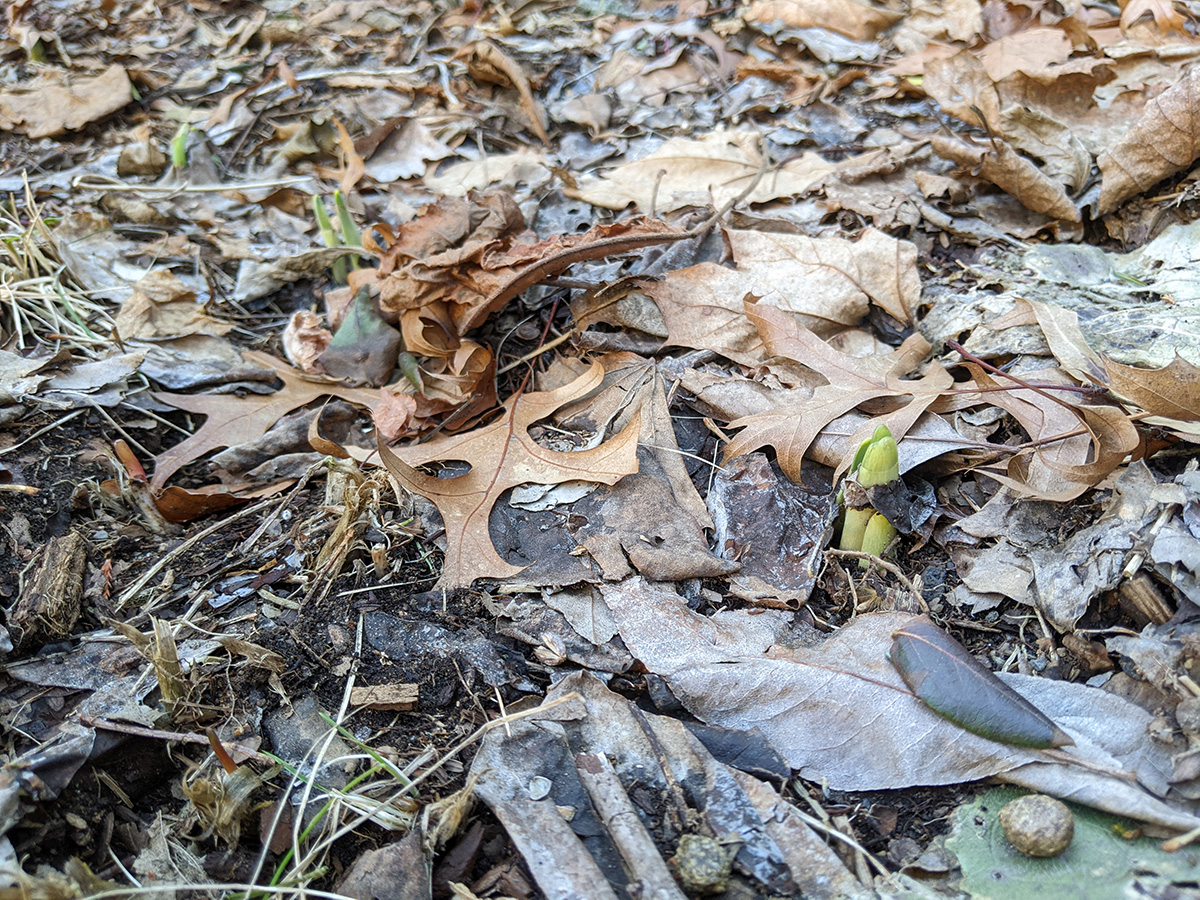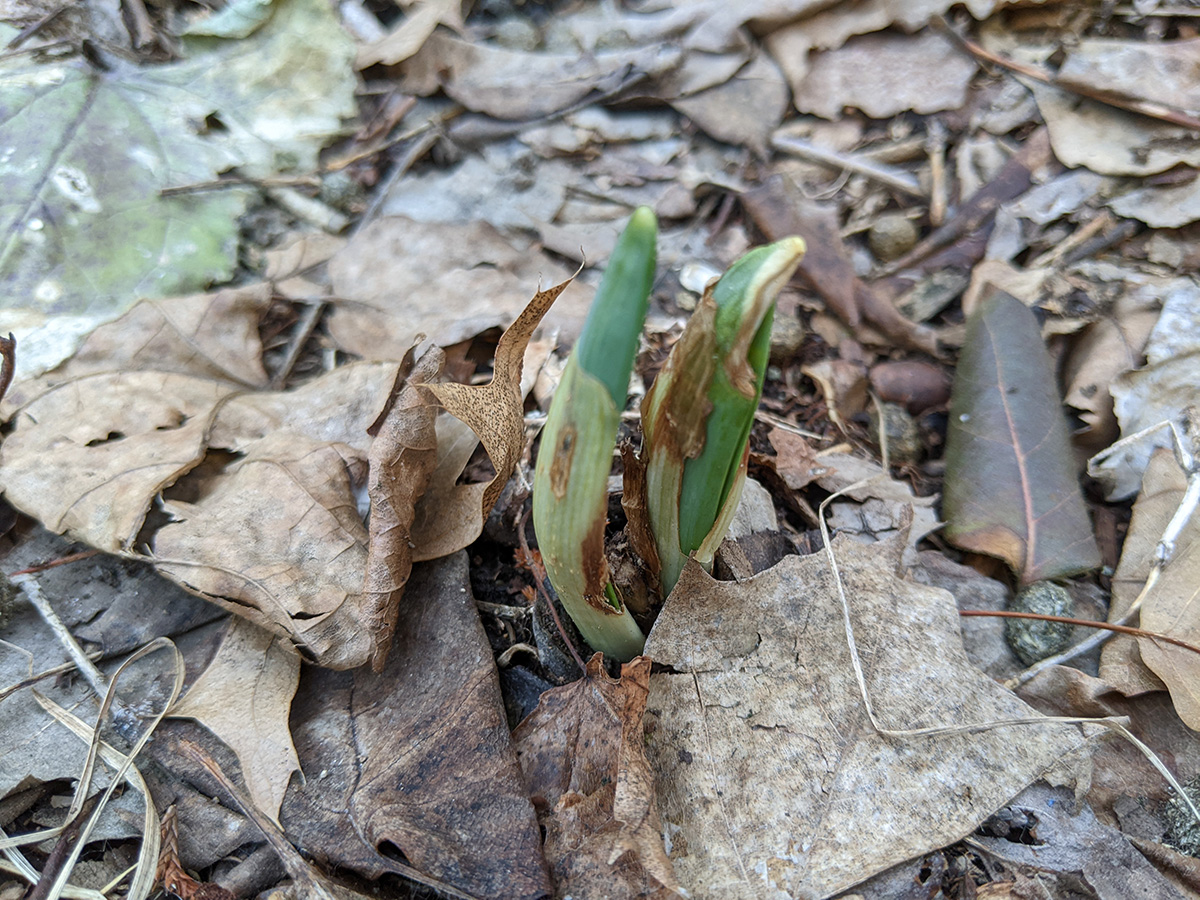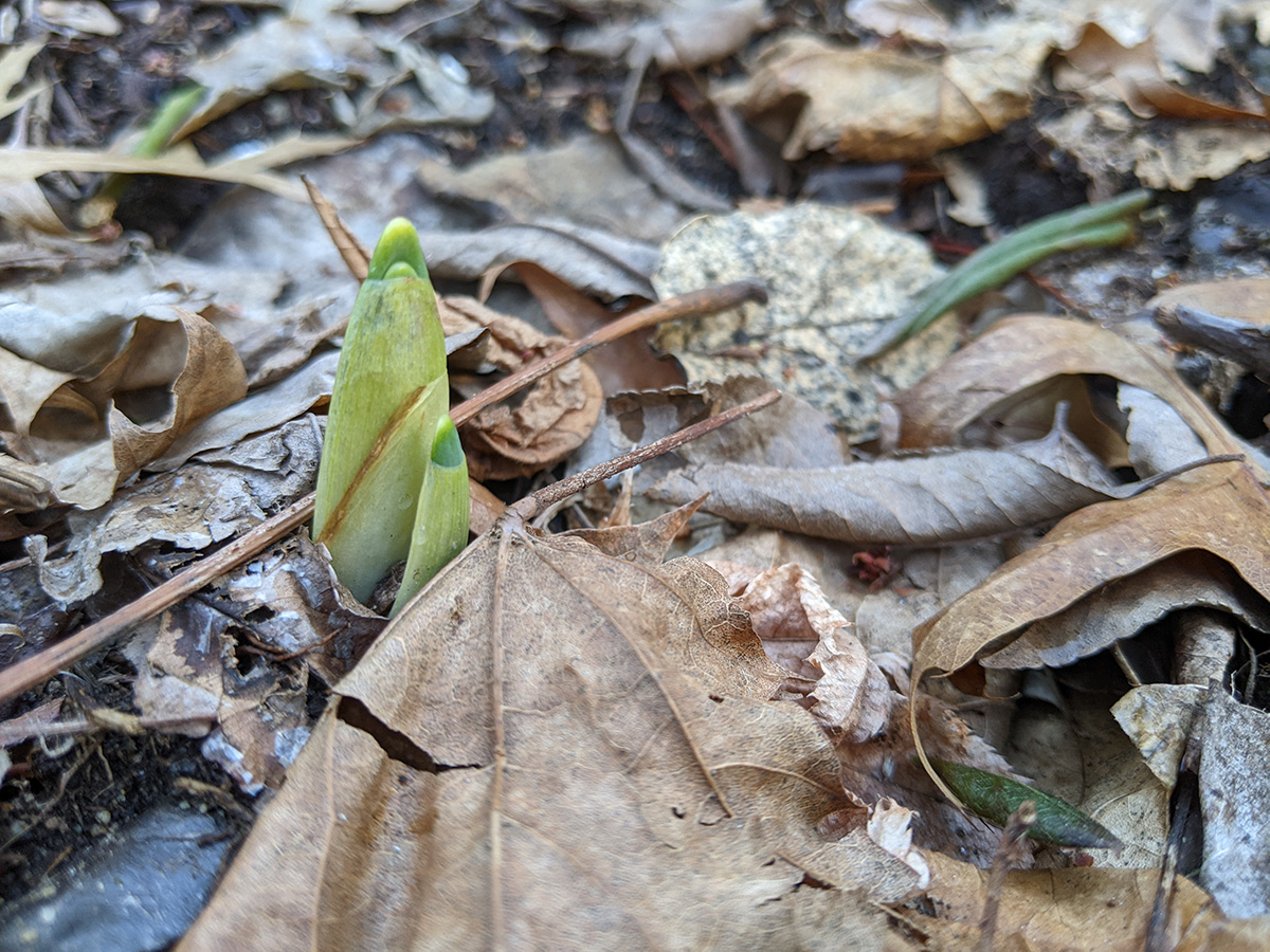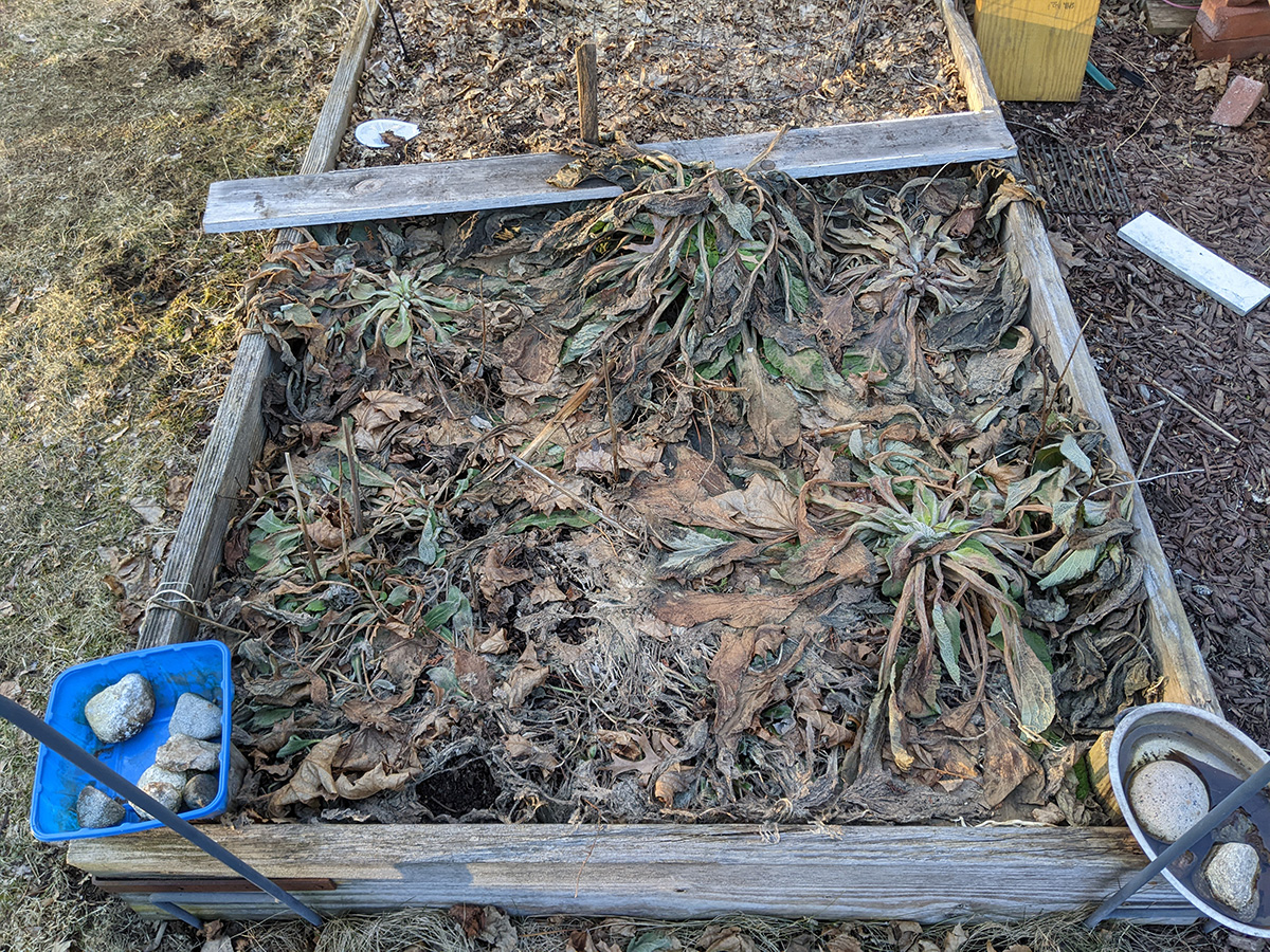 on the western side of the yard, perennial bulbs are starting to push out of the ground. the daffodils we divided and replanted in a long row are emerging. i saw saw some crocus leaves (though those need to be protected, rabbits love eating them). surprisingly, the daikons are still alive. they're totally not edible now, but even if i wanted to dig them up i can't as the ground is still frozen.