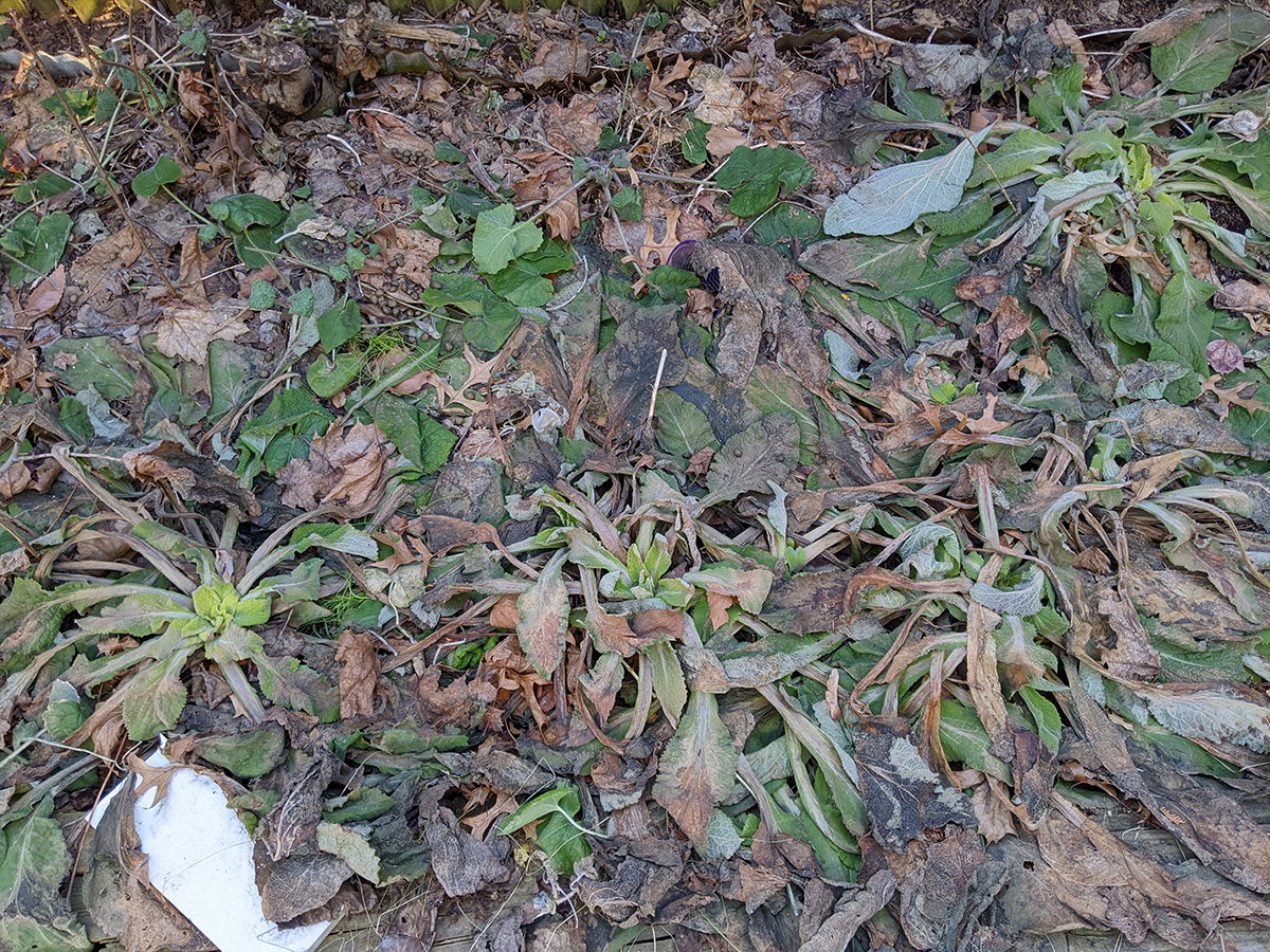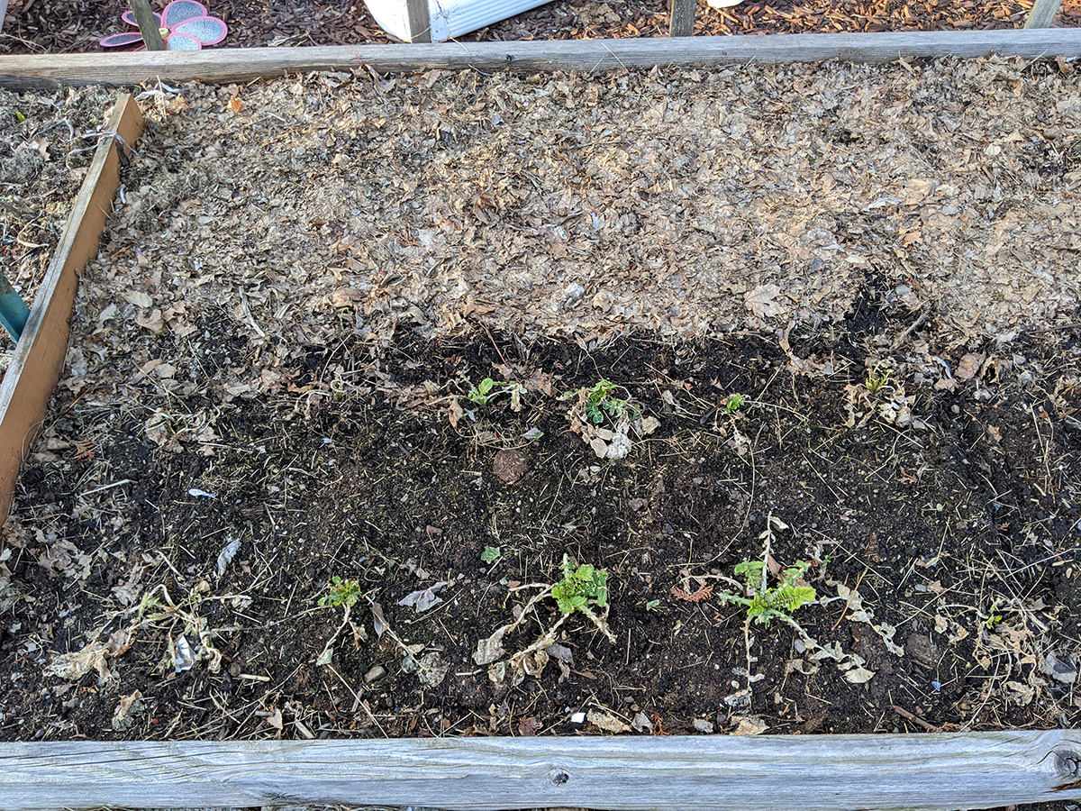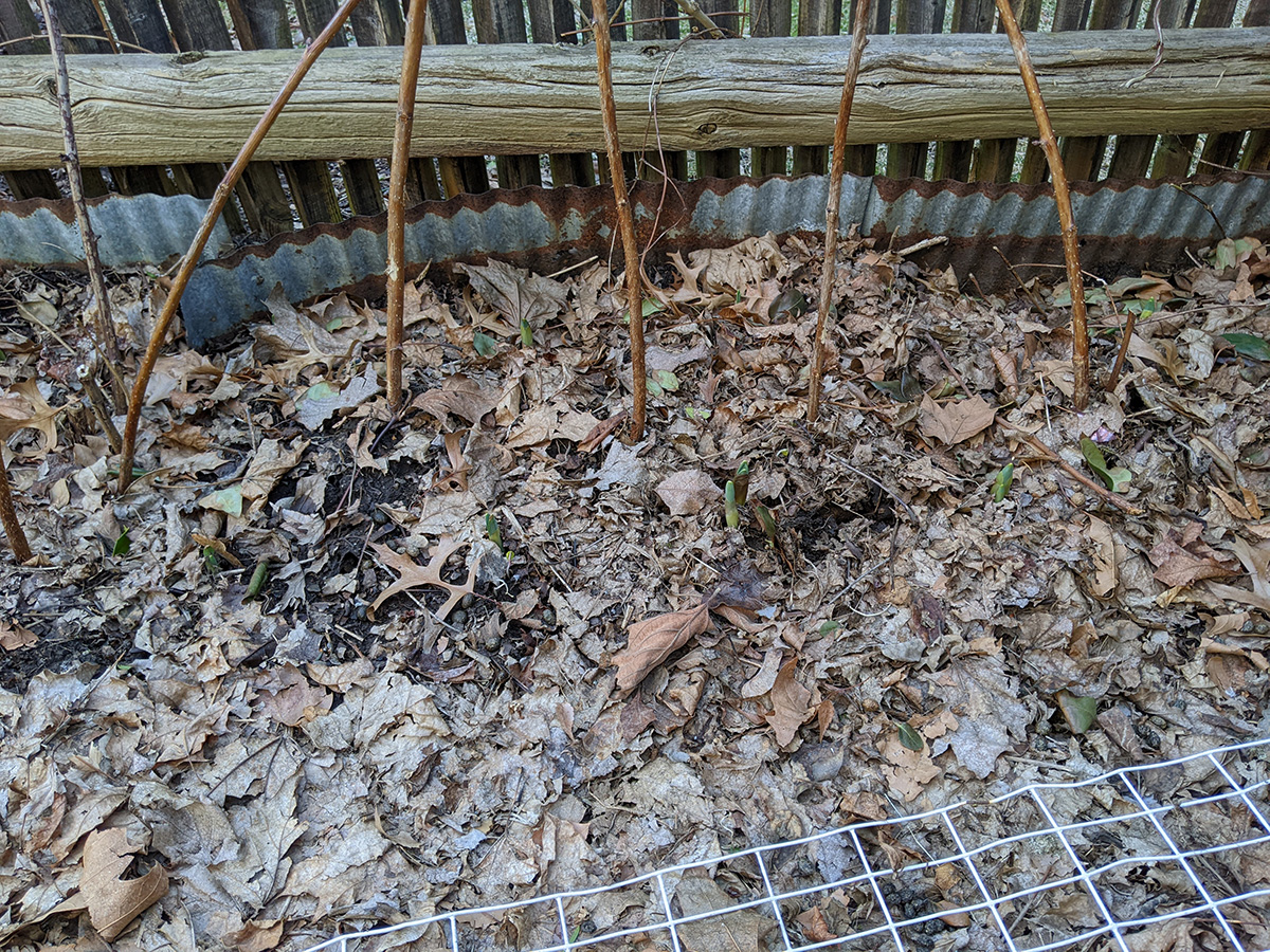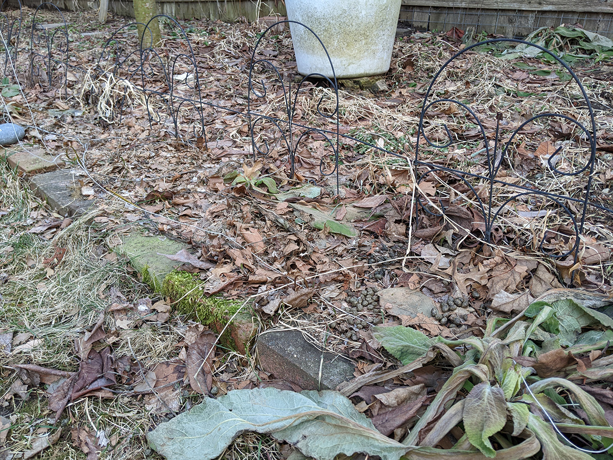 on the western side of the yard, perennial bulbs are starting to push out of the ground. the daffodils we divided and replanted in a long row are emerging. i saw saw some crocus leaves (though those need to be protected, rabbits love eating them). surprisingly, the daikons are still alive. they're totally not edible now, but even if i wanted to dig them up i can't as the ground is still frozen.
