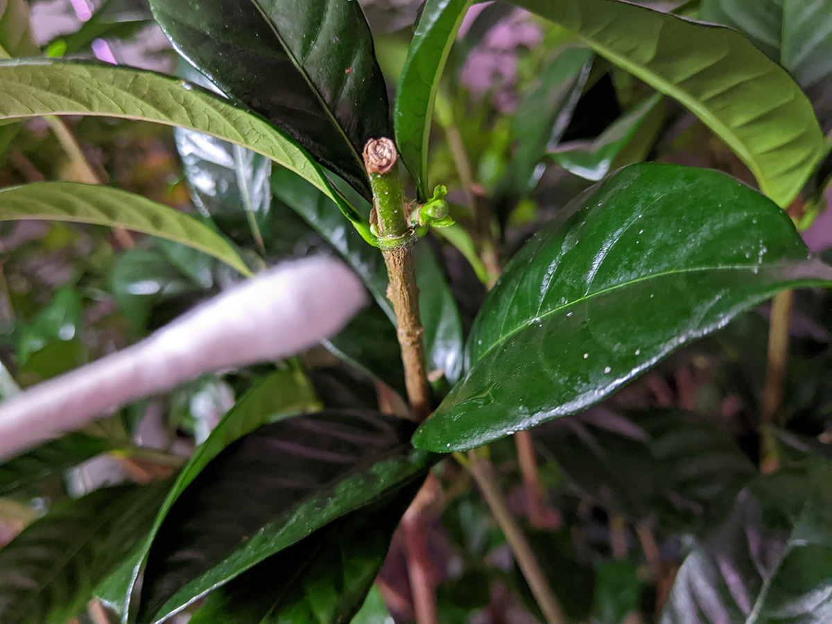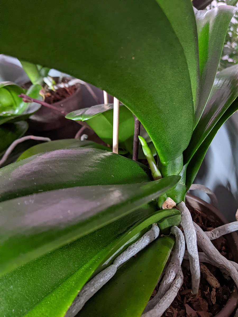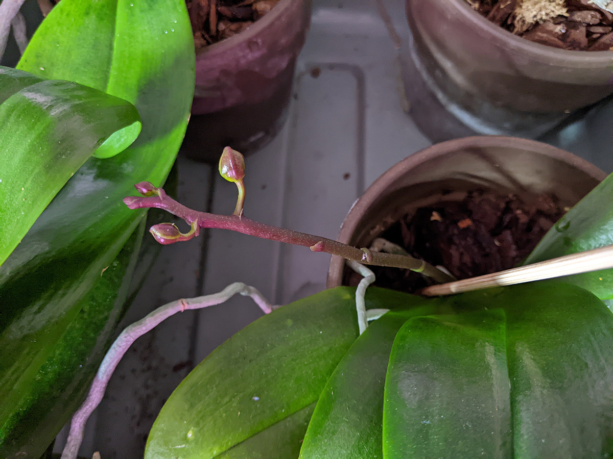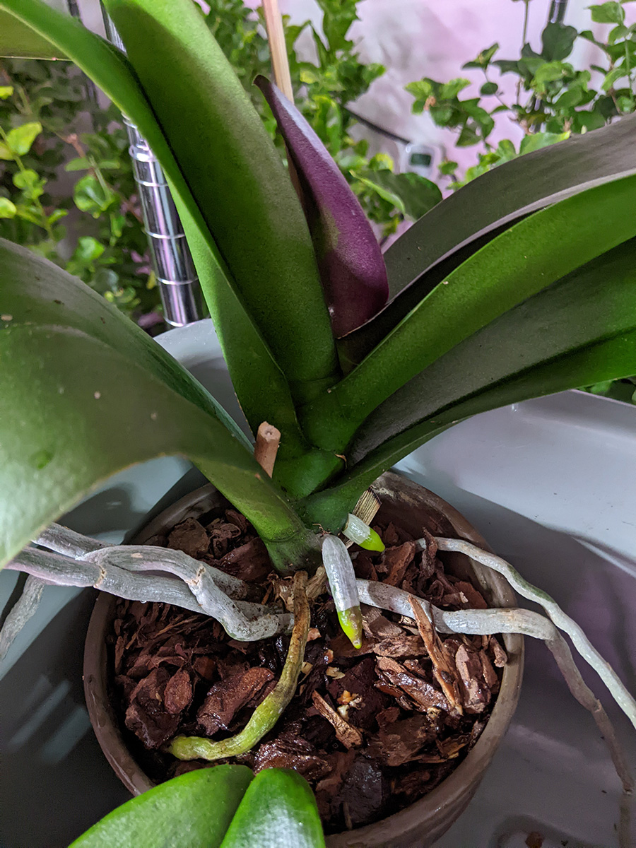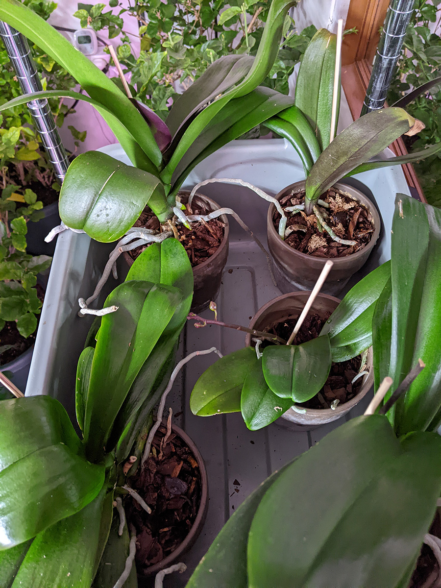 i went back down to the basement to water the orchids which i didn't do earlier. i made sue to put them back in their original spots, so the flower buds will all grow facing the same way. the one smaller orchid has been growing a flower spike for over a month now, while a larger plant is just now putting out a flower spike. the other 3 remaining orchids don't have flower spikes yet. i also inspected the gardenia, there was a few spots that were possibly mealybugs which i treated with alcohol-soaked q-tips. the mealybugs seemed a little dead though, i wonder if the systemic pesticide is actually working? or maybe they were old bugs that succumbed to spot neem oil spraying.