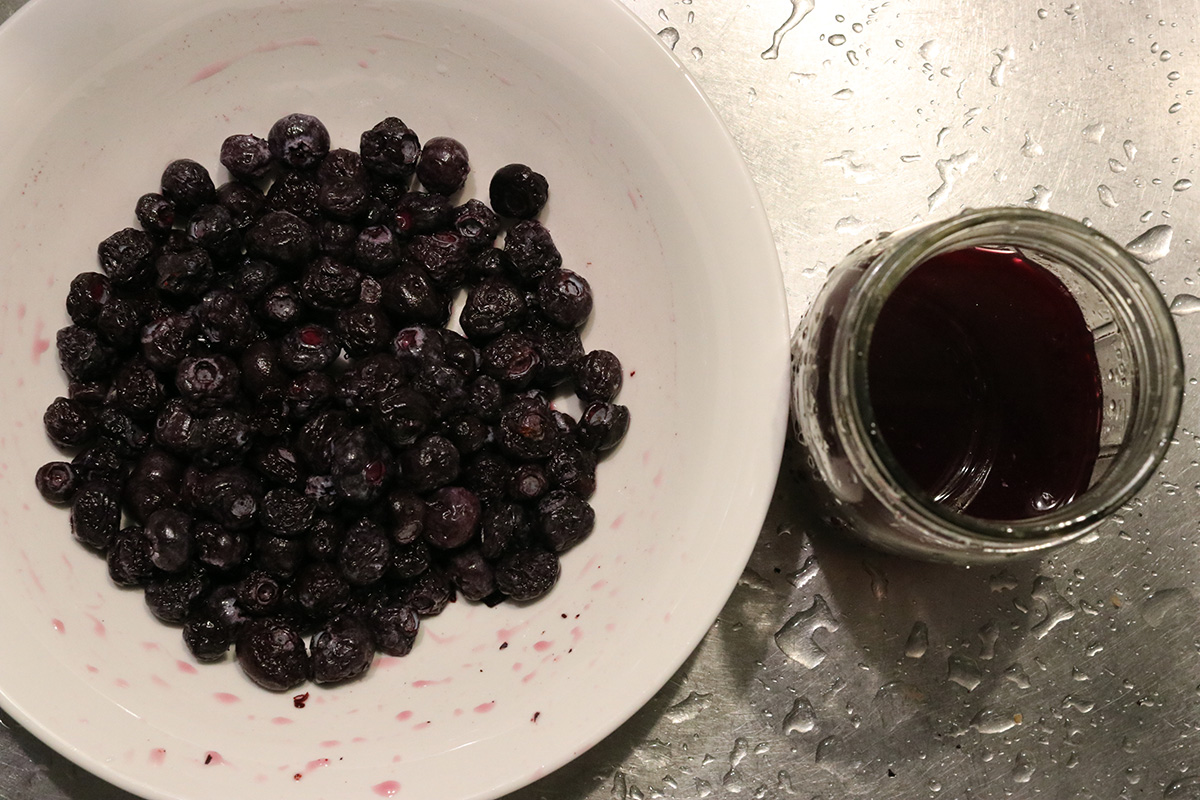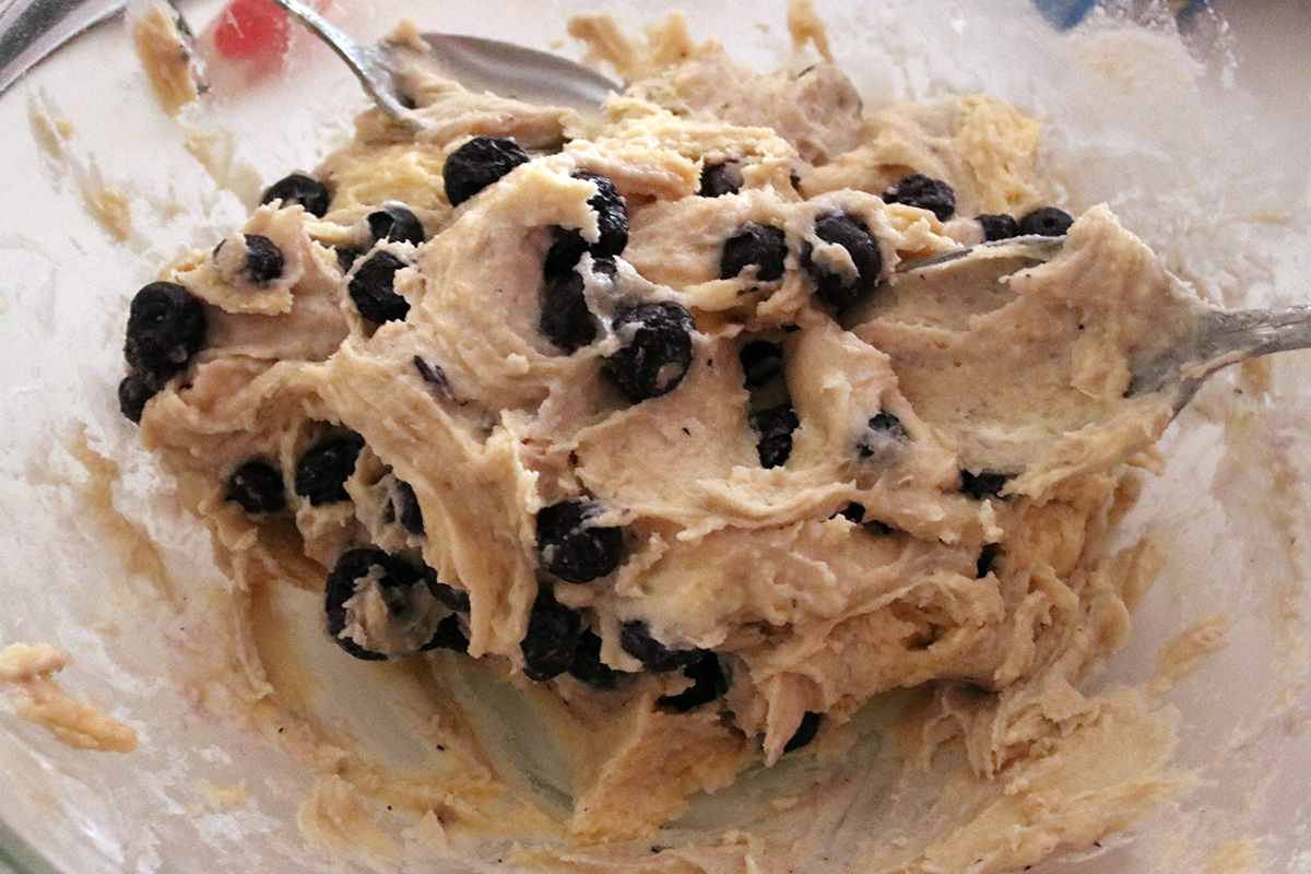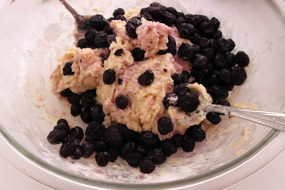 | thaw butter overnight. cream butter & sugar; add eggs, vanilla, juice; mix dry ingredients into batter 1/3 at a time, adding some half and half in between. mix in blueberries. spoon into jumbo muffin pan. top with sparkling sugar. bake at 425°F 10 min. 375°F 30 mins. + additional 10 minutes if necessary | |