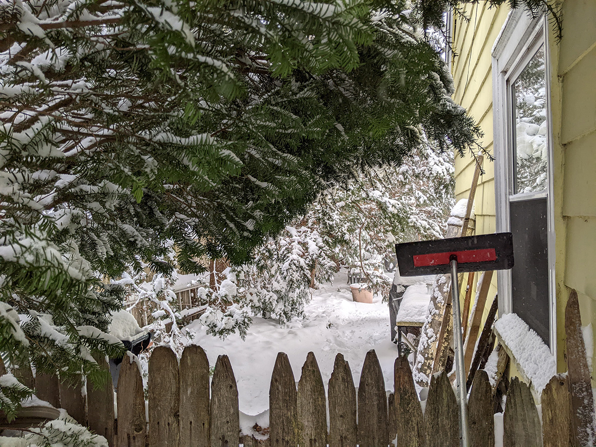 i went out to shovel shortly after watching the weather forecast, where they said the snow would transition to sleet and then refreeze overnight, so the sooner you can clear the snow, the better. don had already done his sidewalk. temperature was just a few degrees shy of freezing, so it was a wet heavy snow, the first of the season, where we've had light puffy snow. it was heavy to lift, but came off clean from the pavement, and easy to stack. i only cleared enough of the backyard to carve out a pathway to the trash, figuring i'd save the rest for steve and paul to shovel.