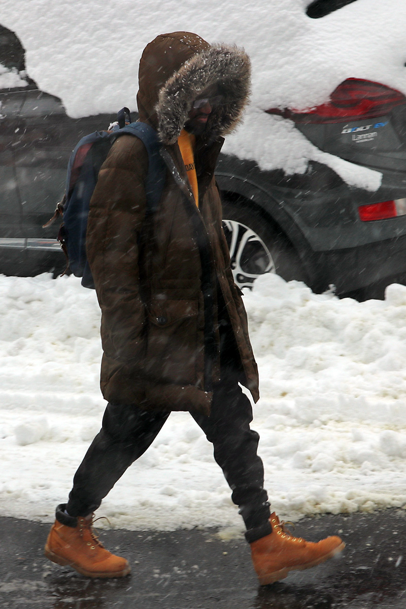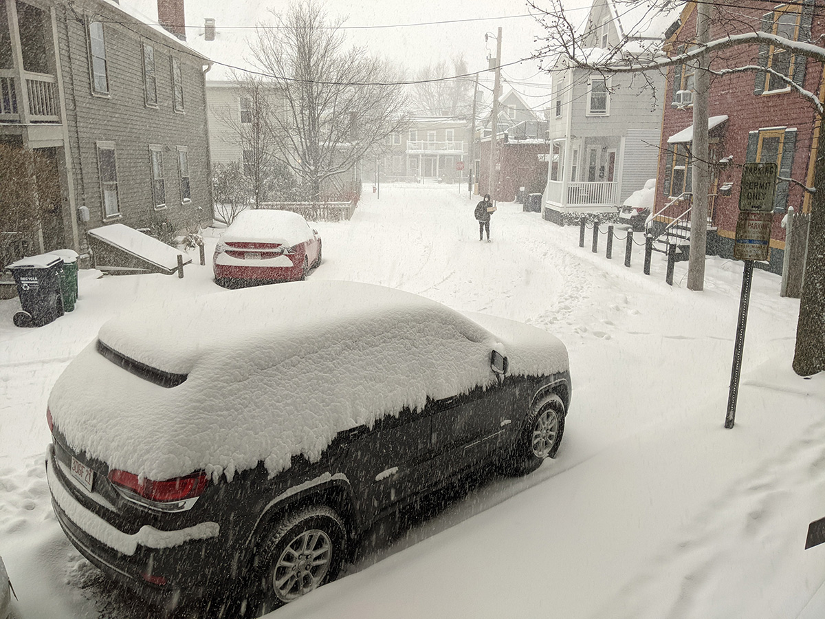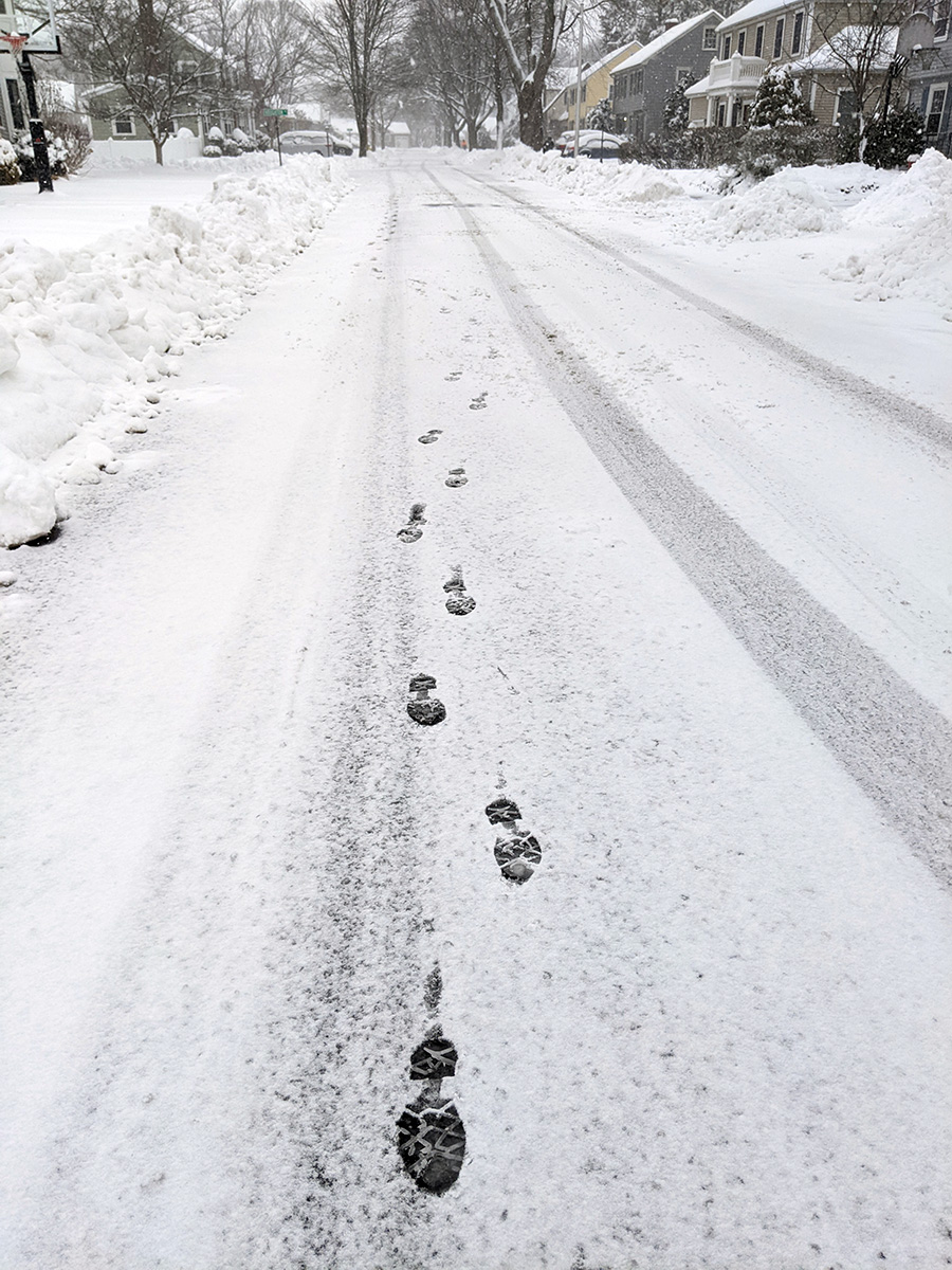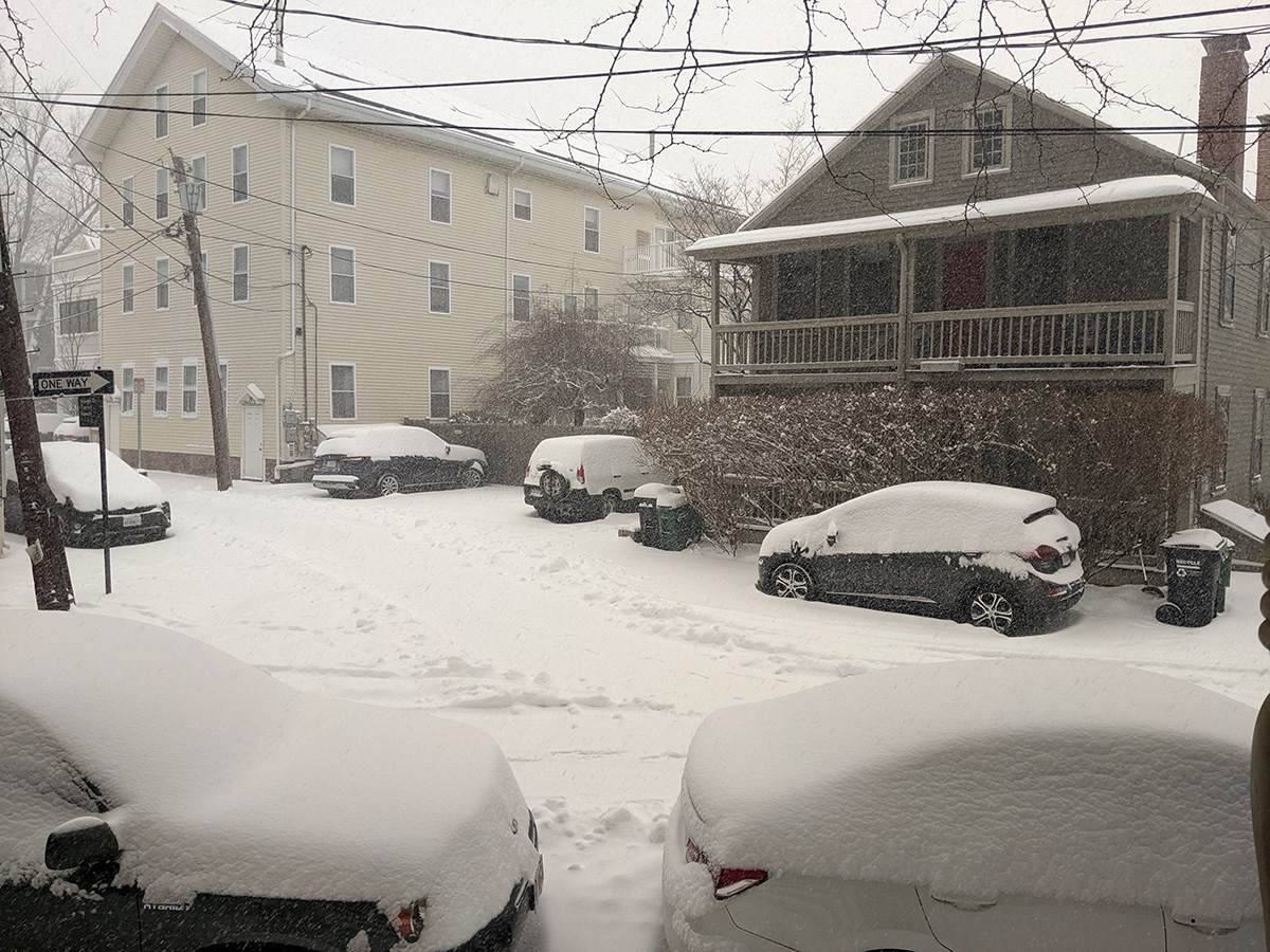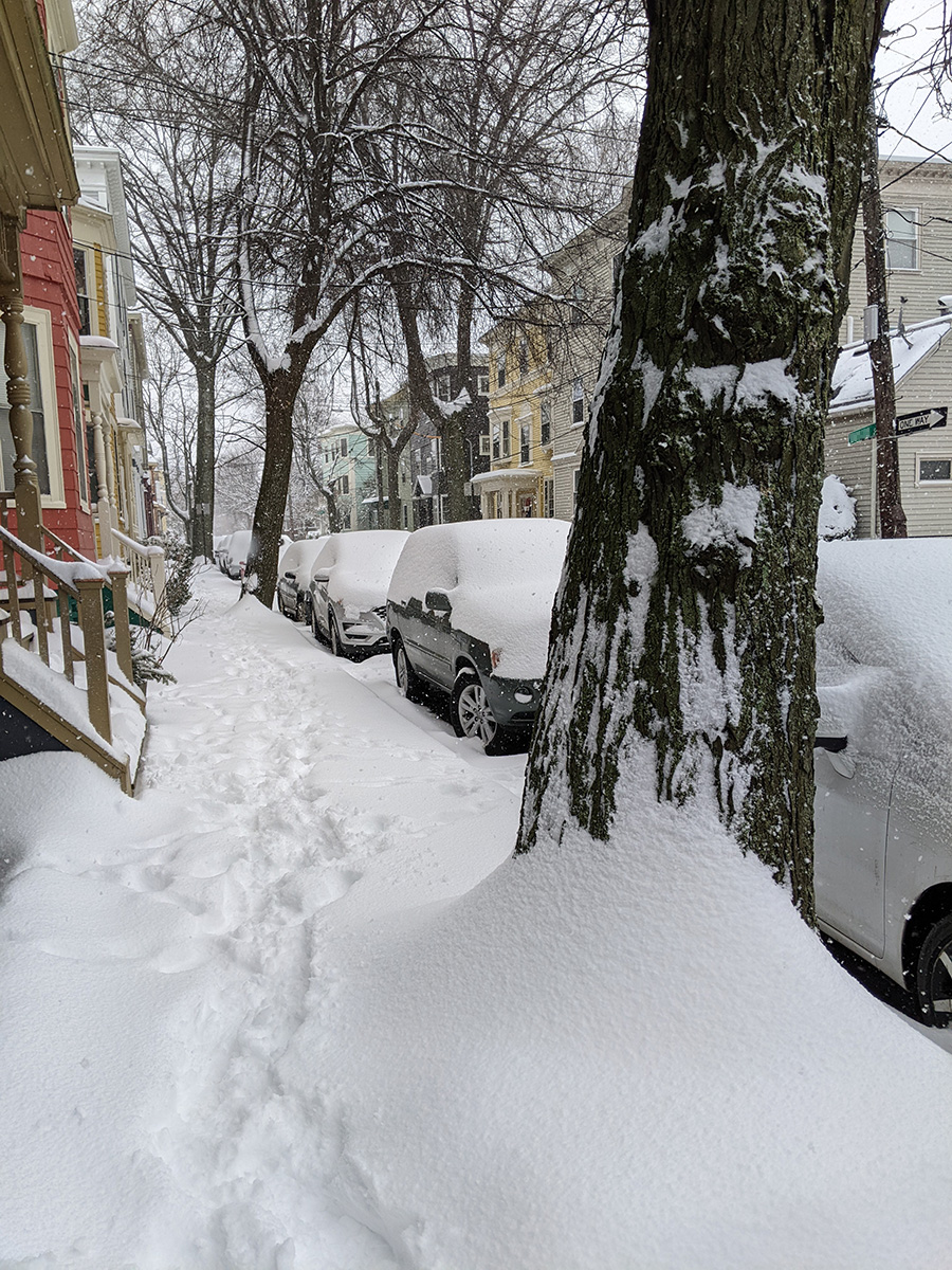 i left at 1:30pm, bringing a single blueberry muffin with me for my mother. most of the residential sidewalks weren't shoveled yet, so i walked in the streets, where it was cleared (down to pavement no less). when i got closer to lesley and harvard i moved back onto the cleared university sidewalks.