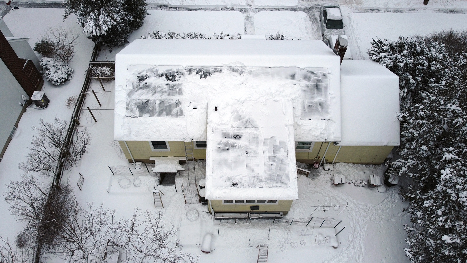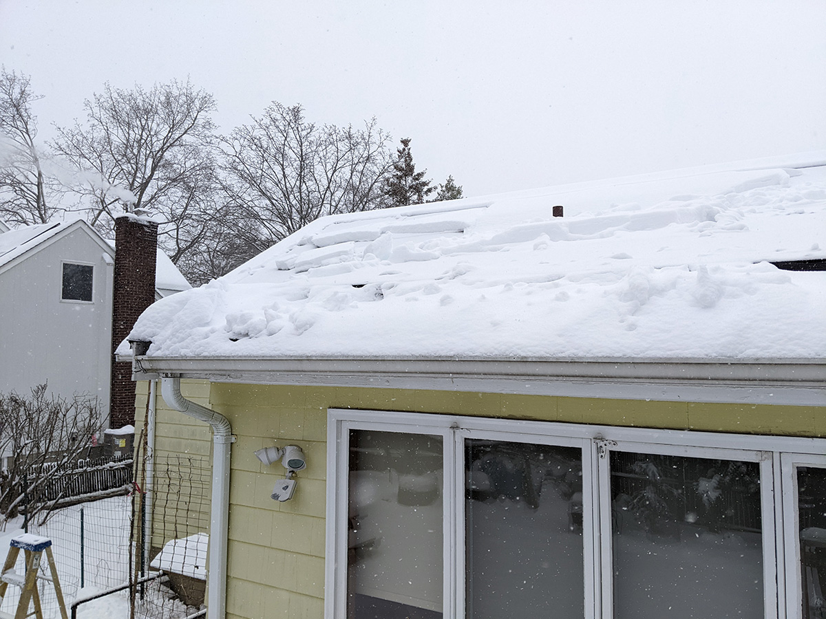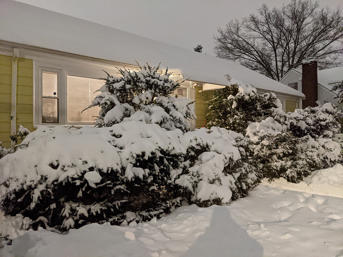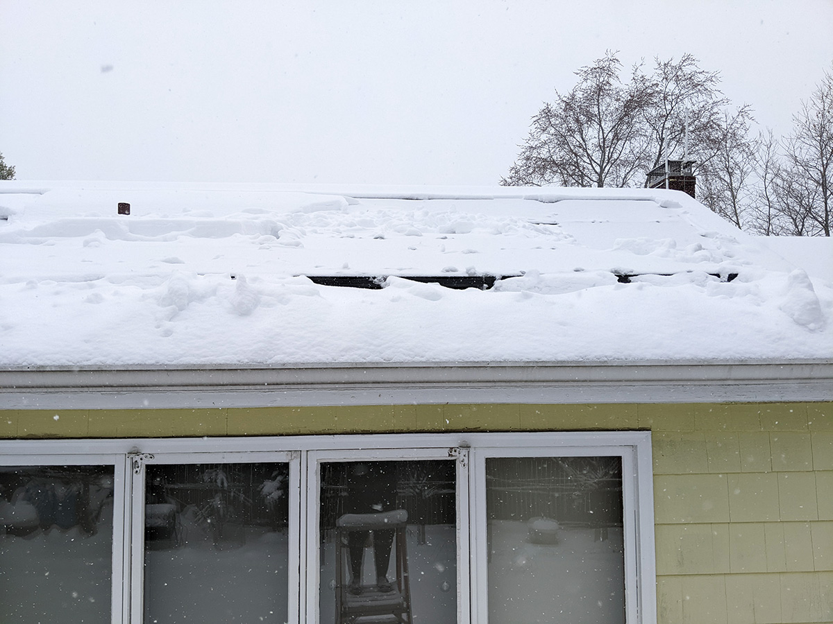 i immediately went out to the backyard to clear snow off of the solar panels. i didn't believe my father when he told me he'd already cleared 80%, but it was true. all that was left were a few upper sunroom roof panels, and a few main roof panels above them. there was also a few panels on the upper left of the roof that he couldn't reach with the stepladder-pole setup. unfortunately it had snowed enough since he cleaned the panels around noontime that everything now was reburied in snow. it was hard work, especially the layer of old snow, which was wet and heavy and now starting to freeze solid. it took me nearly 1-1/2 hours, and all i could do was push off as much snow as i could buried fresh snow would cover up the panels again. chances are we'd need to clean the panels again tomorrow morning, when the sun is shining and there's some melting.