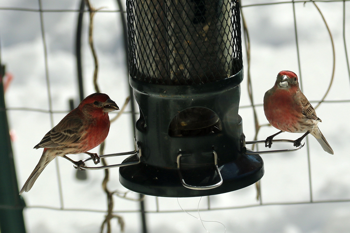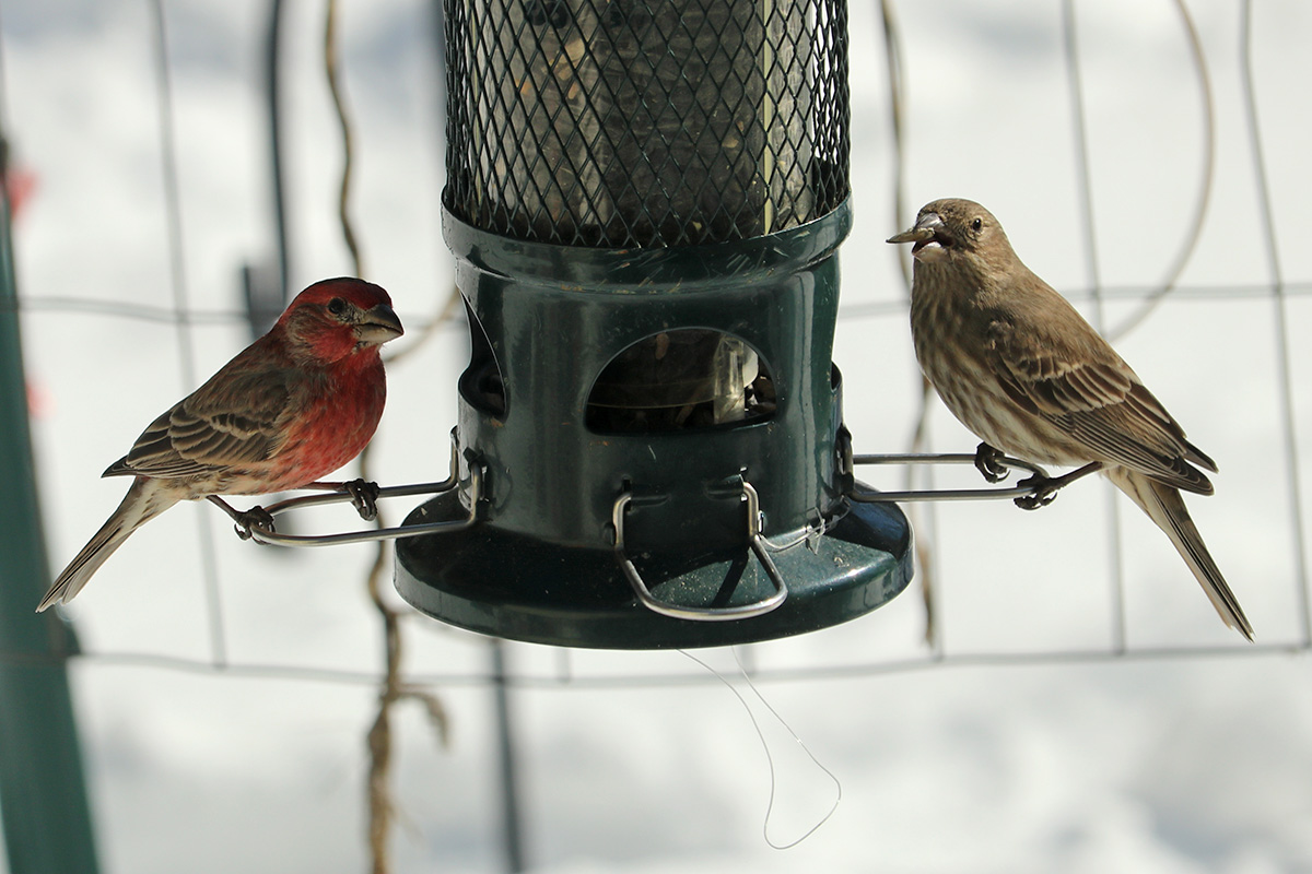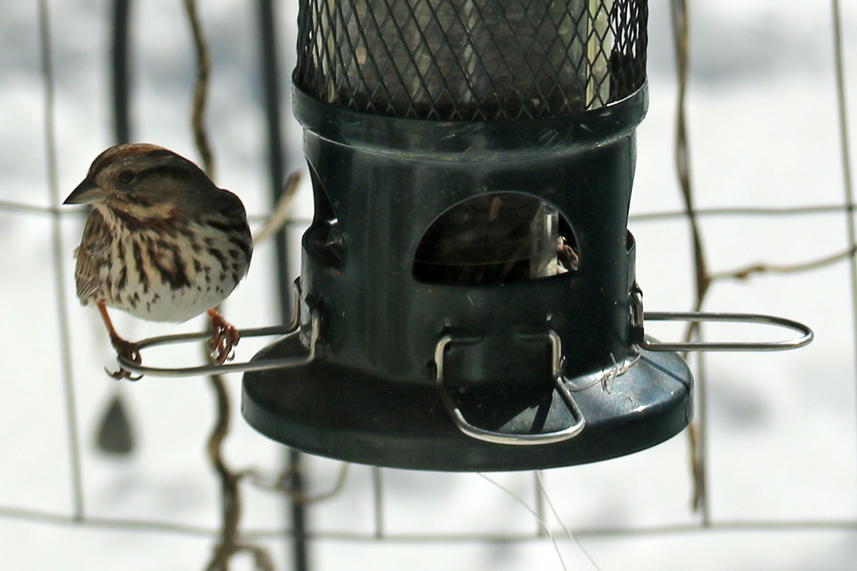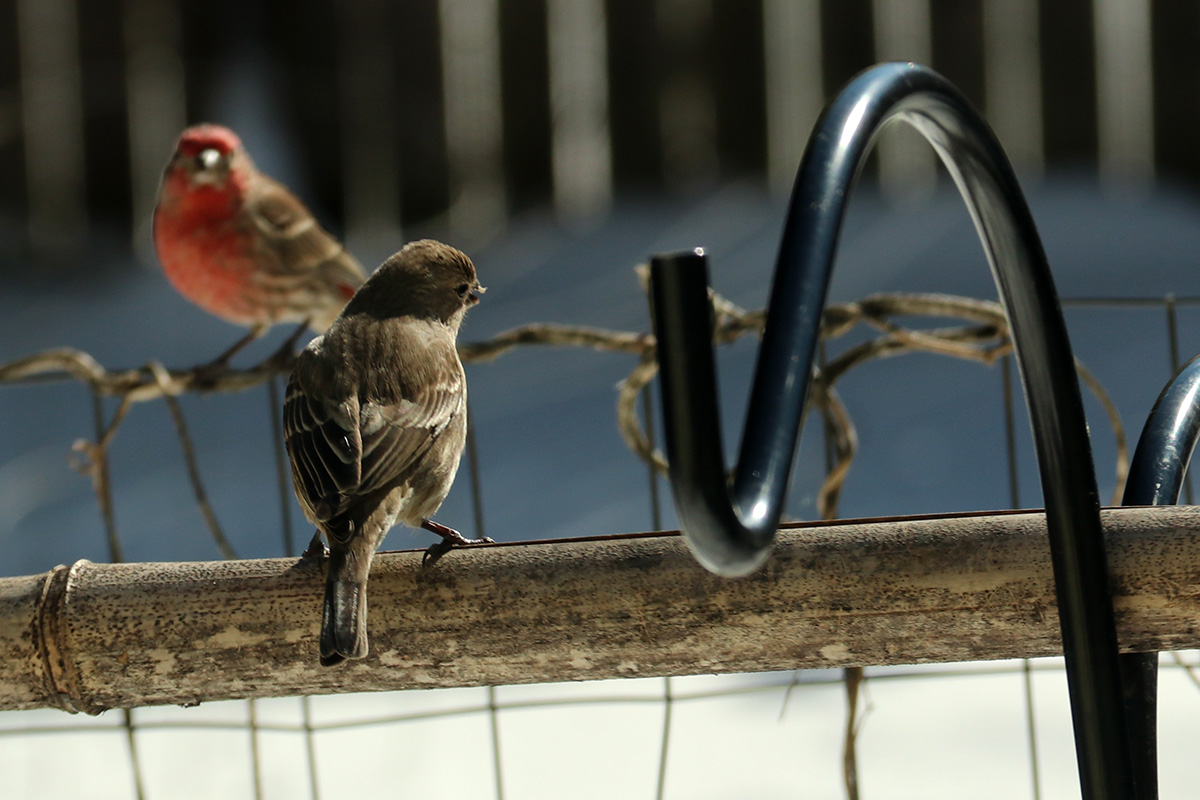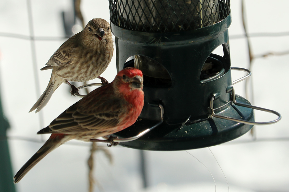 a lot of house finch activities at the feeders. there was also a lone song sparrow, which looked similar to a female house finch. there was also a pair of squirrels trying to get seeds from the feeder.