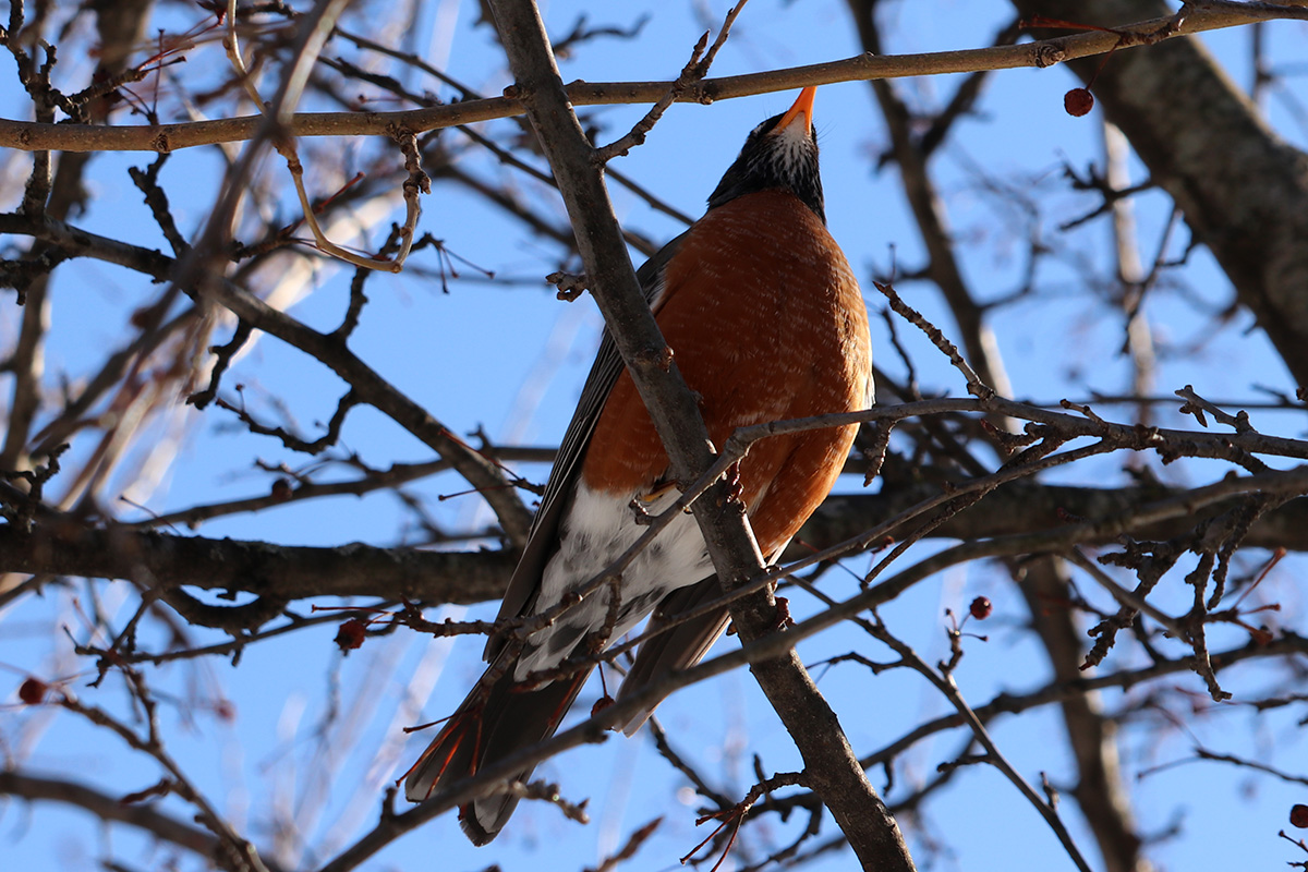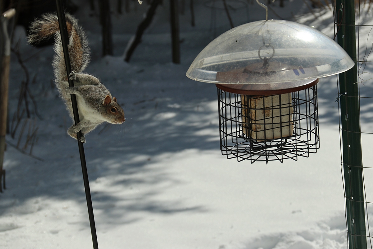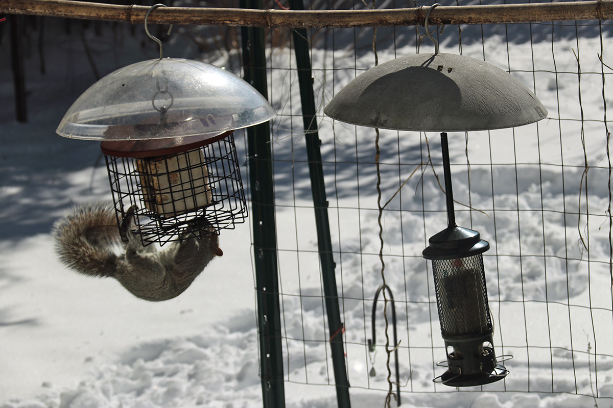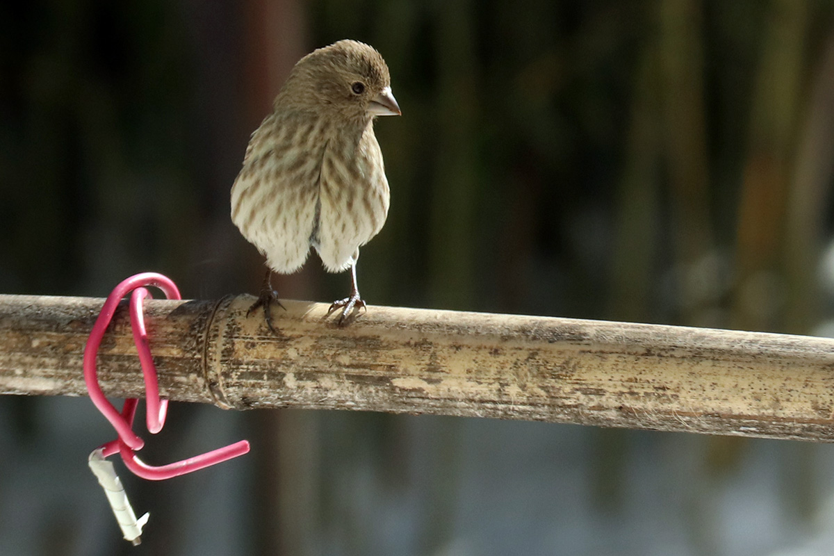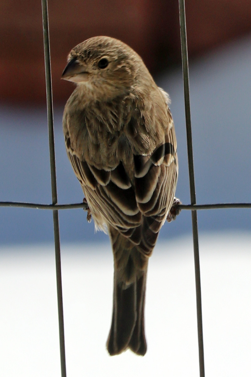 a lot of house finch activities at the feeders. there was also a lone song sparrow, which looked similar to a female house finch. there was also a pair of squirrels trying to get seeds from the feeder.