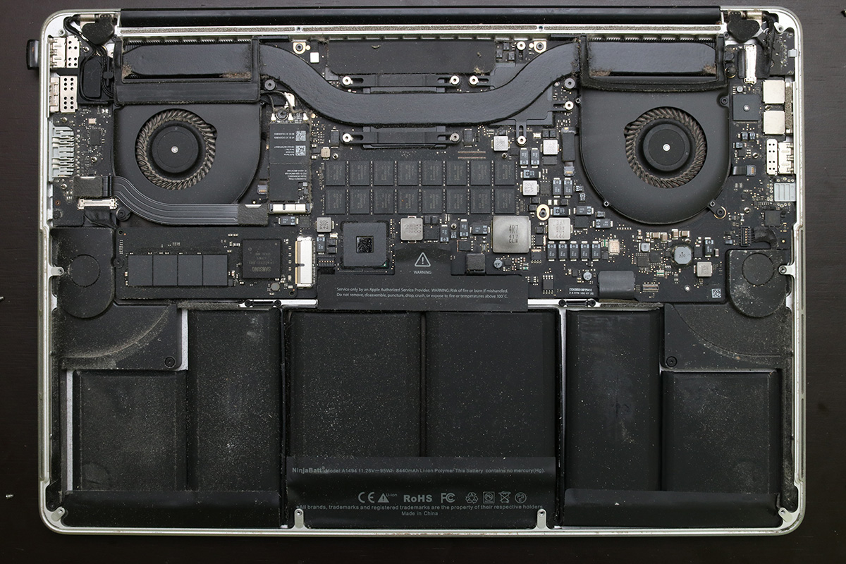 i opened up my macbook pro because it's been running hot and i thought maybe there was something wrong with the battery (like expanding cells) because i can only use it for 1-1/2 hours before it needs to be recharged. but the cells look fine, it was just super dusty on the inside. i blasted it with compressed air and put the machine back together again, hopefully it'll run better now.