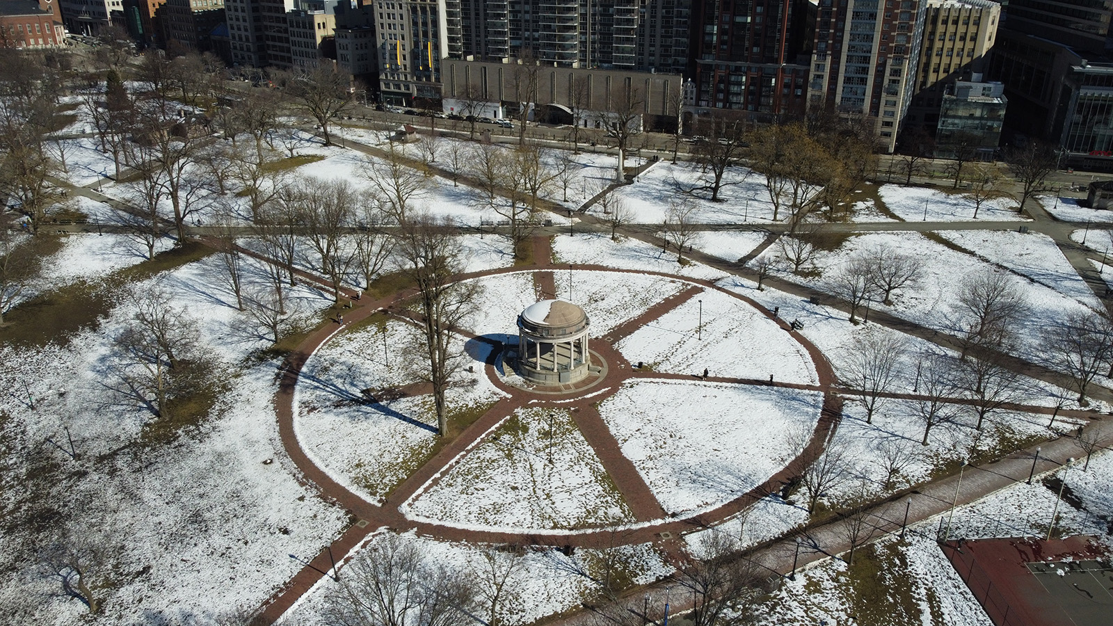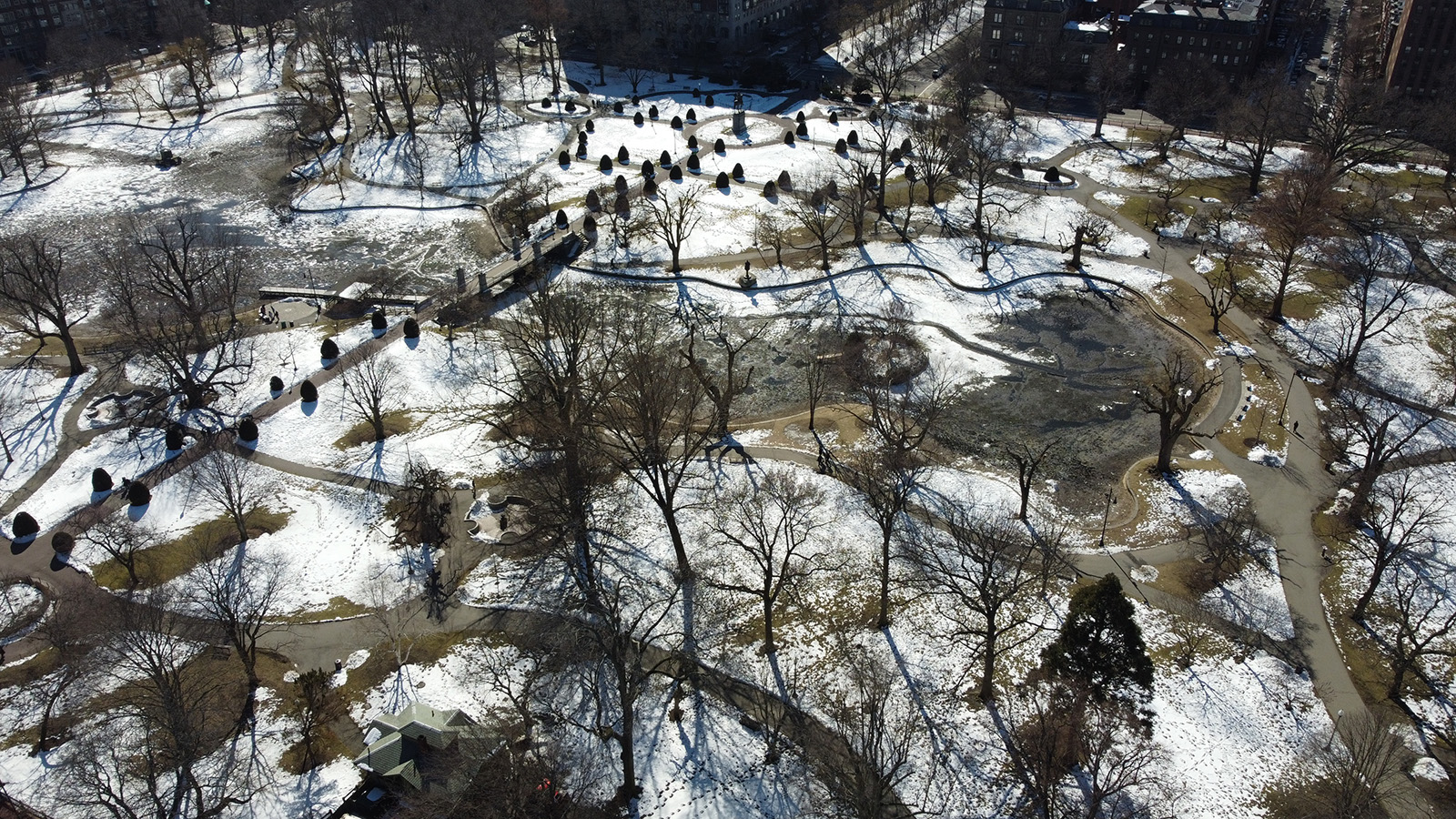 i headed to chinatown via a new route, one where i crossed boston common after coming out from charles street, and then down tremont street directly to c-mart/ming's market. while riding through boston common, i realized it was the perfect place to fly the drone. i found an empty park bench (around the rotunda) to lean my bicycle against, then quickly unfolded the drone and set up the remote and had the drone in the air in a matter of seconds.