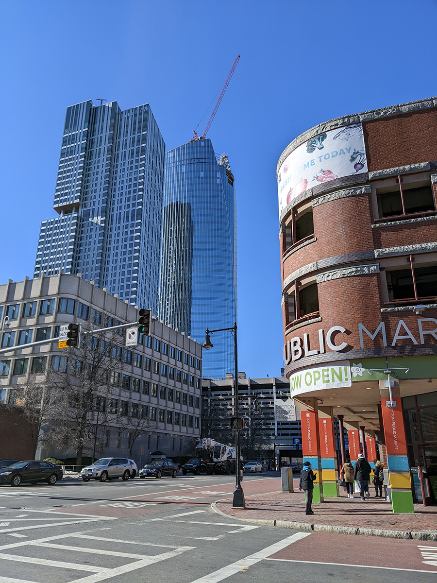 i left by 1pm, the temperature hovering around the lower 30's, blue sky and bright sun. the one advantage of the cold weather was there wouldn't be a lot of people outside, which made it perfect for drone flying. i'd already gotten the zone clearance for boston flying last night, and had two places in my mind where i could potentially launch: in the parking lot next to c-mart (where i've flown before, and also the last time i biked to chinatown, more than a month ago), and on the esplanade directly north of copley square.